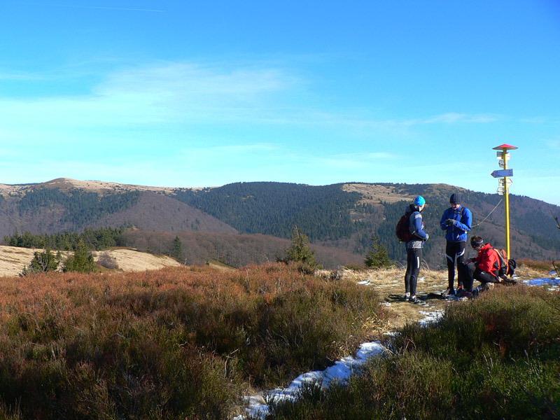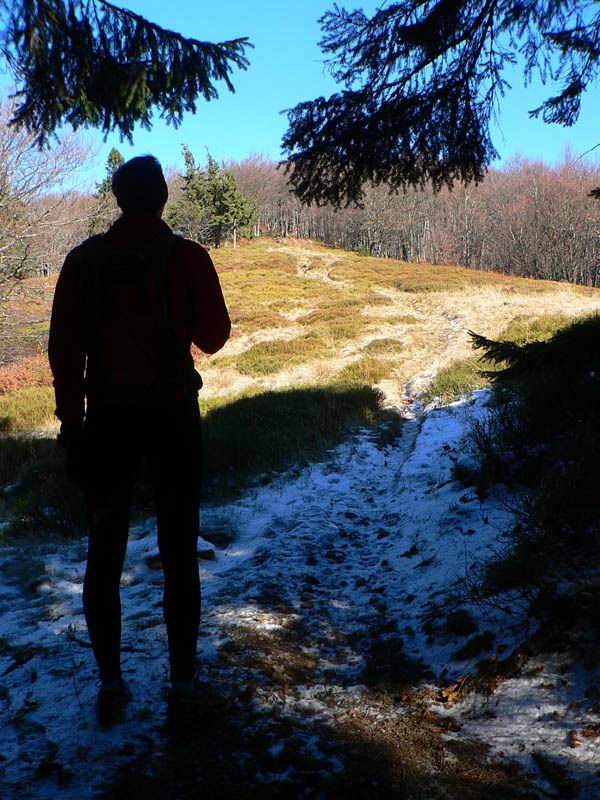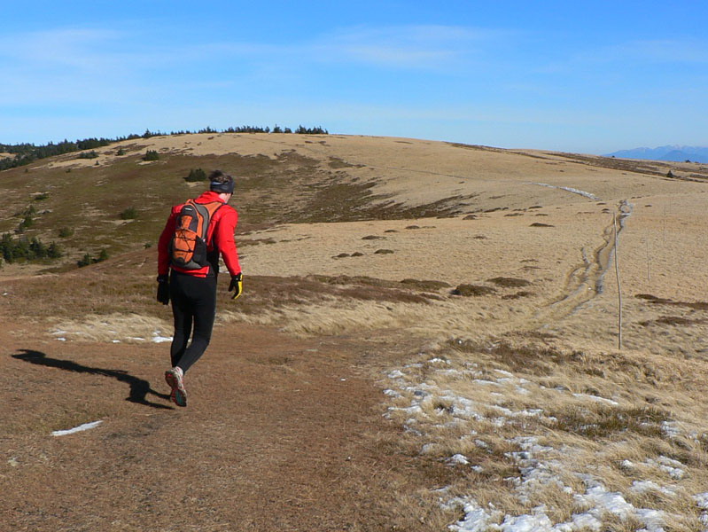 Ďalej je taký úsek bez výhľadov, krátke zbehy a výbehy, záveje lístia pod nohami, sem tam snehom zafúkaný chodník, ale ruksaky aj keď malé, predsa akosi oťažievajú. Brucho ma bolí! Mňa nohy! Somár, jasne že aj tie! Beh sa čoraz viac podobá na chôdzu. Kde sú tí dvaja? Na Hornej lúke, nervózne poskakujú, vraj ich to nebaví tak dlho čakať. No teda! Vraj poseďte, my by sme už išli, veď už to nie je ďaleko, v chate sa stretneme! Zbabelci, utekáte čo? Sa bojíte že vás dáme že? Aby sme nevideli ako si to skrátite že? Posedeli si a nám nedoprajú oddychu, no pekne. Tak sa aj my po chvíli poberáme svojim „skúseným“ tempom, ešte nevyhnutná pauza v kríkoch a o chvíľu sme na Veternom. Fučalo celú cestu, tu nás to ale z hrebeňa chce odhodiť. Nevadí, kúsok ďalej je už cieľová rovinka v kosodrevine, tam je kľud. Z predposledných síl naťahujeme trasu až k vlekom, oni to isto skrátili po ceste! Ešte dolu po zjazdovke, kdeže to nasiali vlekári tú pšenicu??? A konečne cieľová páska, teda dvere do krčmy. A tí dvaja sa tam škeria od kapustnice. A vraj neskrátili, tiež išli až k rotunde, no nezabiješ ich?