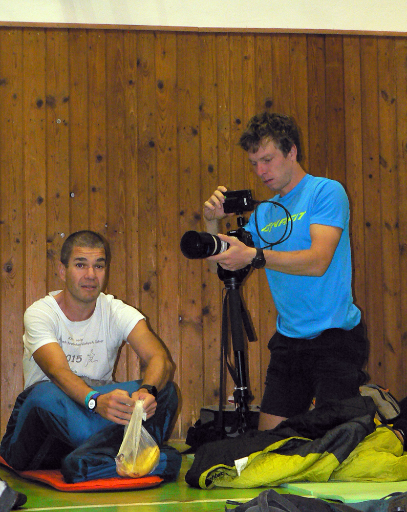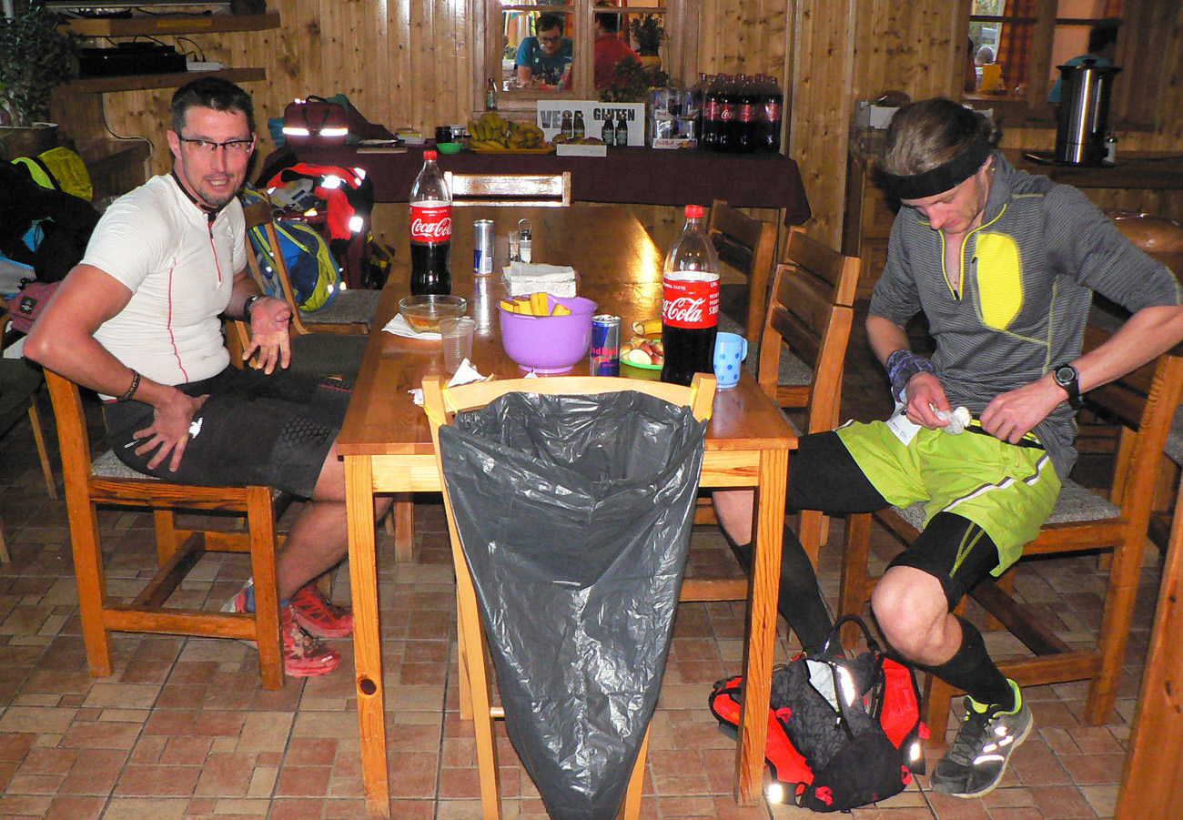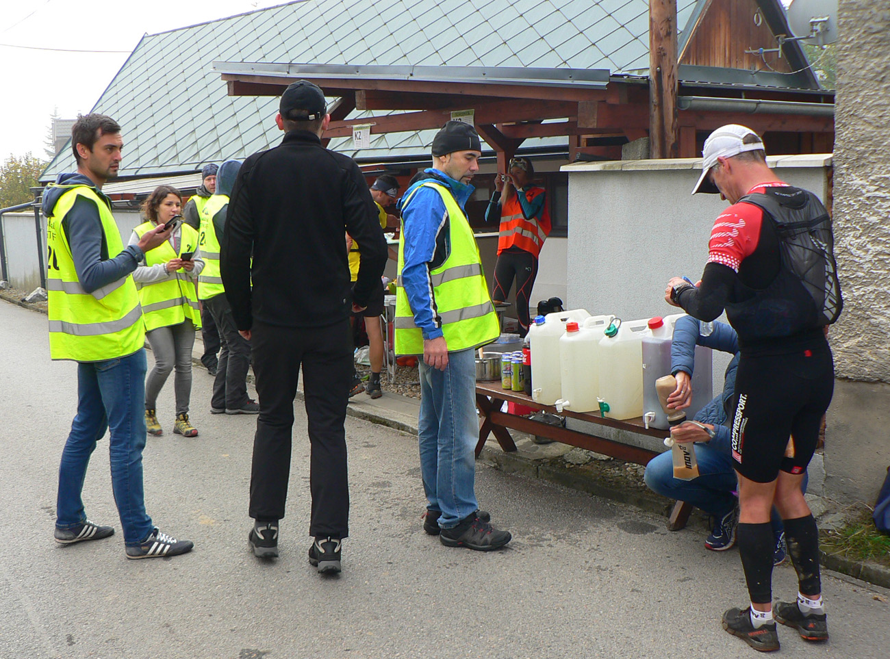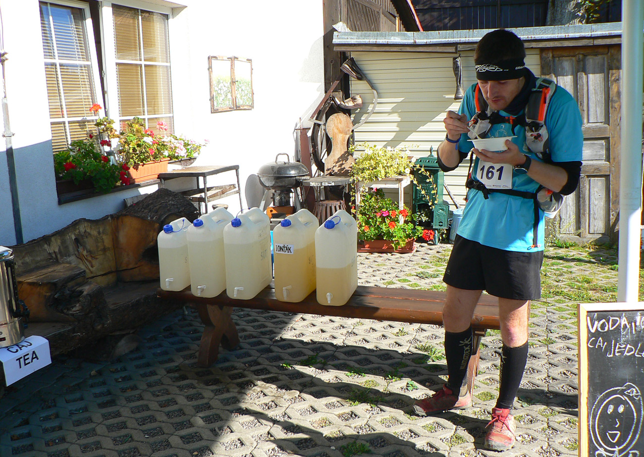 NAJLEPŠIA tajná kontrola na trase nás vykrmuje, aby sme mali sily na ten strmý vyerodovaný žľab, čo sa tvári ako cyklotrasa. Ozaj super na bajk... Ale potom krásny, behateľný hrebeňový úsek cez K5 (hotel Fran) na K6 (Portáš), len to slnko priamo do tváre, no fuj! Chcelo by to šiltovku. Musím si dobre nadbiehať a fotiť ľudí spredu, aby som mal svetlo do chrbta. Ale zatiaľ vládzem. Za Stratencom už je chodník viac v lese, slnko už tak nevadí. A na Portáši nachádzam sedieť Mikiho, ktorý už mal niekde pred cieľom brzdiť. Dokuľháva aj Matej Oravec a o chvíľu Ivana Líšková s badygárdami. No, ste sa tu dobrá partia zišli...