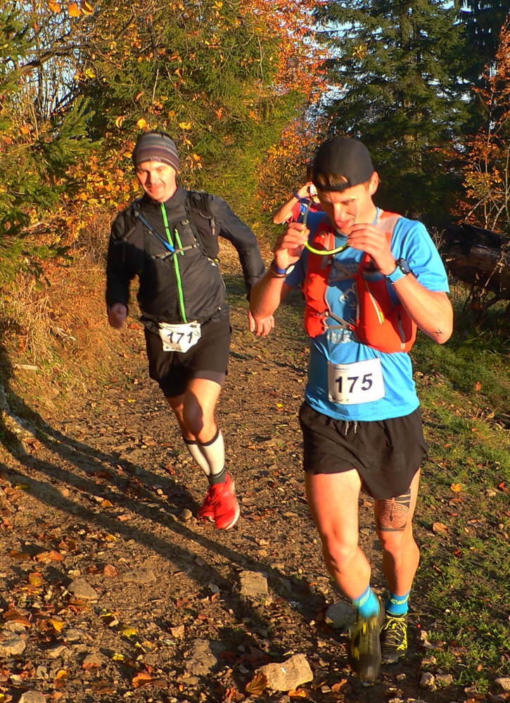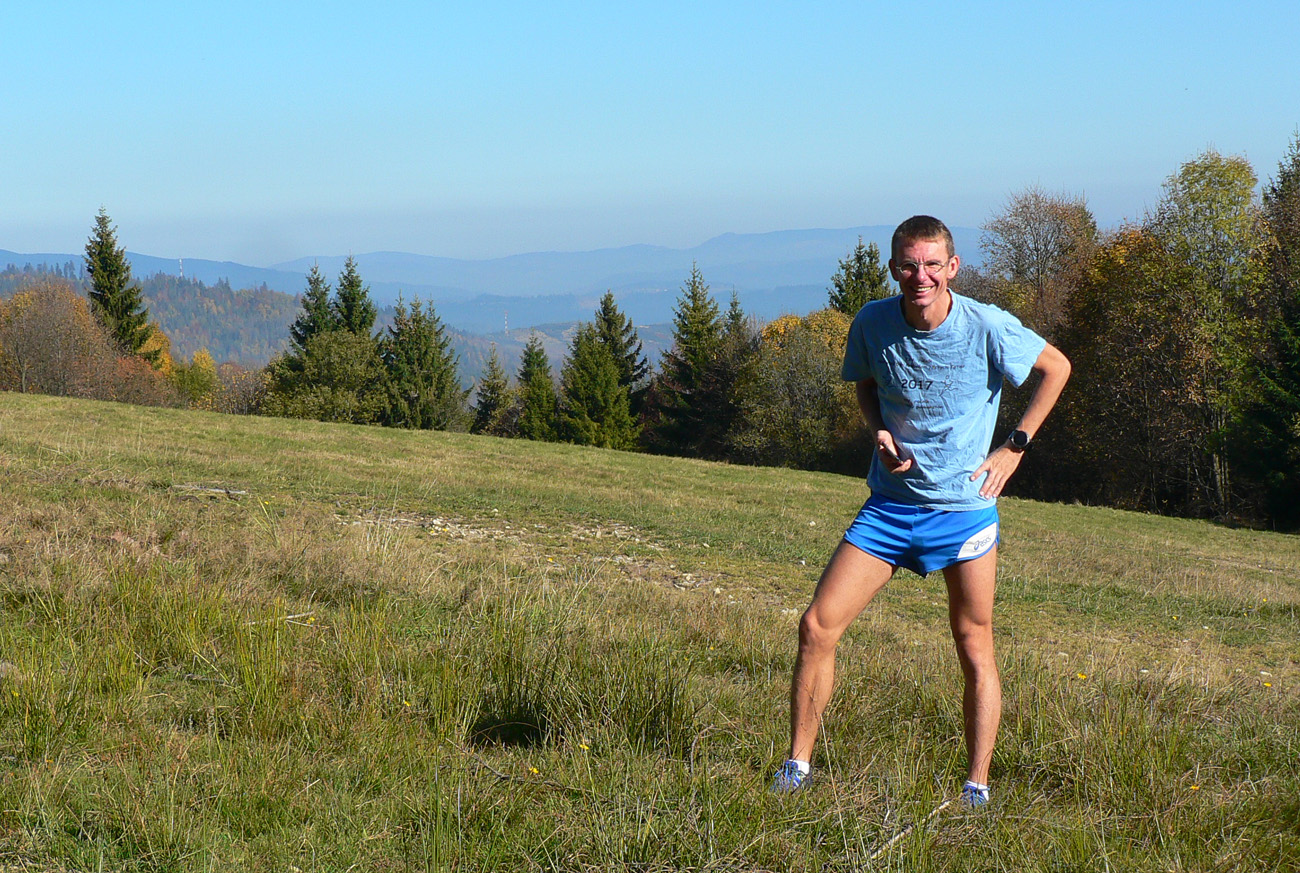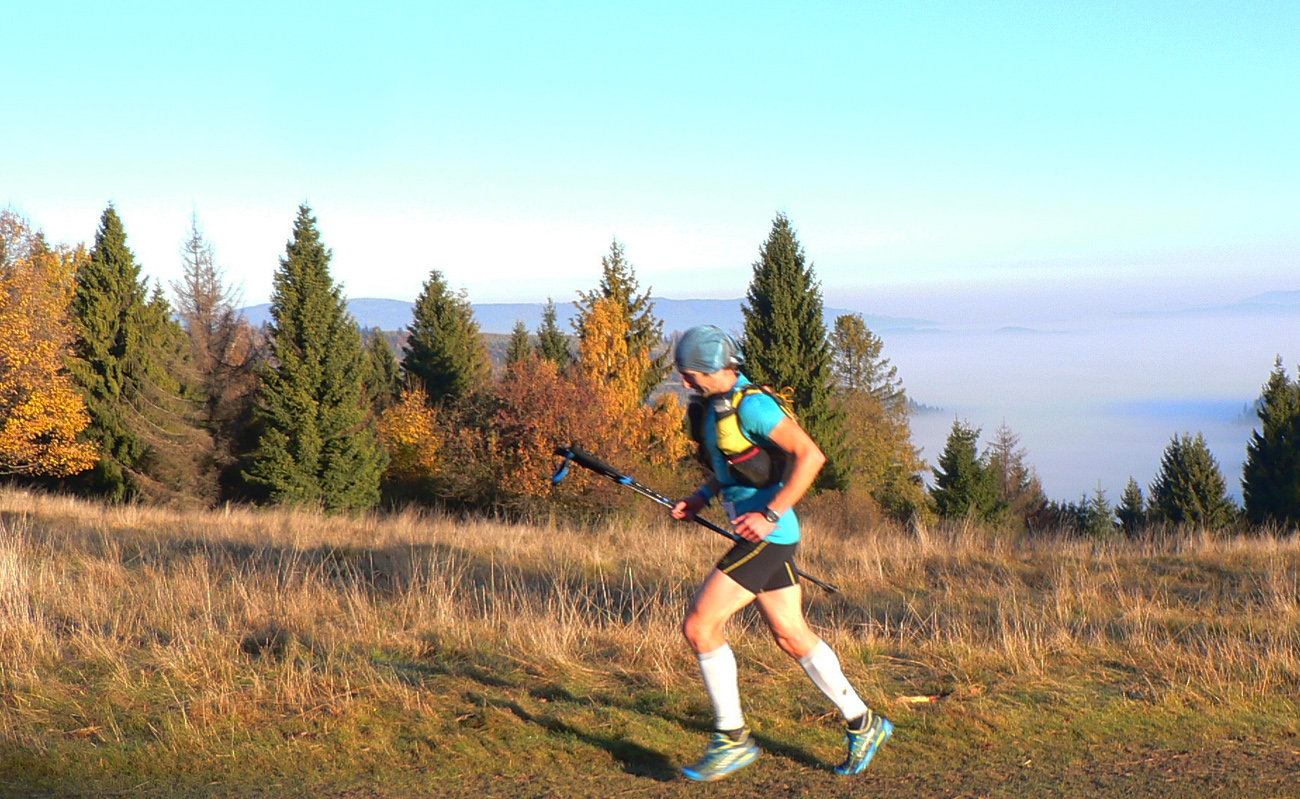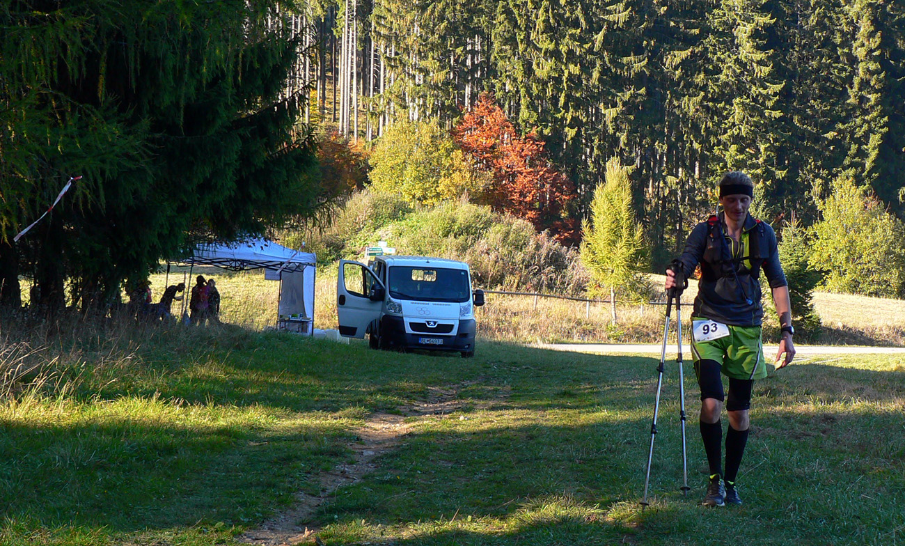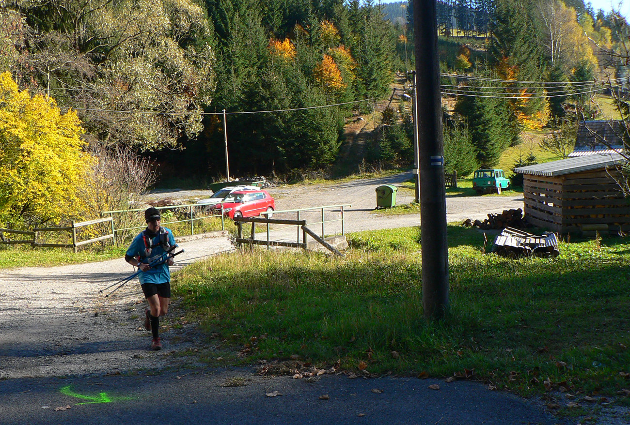 Rastúci šuchot som ráno sledoval už od piatej, pred siedmou sa to všetko začalo trúsiť do hnusnej vlhkej hmly smerom k námestiu. Tam už Náčelník udeľoval cez megafón dobré rady typu „po výbehu z mesta držte sa fáboriek a elektrického ohradníka.“ O pol ôsmej sme boli vystrelení hore sídliskom, domáci akoby si už zvykli – pekne uhýbali a niektorí aj zafandili. Čelo vykecávalo v pohodovom tempe, tak som chvíľu stíhal, ale fotky aj tak nič moc, až nad hmlou. Končila nevysoko, hore raj. Začalo nádherné behanie cez osady, rôznofarebné lesné tunely, lúky s výhľadmi a sem – tam aj s ovečkami, no jednoducho gýč... Jasné, že aj megakaluže bolo treba poobchádzať a pomedzi hnusné rúbaniská sa premotať, ale to len zriedkavo.