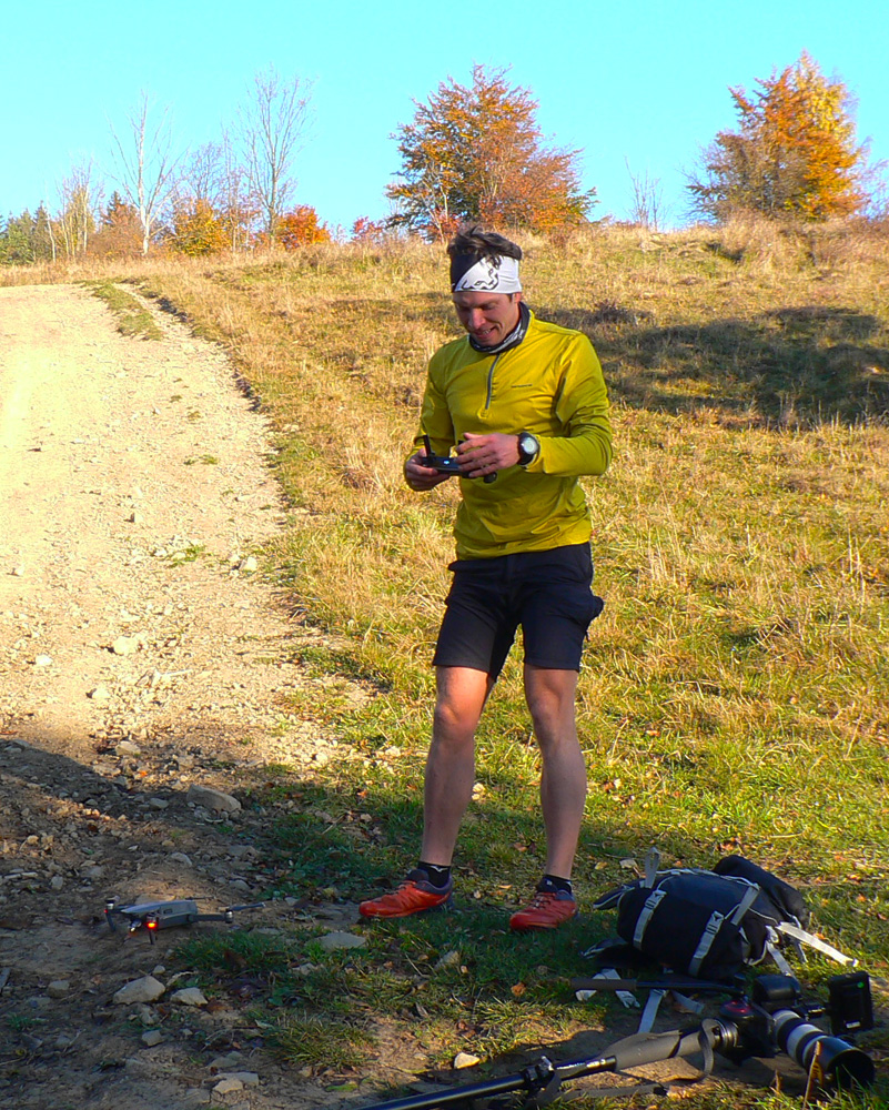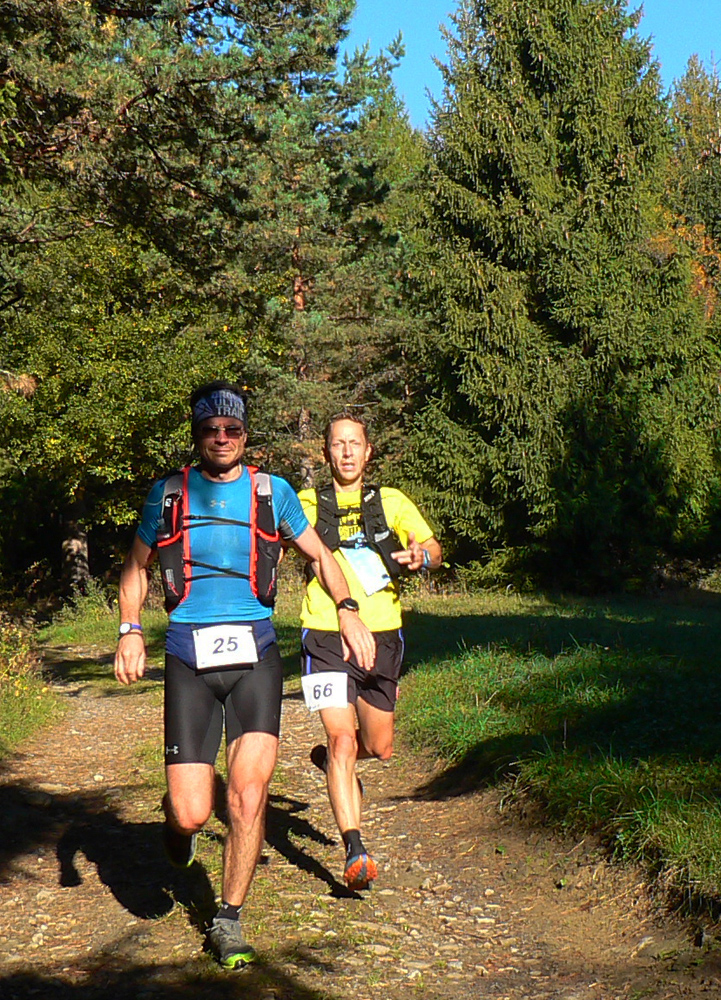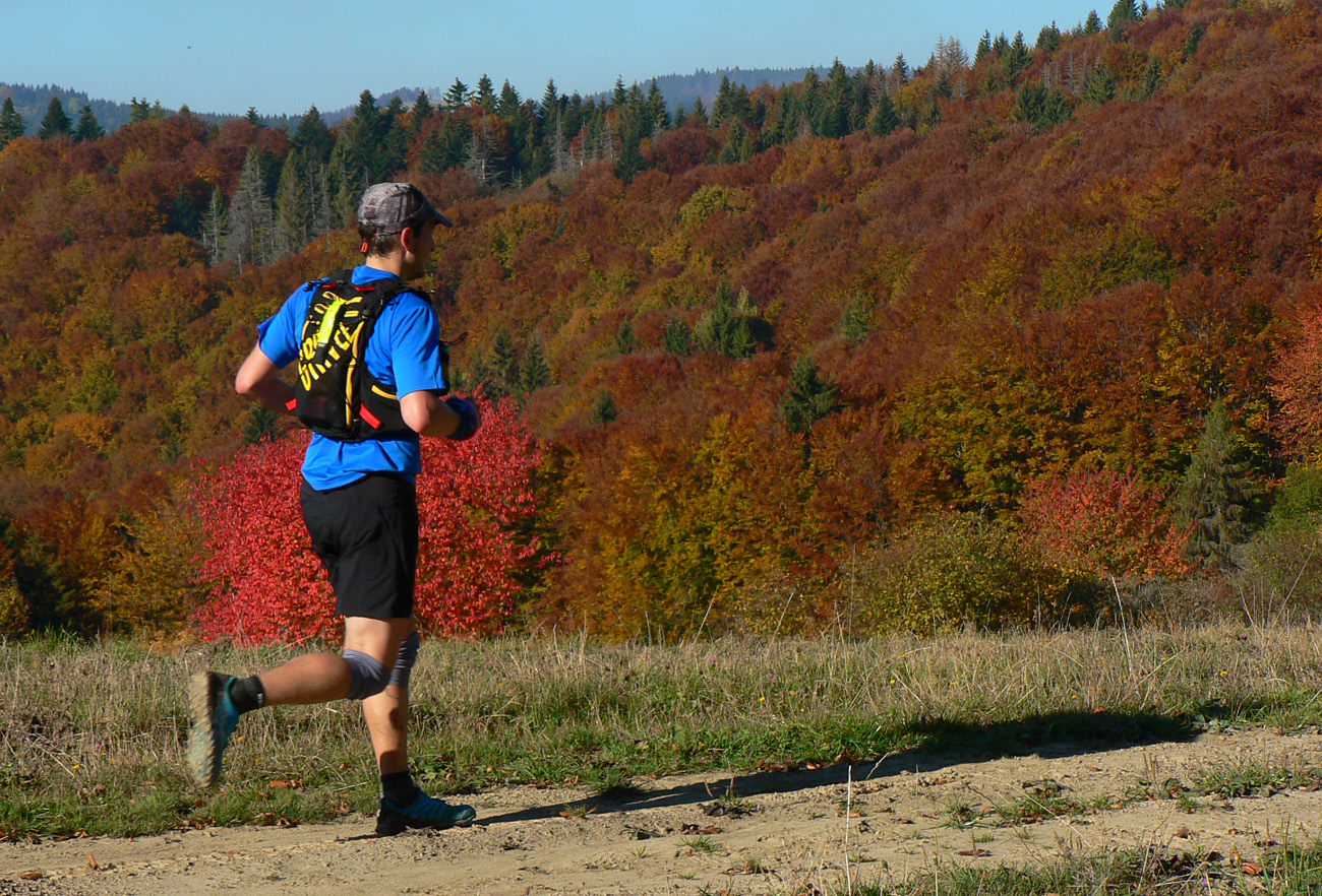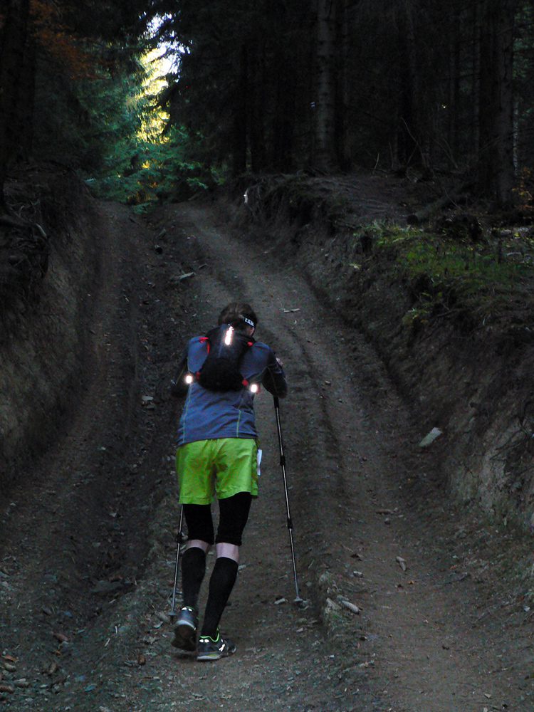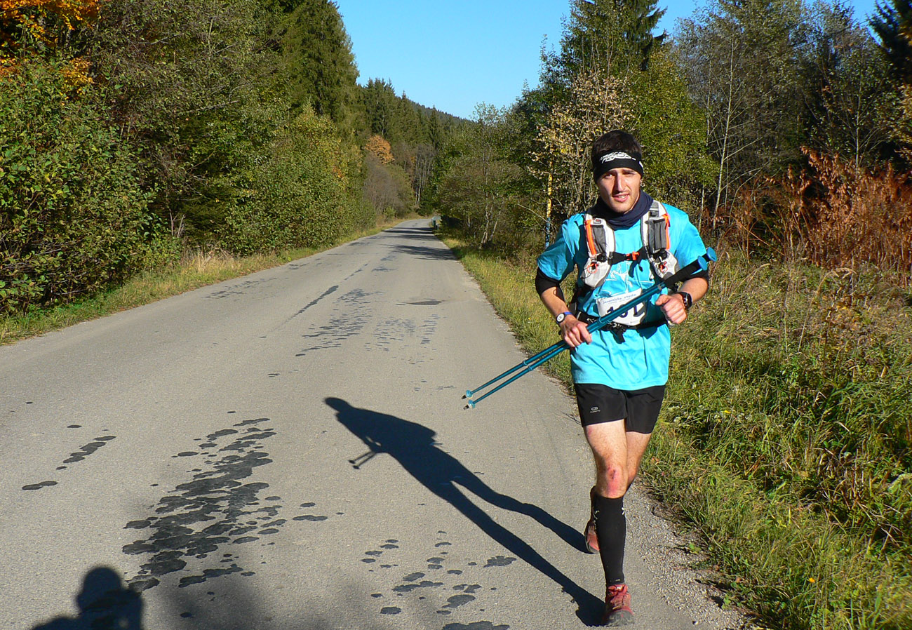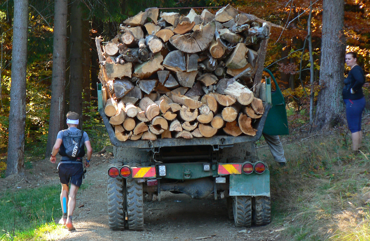 Rastúci šuchot som ráno sledoval už od piatej, pred siedmou sa to všetko začalo trúsiť do hnusnej vlhkej hmly smerom k námestiu. Tam už Náčelník udeľoval cez megafón dobré rady typu „po výbehu z mesta držte sa fáboriek a elektrického ohradníka.“ O pol ôsmej sme boli vystrelení hore sídliskom, domáci akoby si už zvykli – pekne uhýbali a niektorí aj zafandili. Čelo vykecávalo v pohodovom tempe, tak som chvíľu stíhal, ale fotky aj tak nič moc, až nad hmlou. Končila nevysoko, hore raj. Začalo nádherné behanie cez osady, rôznofarebné lesné tunely, lúky s výhľadmi a sem – tam aj s ovečkami, no jednoducho gýč... Jasné, že aj megakaluže bolo treba poobchádzať a pomedzi hnusné rúbaniská sa premotať, ale to len zriedkavo.