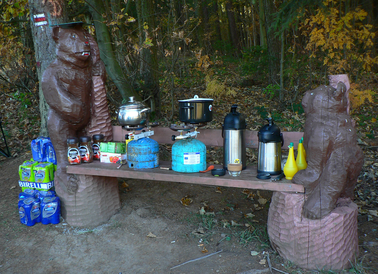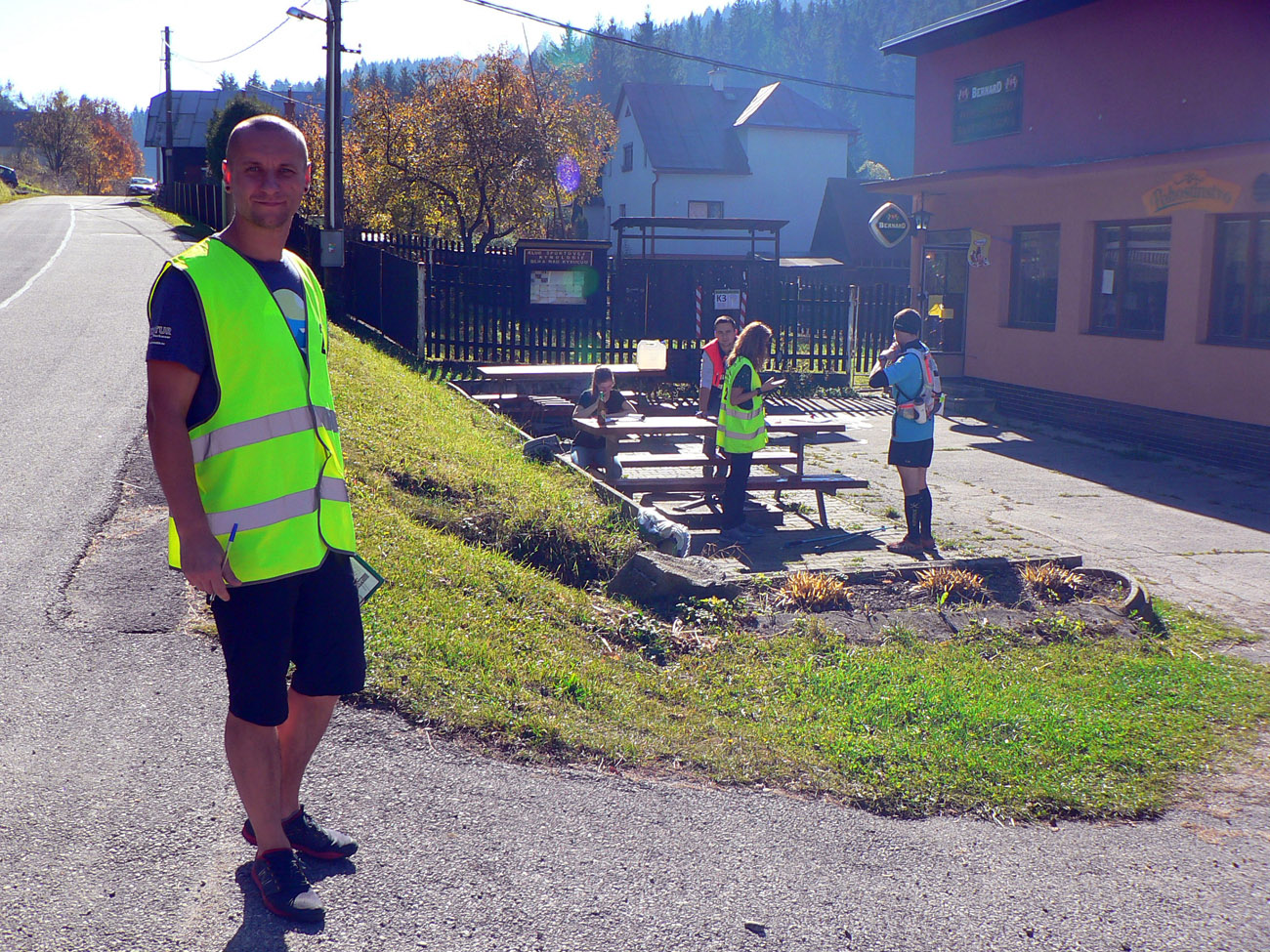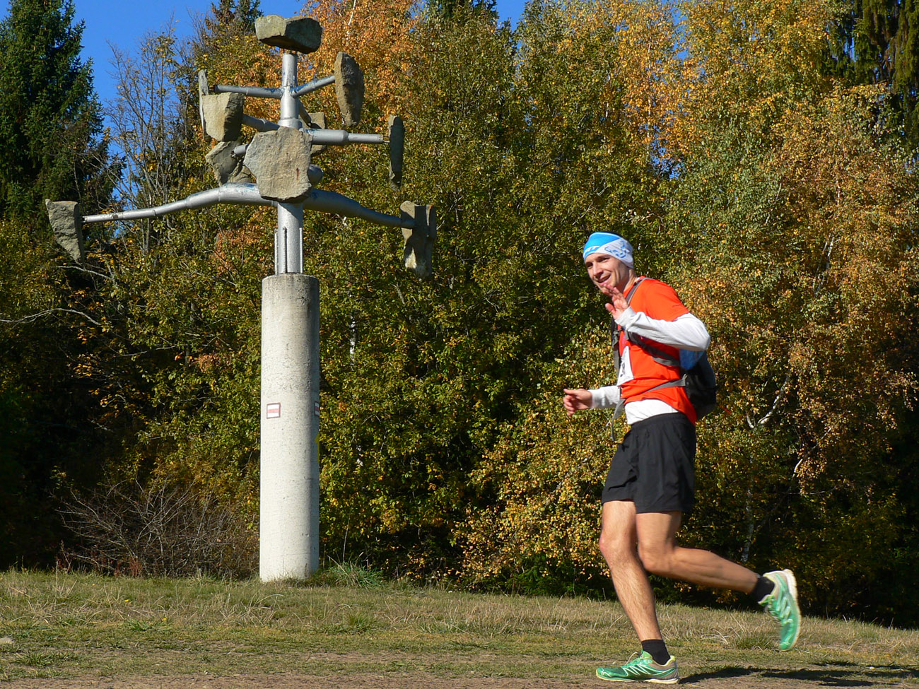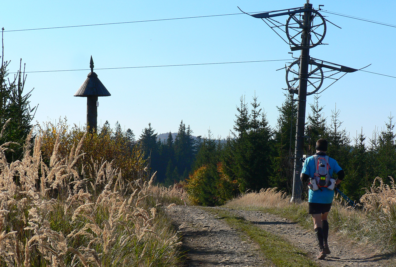 Z dediny zas sme sa rýchlo dostali nad hmlu po panelke okolo toho rybníka, či čo to tam majú. Všade vrčia píly a traktory, domáci chystajú drevo na zimu ako diví. Hej, tu treba, tu kúria už hádam mesiac. Po dlhom výbehu na hrebeň, do Vrchrieky k „Potvorovi“, nasleduje konečne dlhší, súvislý a veľmi pekný úsek až na Jakubovský vrch. Za Kameňovníkom (ďalším výtvorom sochárskej galérie) ešte päť minút strmo hore a potom ešte strmšie dole. A s pár stúpaniami na spestrenie, dlhá klesavá cesta do Dlhej, na K3. Tam už aj na dne doliny svietilo a hrialo. Aysen a Ivana tam doleteli ako víchrice a odtiaľ až po Semeteš som bol svedkom ich poriadneho naháňania. Okrem toho malá hydrologická vsuvka: sú tam cestou dve miesta, kde je furt blato – pri kaplnke nad Poľanami (to je megablato) a popri chalupách u Bachroňovcov. Teraz? Sucho, najviac ak nejaká minimláčka, nechápem...