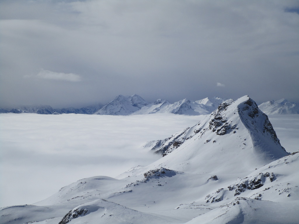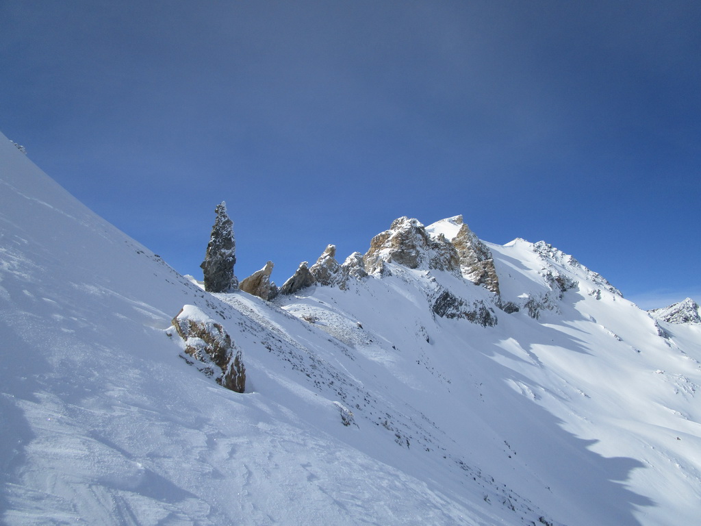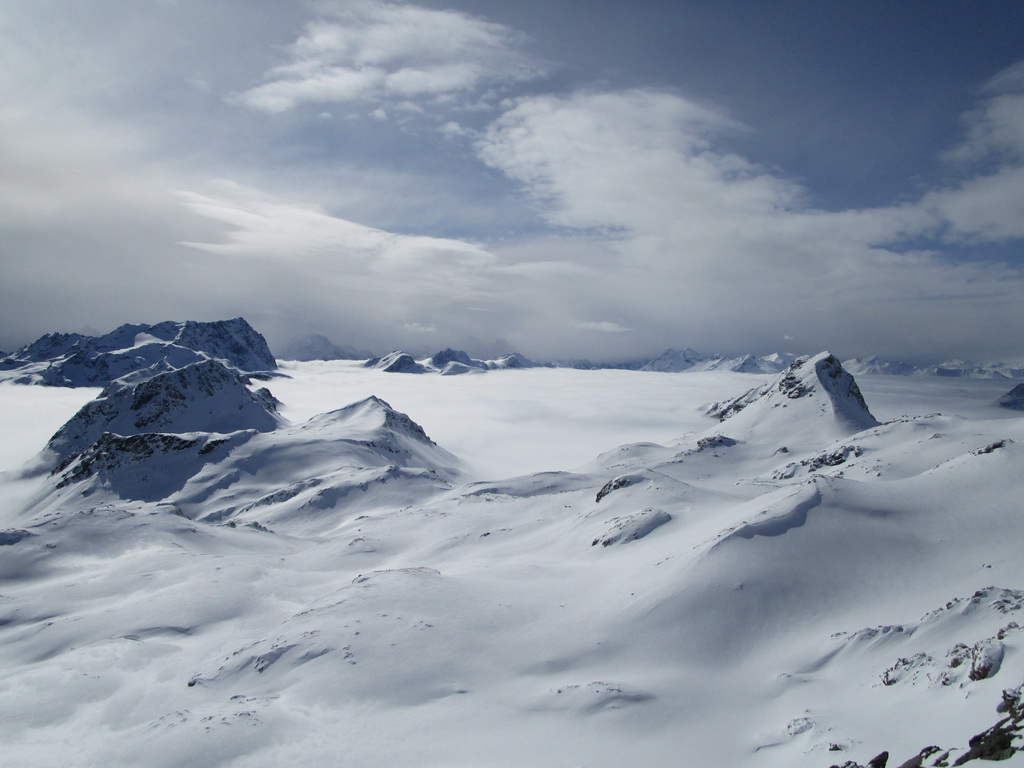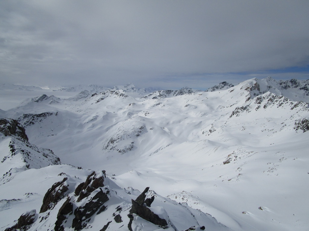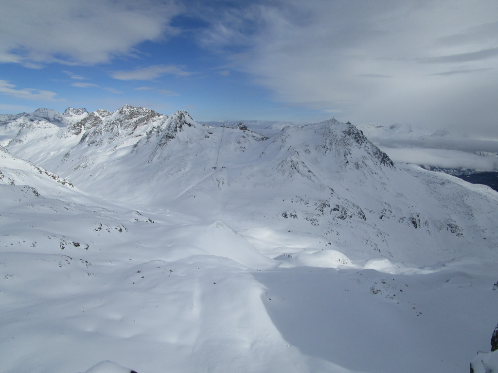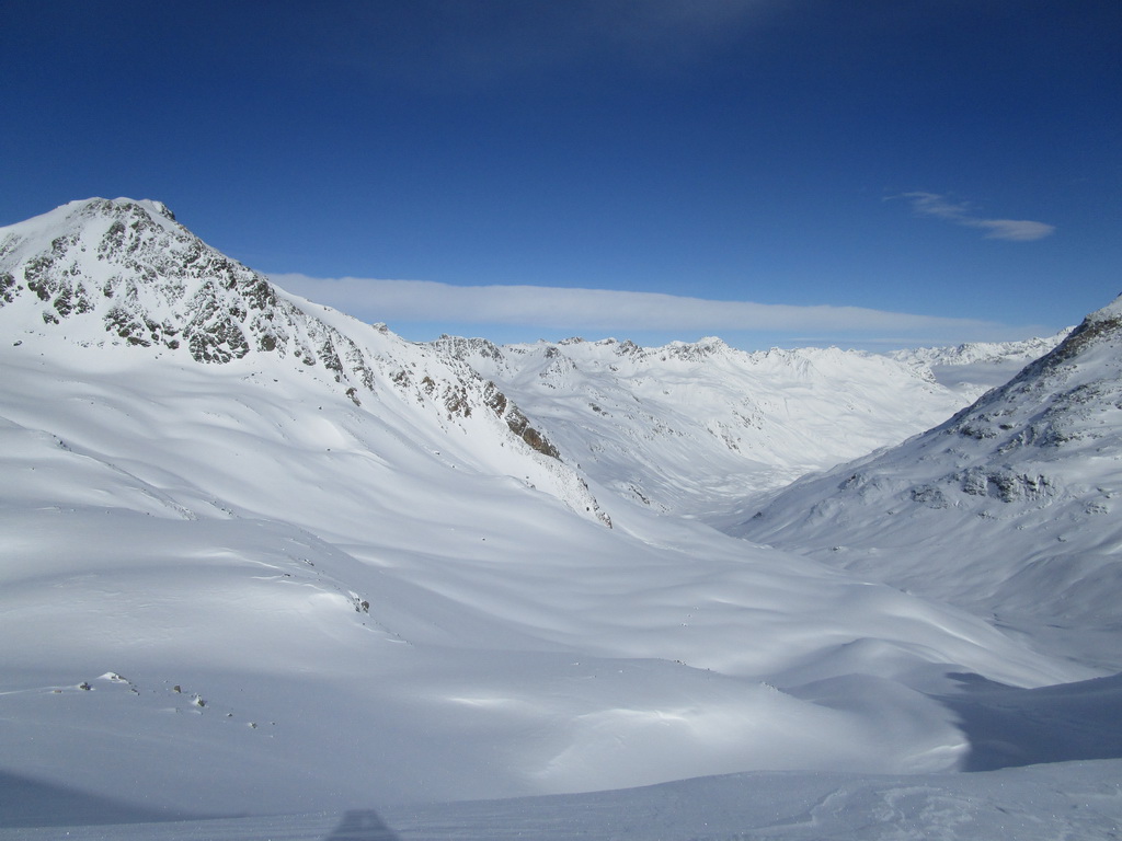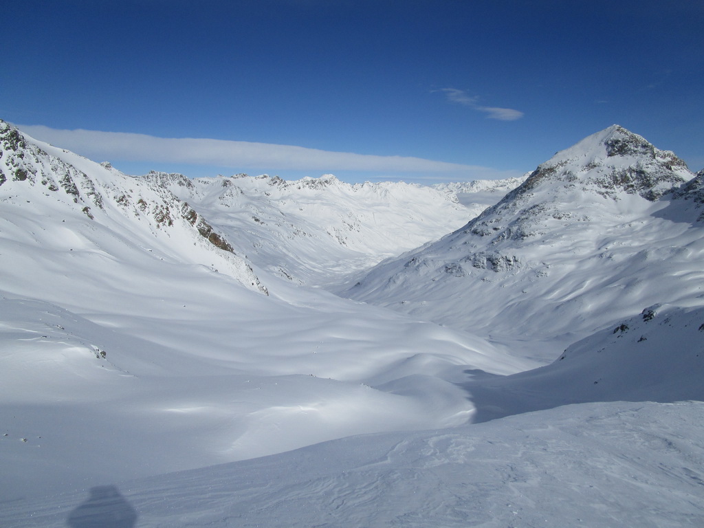 Prešlapávam stopu na Corn Chamoutsch. Heli depo je pod vrcholom, odkladám lyže a popoliezam na vrchol. Dole budem lyžovať dolinkou ktorou som vystúpal hore. Miesto kadiaľ sa púšťali heli lyžiari sa mi zdá moc vyfúkané. V závere zjazdu spomaľujem a slalomom pomedzi kamene sa dostávam dolinkou naspäť ku autu.