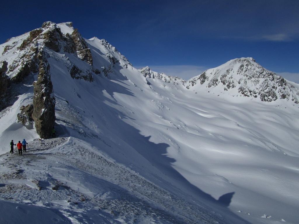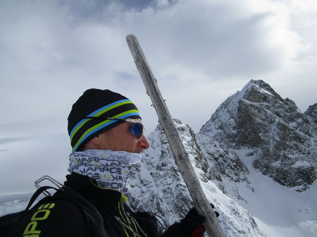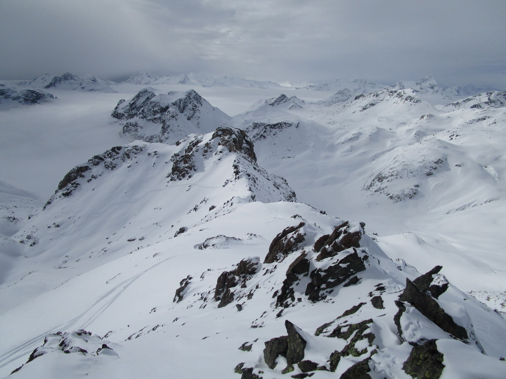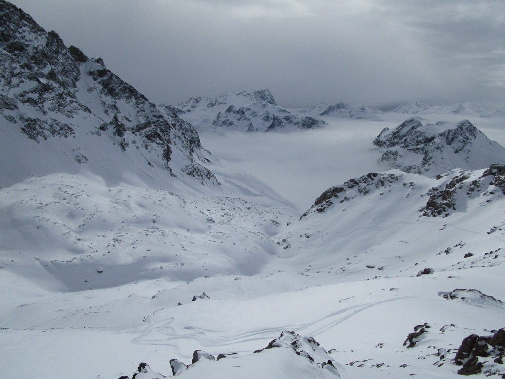 Skupinku predo mnou už dobieham až na malom kopčeku nad sedlom Fuorcla Marguns. Ďakujem im za parádnu stopu. Ani som nerozmýšlal, že by som prvý výšlap viedol niekde inde ako po luxusnej stope. Ten druhý si už ale dávam do panenského terénu. Už počas výstupu som videl ako z vrtuľníku na neďalekom kopčeku vysadzujú lyžiarov. Taký trošku trápny pokus o heliskiing. Parametre toho zjazdu, ktorý na nich čaká totiž nie sú nič moc...