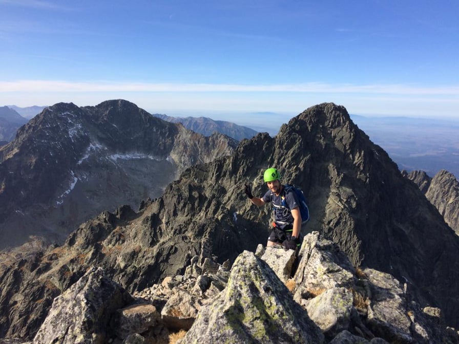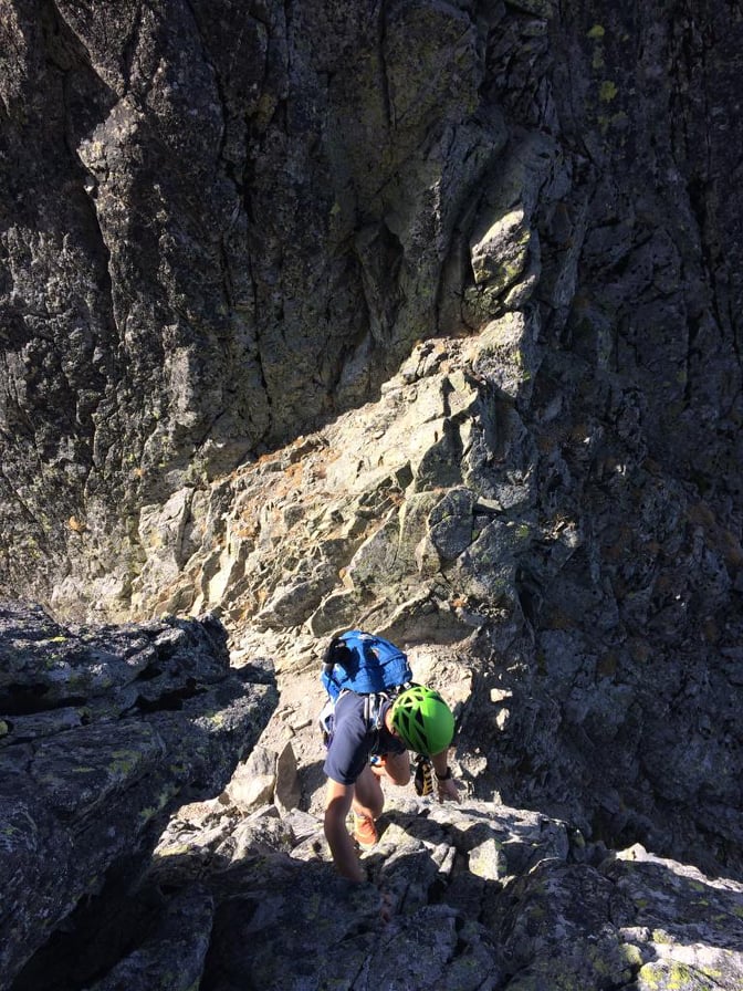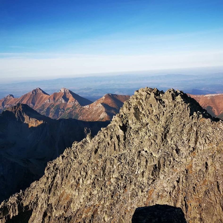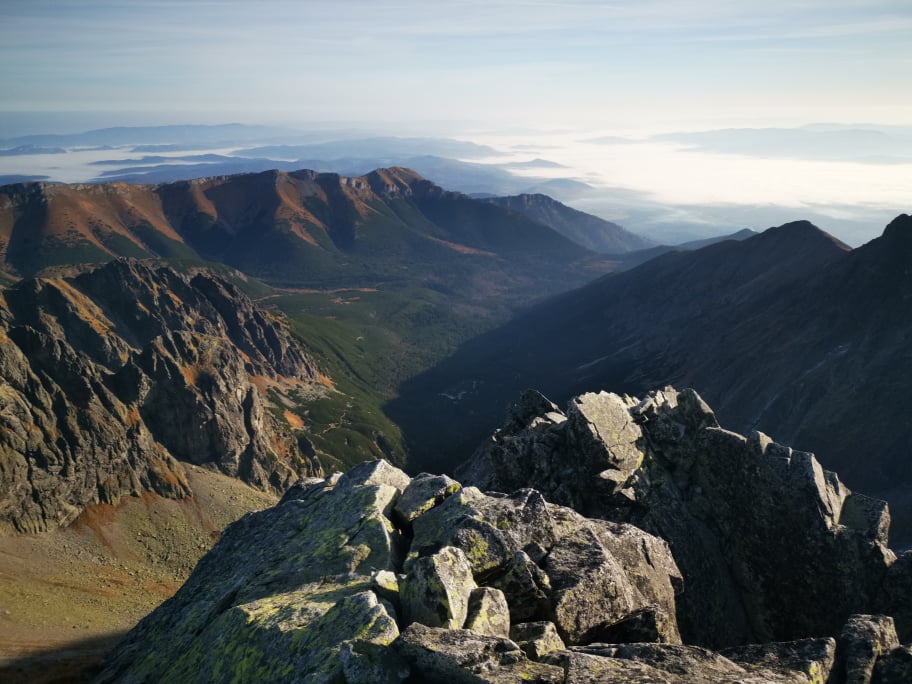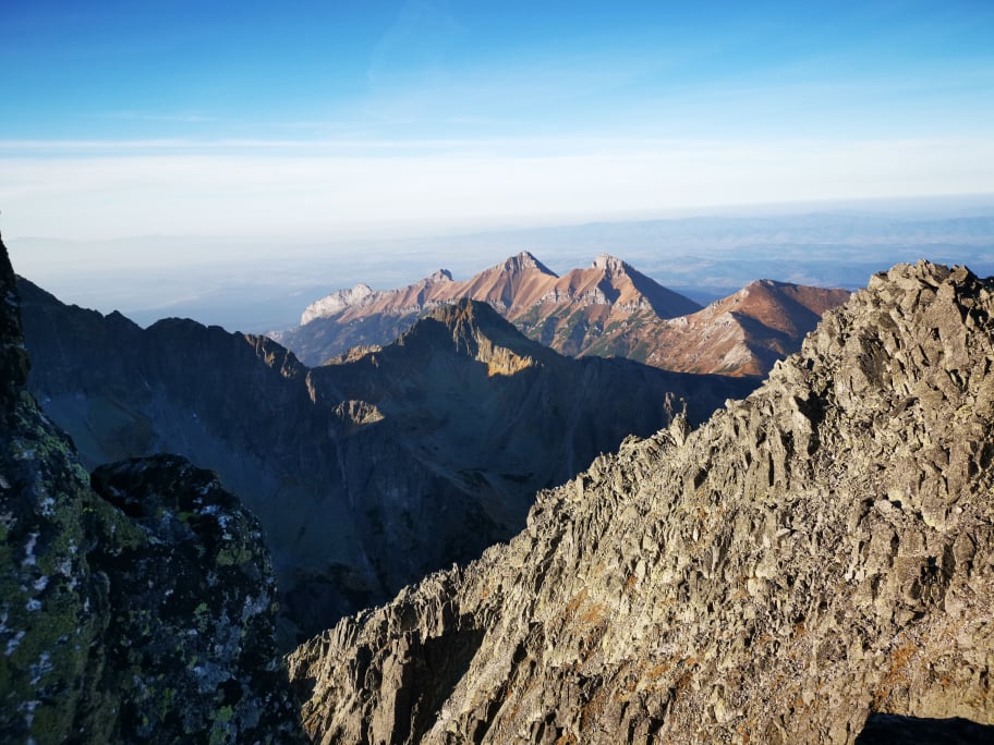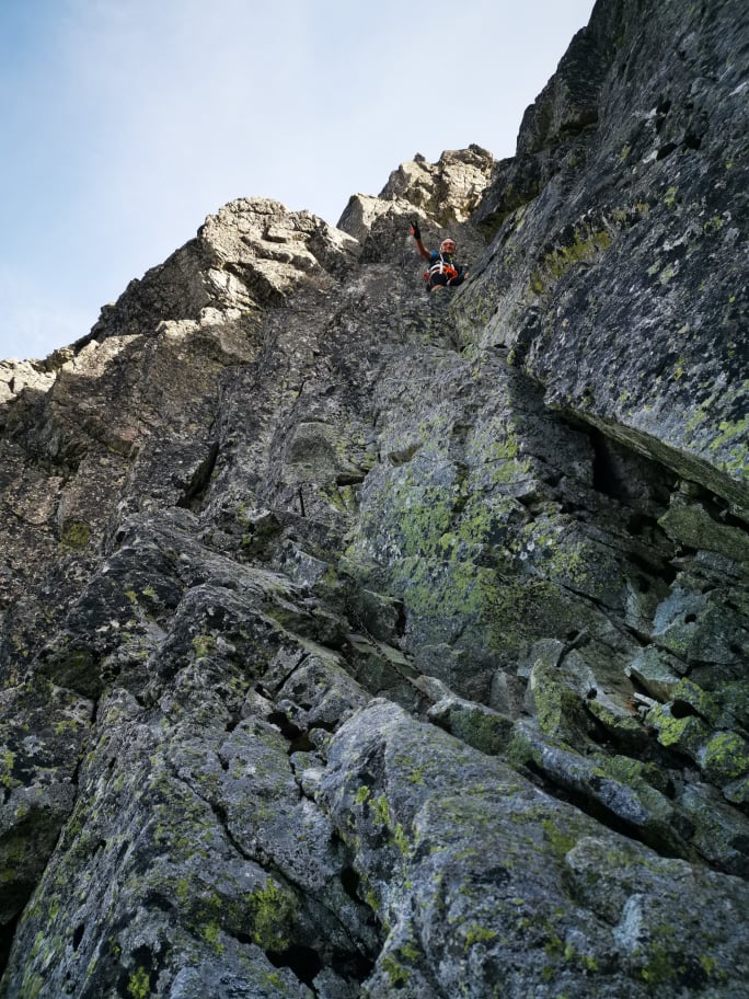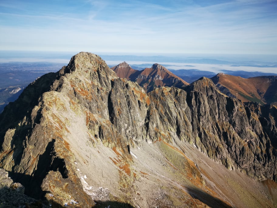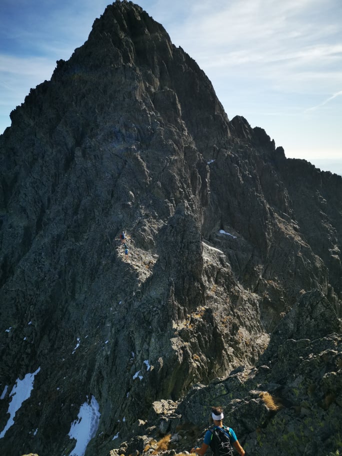 Asi po hodine prichádza Gabo a hneď mierime cez Mačací kotol, cez Malú Lastovičiu štrbinu priamo na vrchol Malého Pyšného a Veľkého Pyšného štítu (2623 m). Na to, že je koniec októbra, je strašne teplo, ale je to lepšie ako hmla a vietor. Na týchto miestach sa príliš nenáhlime, ideme skôr bezpečne. Z vrcholu Pyšného štítu zlaňujeme do Bachledovej štrbiny, odkiaľ pokračujeme Jordánovou cestou až na vrchol Lomnického štítu (2634 m).