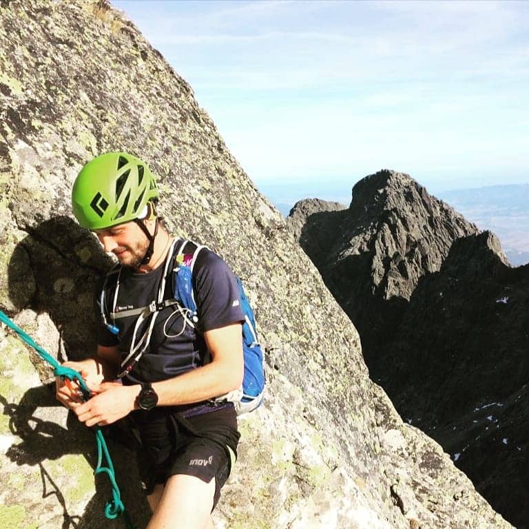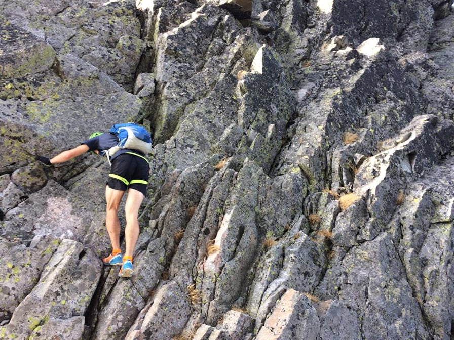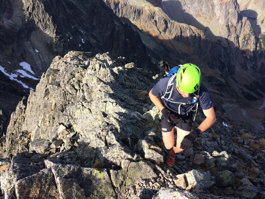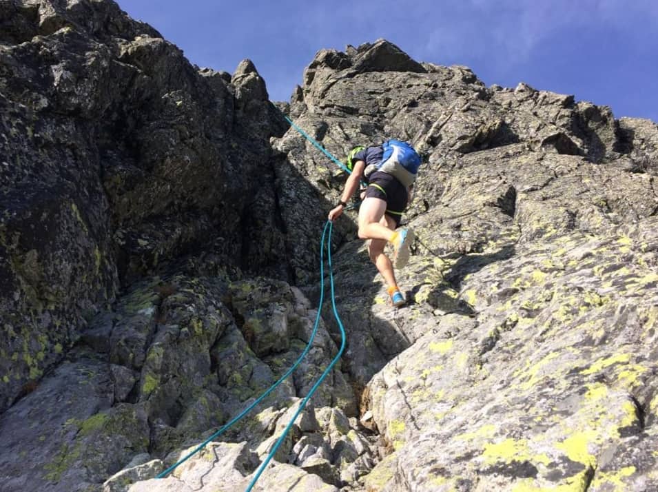 Obavy z ľadu, snehu a chýbajúcich reťazí v Baraňom sedle sa našťastie nenapĺňajú, a tak jednoducho po reťaziach zdolávam Baranie sedlo, odkiaľ smerujem klasickou cestou na Baranie rohy (2526 m). Cestou hore začínam v pravej nohe cítiť prichádzajúci kŕč, preto zvoľním tempo a dopĺňam magnézium. Na vrchole ďalšia fotka, prvý gél, tyčinka, magnézium a soľ, veľa soli.