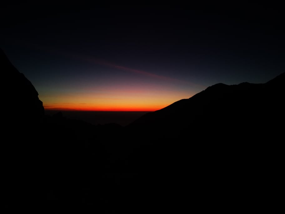 Ráno o 4:20 vyrážam zo Zeleného plesa (1551 m), mierim rovno po turistickom chodníku do Červenej doliny. Pri Červenom plese na chodníku nechávam ruksak a beriem iba palice a čelovku, smerujem po chodníku na Jahňací štít. Niekoľko spiacich kamzíkov priamo na chodníku, ma vystraší viac ako medveď. Na Jahňacom štíte (2230 m) sa otáčam na päte a smerujem nadol k ruksaku. Beriem prilbu a šliapem smerom do Jastrabieho sedla, potom po lávke najjednoduchšou cestou na vrchol Jastrabej veže (2137 m). Urobím fotku absolútnej tmy a vydávam sa zase dolu k ruksaku. Križujem chodník a smerujem rovno po suťovisku do Východnej Kozej štrbiny, odkiaľ po hrebeni zdolávam vrchol Kozieho štítu (2111 m). Na štíte sa nezdržiavam dlho, pár fotiek oranžovo-červenej oblohy a za tmy sa vydávam tou istou cestou dolu k ruksaku a na chatu, kde dopĺňam vodu a po krátkej pauze smerujem do Veľkej Zmrzlej doliny.