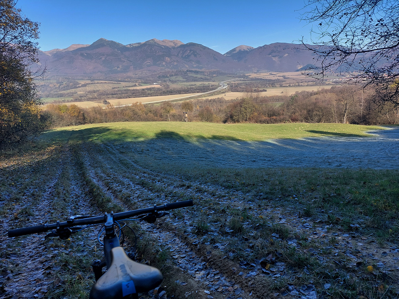 Takže úvod a záver boli o motaní sa pomedzi Váh, diaľnicu a železnicu, ale ani zďaleka nie po rovine. Teda ten úvod, cez Bieličie, celkom výživne do kopca. Aspoň som dobre zahrial motory. Medvedie kôpky na každom kroku tam, ale zas tie výhľady! Potom dole do Nolčova síce po čerstvo pohnojenej lúke, ale na severnom svahu v tieňoch našťastie ešte mrzlo, hehe...