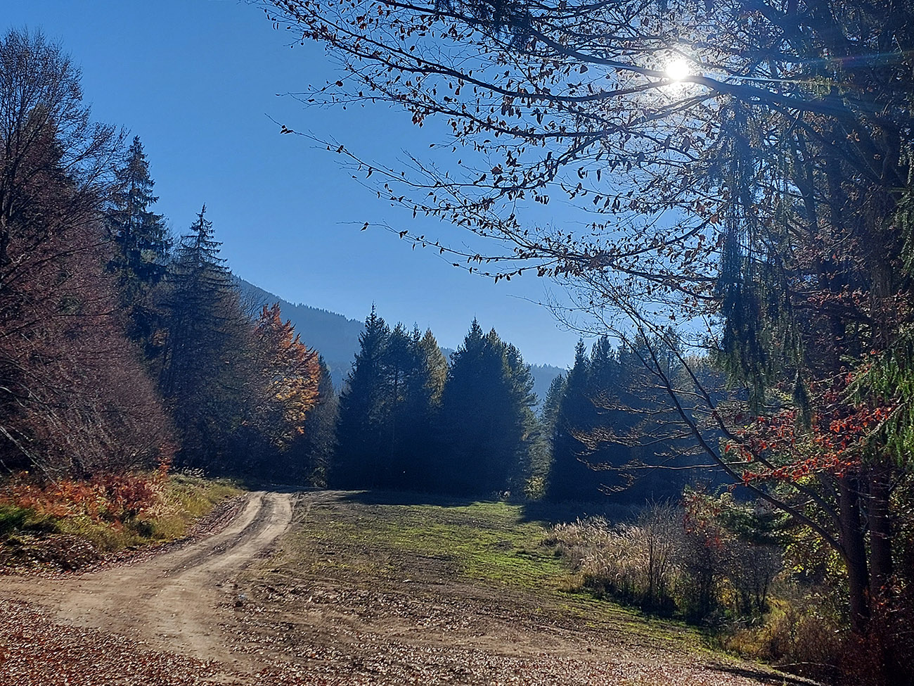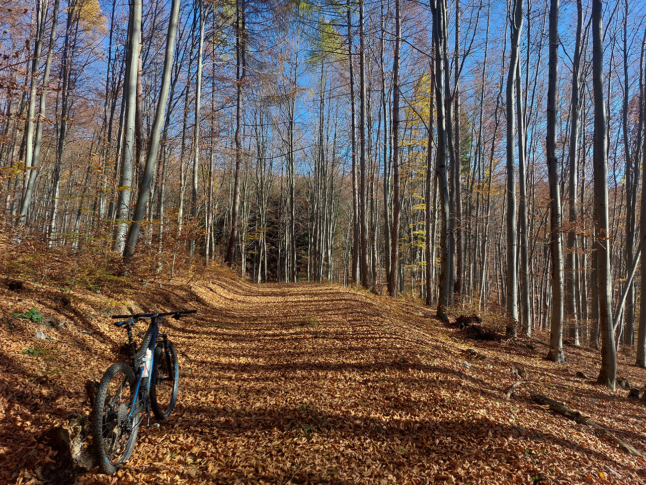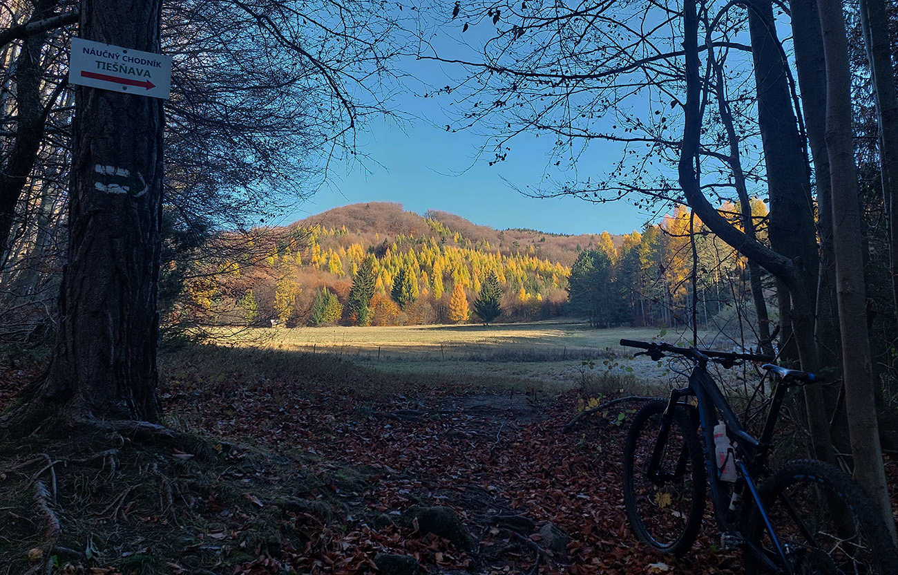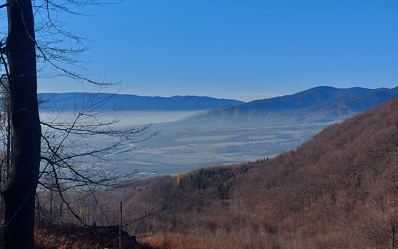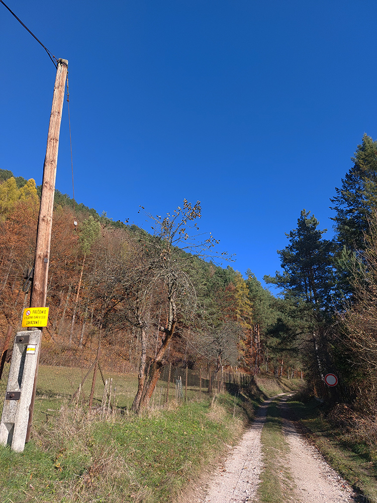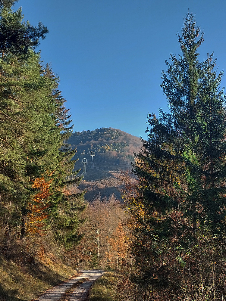 Potom už nolčovský mostík cez Váh, ešte trochu šotoliny do Krpelian a nástup do poctivých kopcov, hneď za krpelianskou elektrárňou. Najskôr po žltej, potom kadejaké traverzy s občasným prekrižovaním turistických značiek - všetko dobré, suché, lesné cesty, len škvrčanie šotoliny už väčšinou nahradil šuchot lístia. Čím vyššie, tým teplejšie, teda aspoň na južných svahoch. Na opačných námraza.