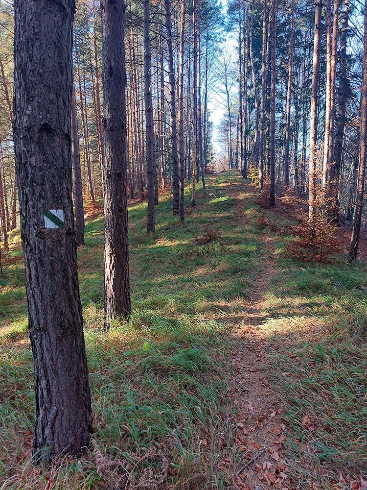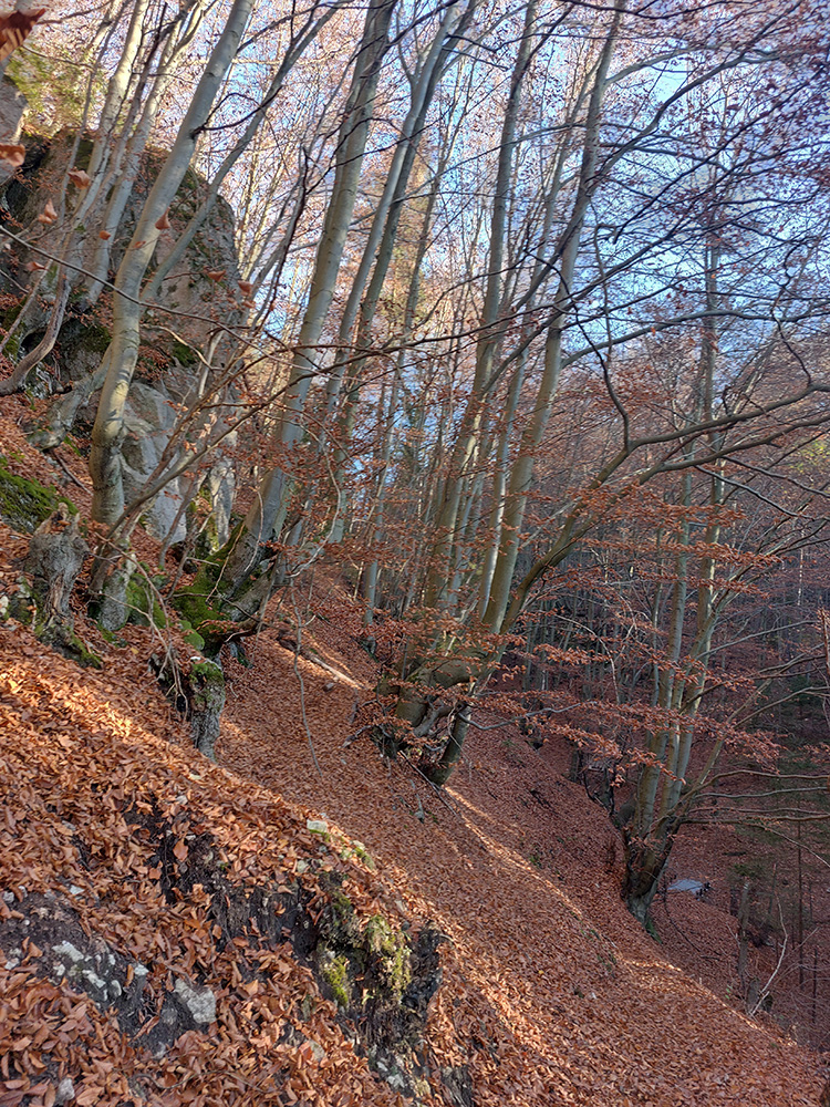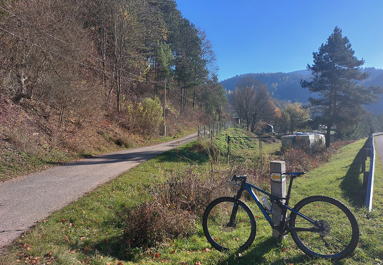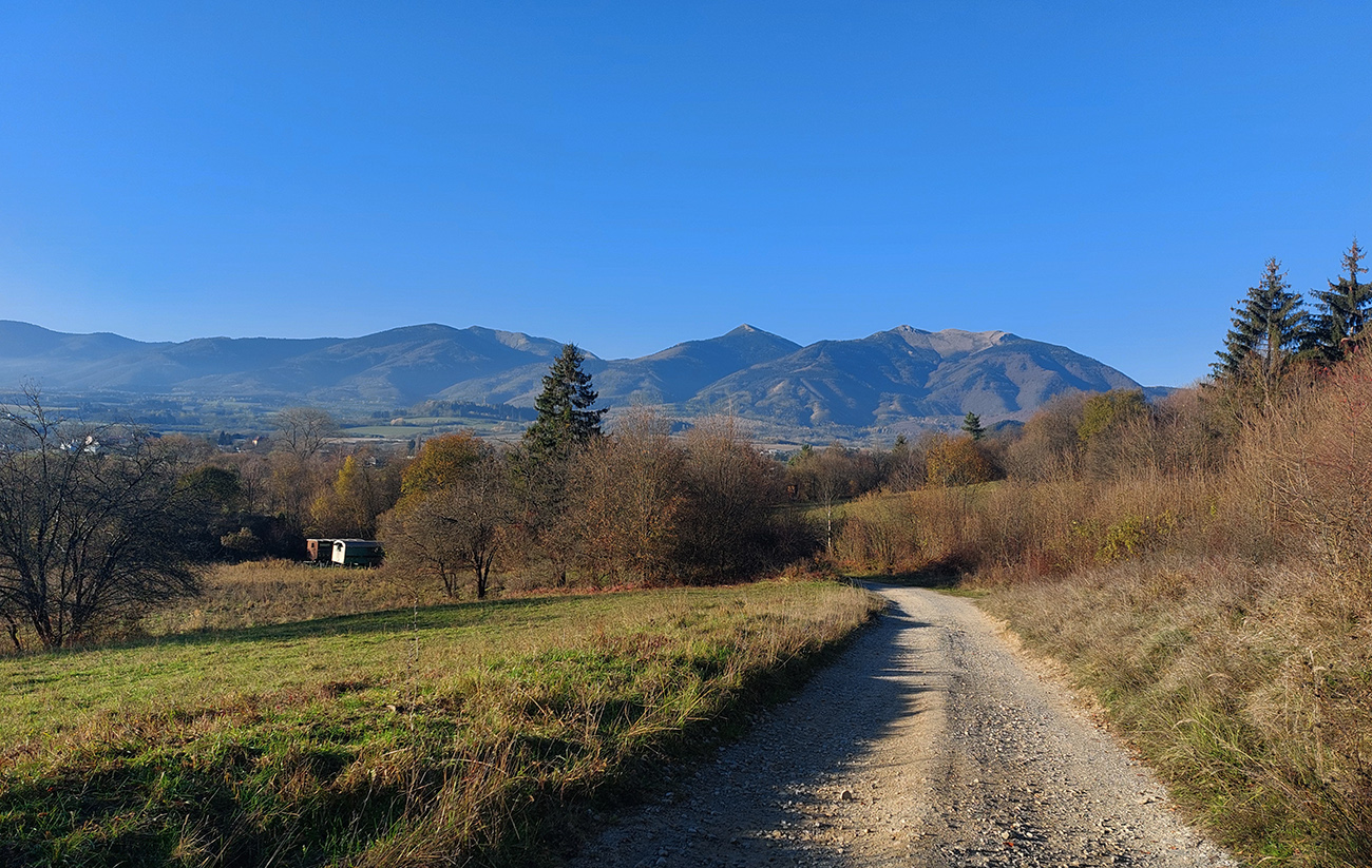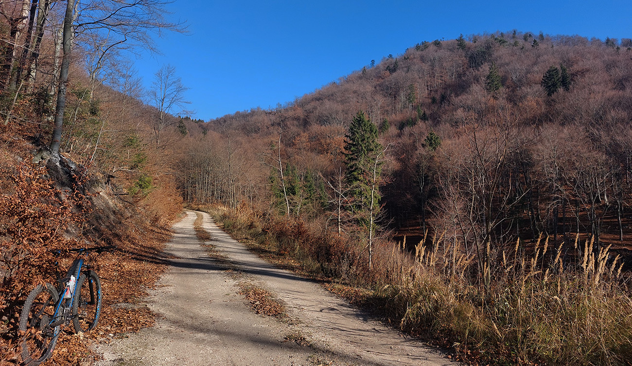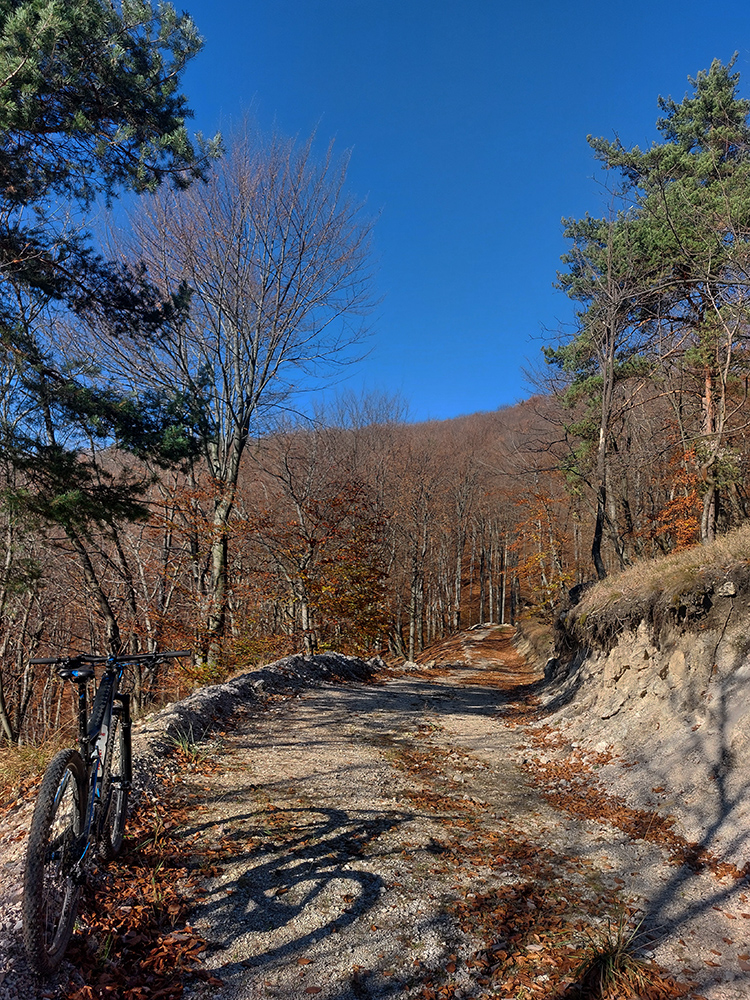 Potom už nolčovský mostík cez Váh, ešte trochu šotoliny do Krpelian a nástup do poctivých kopcov, hneď za krpelianskou elektrárňou. Najskôr po žltej, potom kadejaké traverzy s občasným prekrižovaním turistických značiek - všetko dobré, suché, lesné cesty, len škvrčanie šotoliny už väčšinou nahradil šuchot lístia. Čím vyššie, tým teplejšie, teda aspoň na južných svahoch. Na opačných námraza.