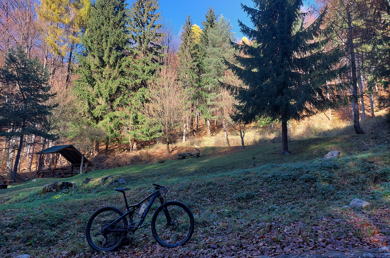 Otočil som aj koliečko po náučnom chodníku Tiesňava (ktorý vyrobili miestni turisti). To už je úzky a kľukatý "singlík", žeby aj zmena dáka bola. Prerušil som dlhý zjazd po zvážnici - išiel som najskôr dole po bočnom hrebeni ku vleku a potom nazad hore od turistickej chaty (po zelenej). Bolo treba niekde už aj potlačiť, ale stálo to za to. V poslednom zjazde, už cestou dole k Váhu, som ešte nakukol do doliny Bieleho potoka, ale rýchlo som to otočil, keď to začalo byť nepohodlne prudké a hrboľaté. A chladné, lebo v tieni.