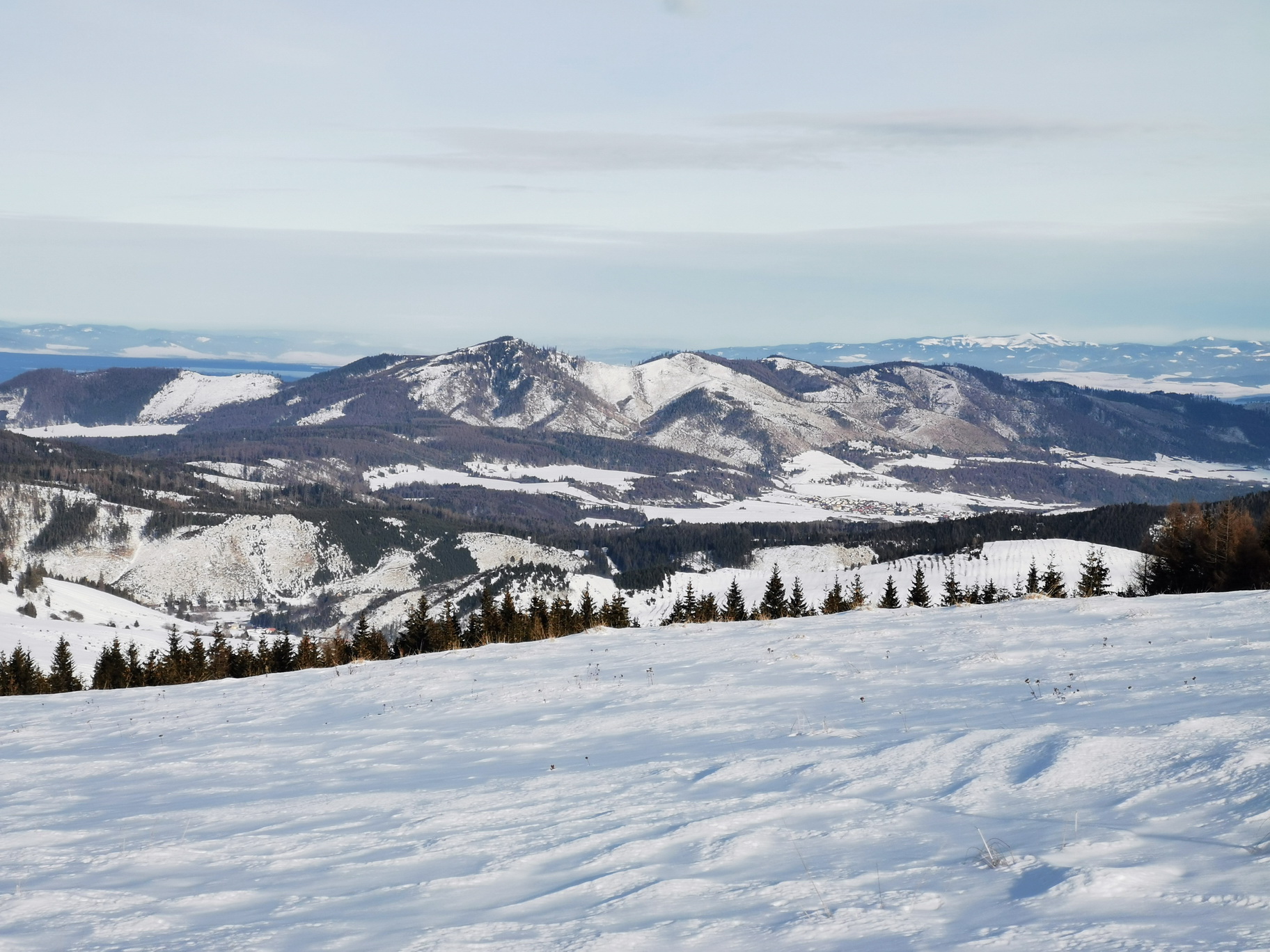 Vyšlapať hore na Panskú hoľu 1429m. to trvá pohodovým tempom asi 1,5 hod. prekonáme prevýšenie takmer 500 v.m. čo by človek odhadom ani nepovedal. Odtiaľ by sa dalo pokračovať zvlneným hrebeňom až ku chatke Budnárke, prípadne v dobrých podmienkach až na útulňu na Andrejcovej. My sme dnes boli len na prechádzke a z Panskej holi pokračujeme po lúkach na Smrečiny 1365m.