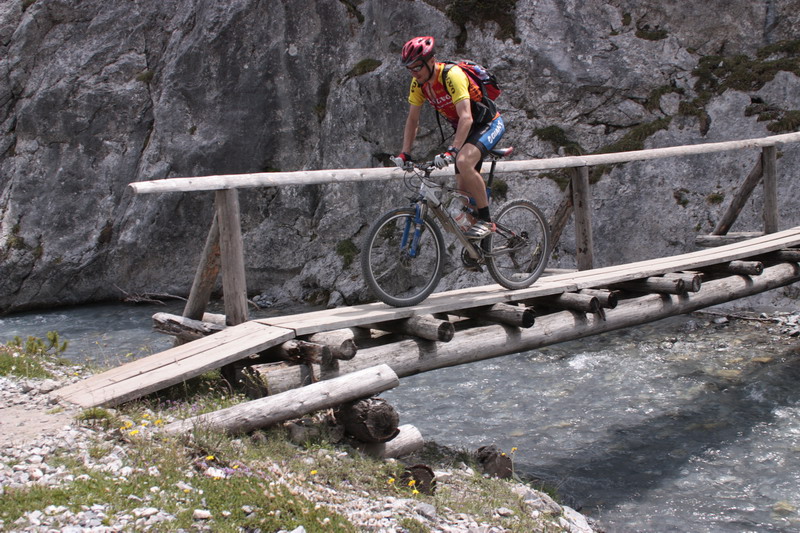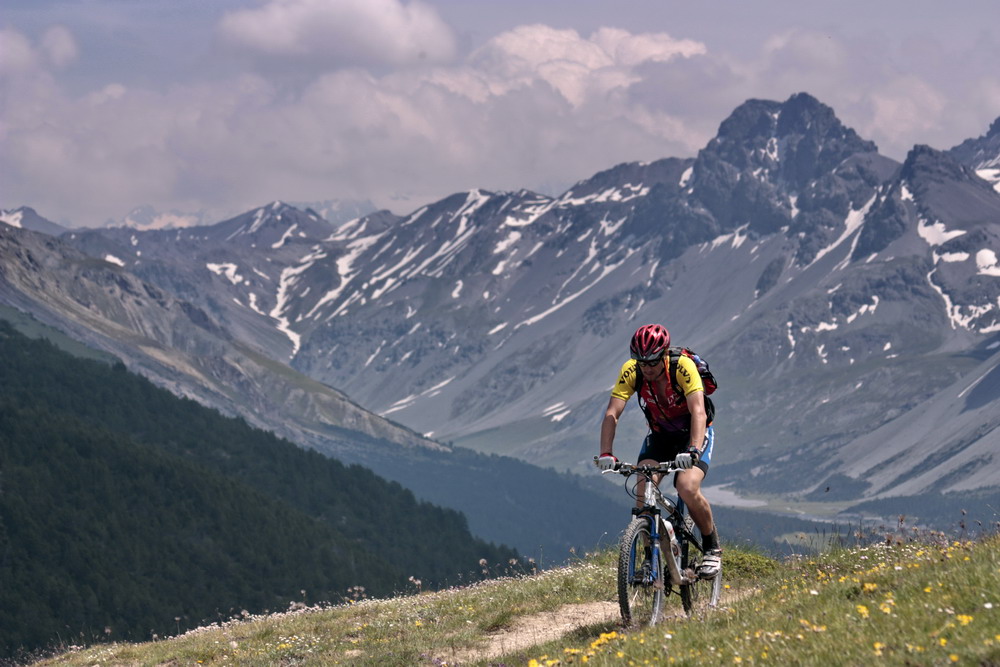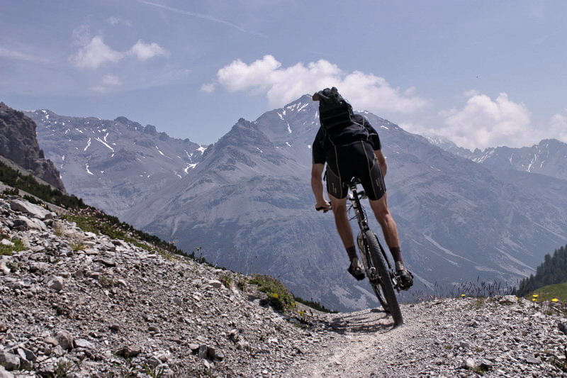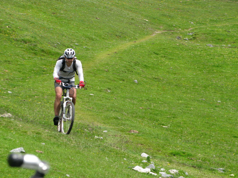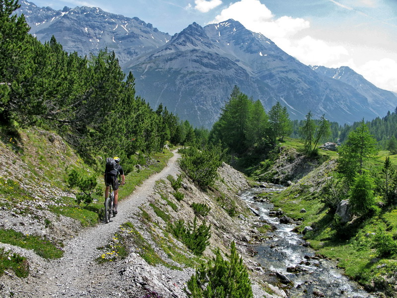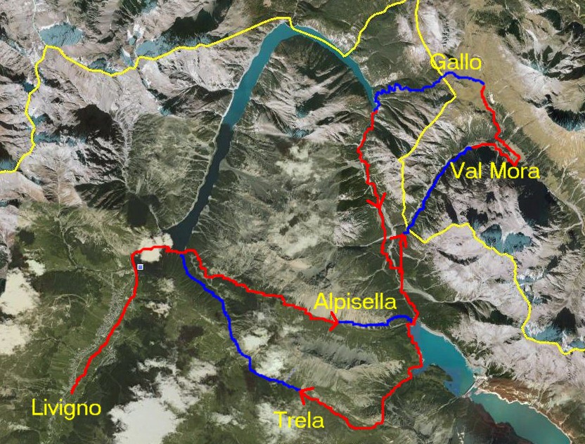 Livigno - k jazeru - stúpanie Val Alpisella - za sedlom odbočiť vľavo na chodníček - zjazd končí pri jazere, odbočiť vľavo - passo Mora - val Mora - v rozšírenej doline prudko vľavo (štrková cesta - popri statku - stúpanie, miestami tlačenie - chodníčkom cez trávnaté lúky - odbočiť vľavo - passo Gallo je najnižší bod po ľavej ruke - zjazd k jazeru - traverz ponad jazero, neskôr rieku - cez starý kamenný most - štrkovou cestou až k jazeru - tu sa uzatvára okruh