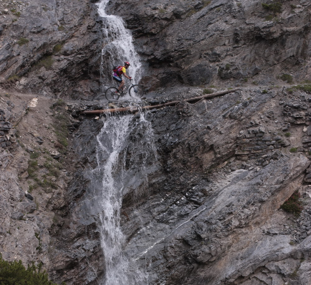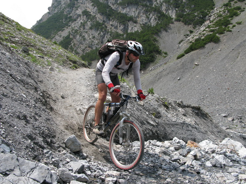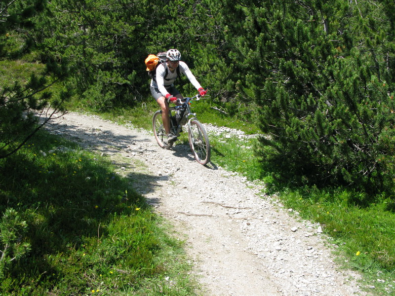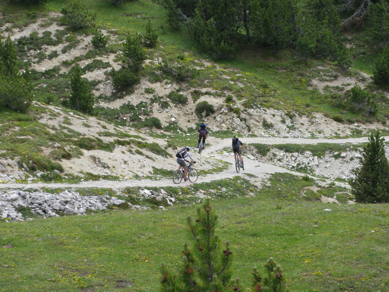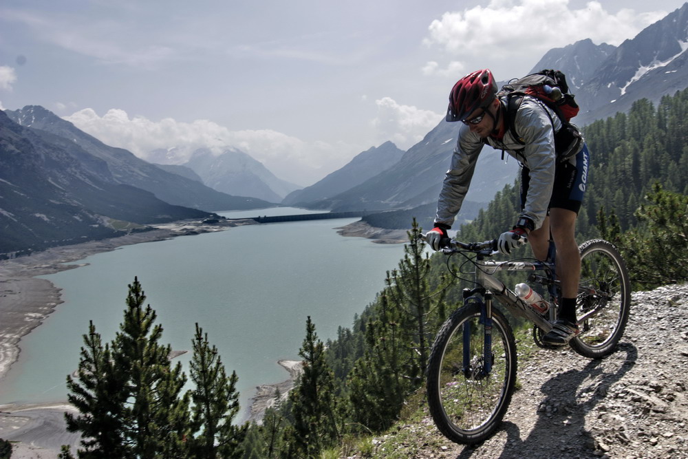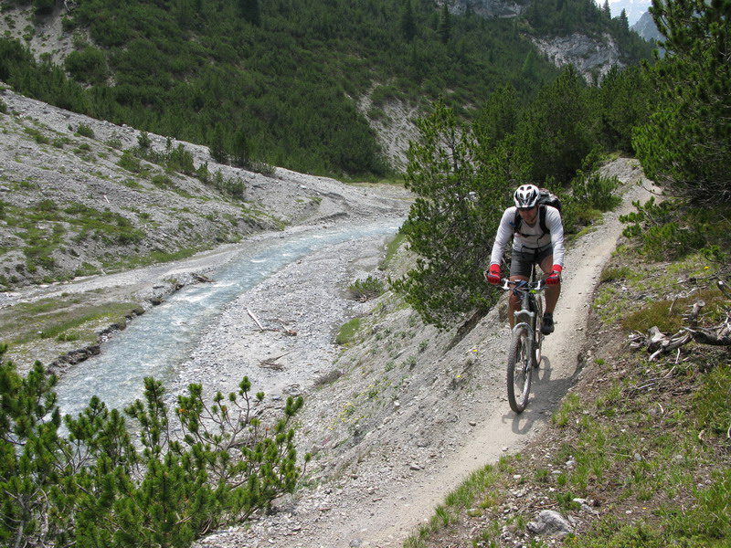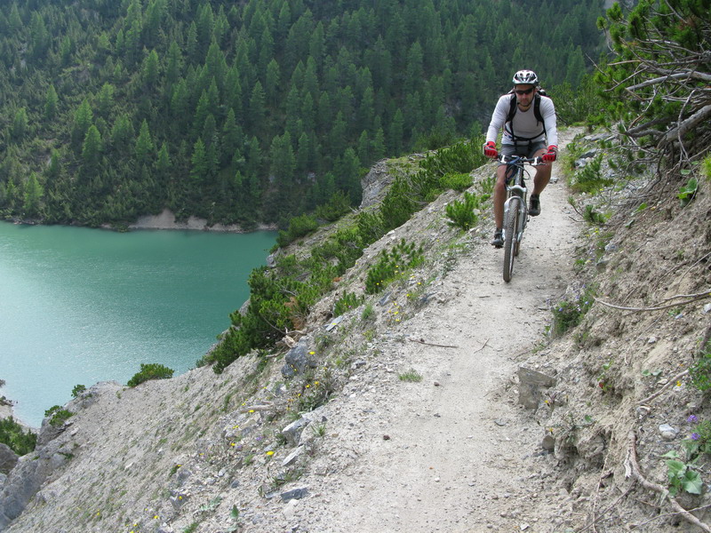 pri jazere doprava - po brehu až po odbočku na val Trela - strmé štrkové serpentíny - až ku chate Baita di Trela - odtiaľ singlom do sedla - zo sedla super zjazd do val Pila - v doline cez most vľavo - singlom ku jazeru - po brehu do Livigna