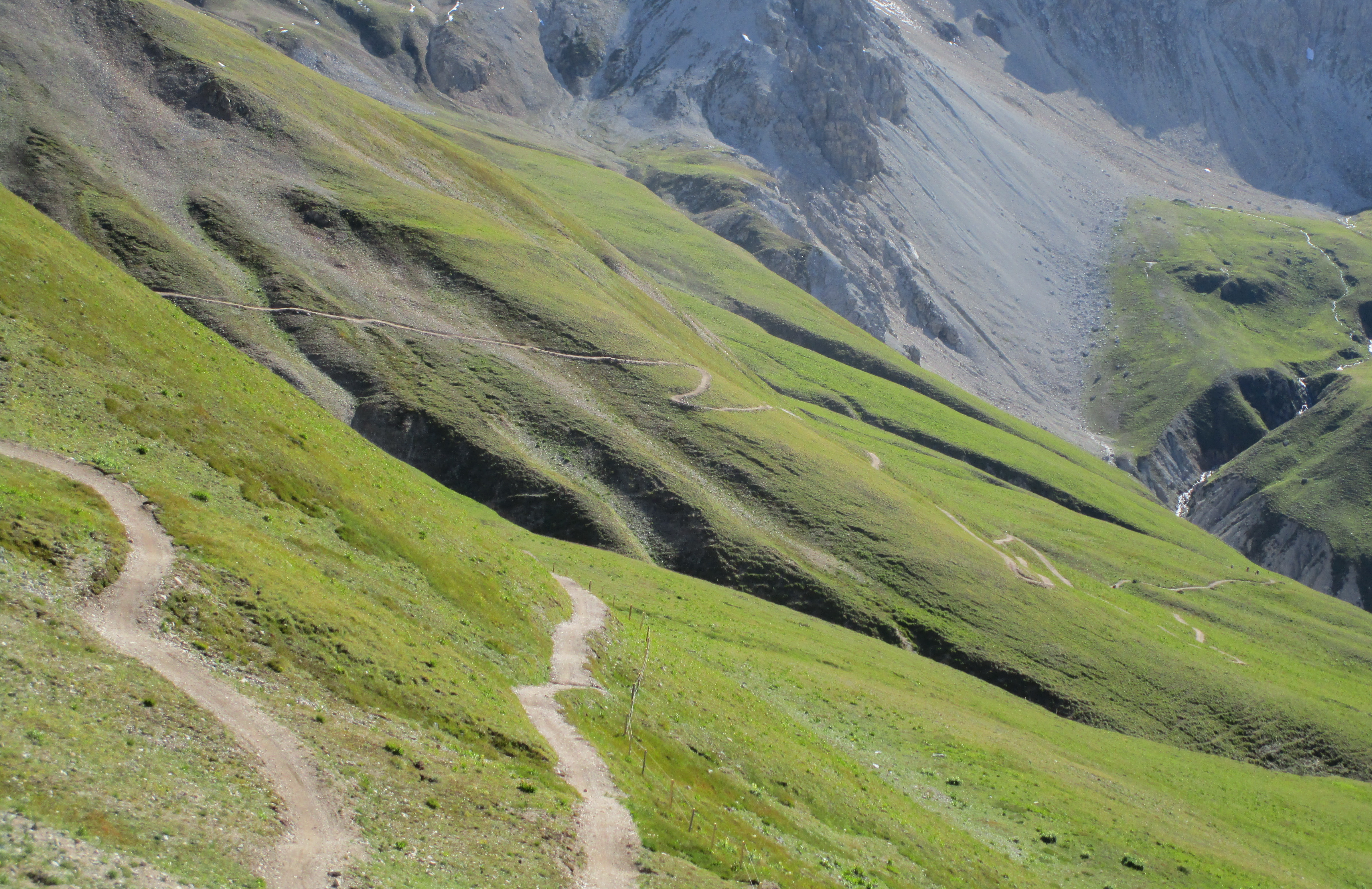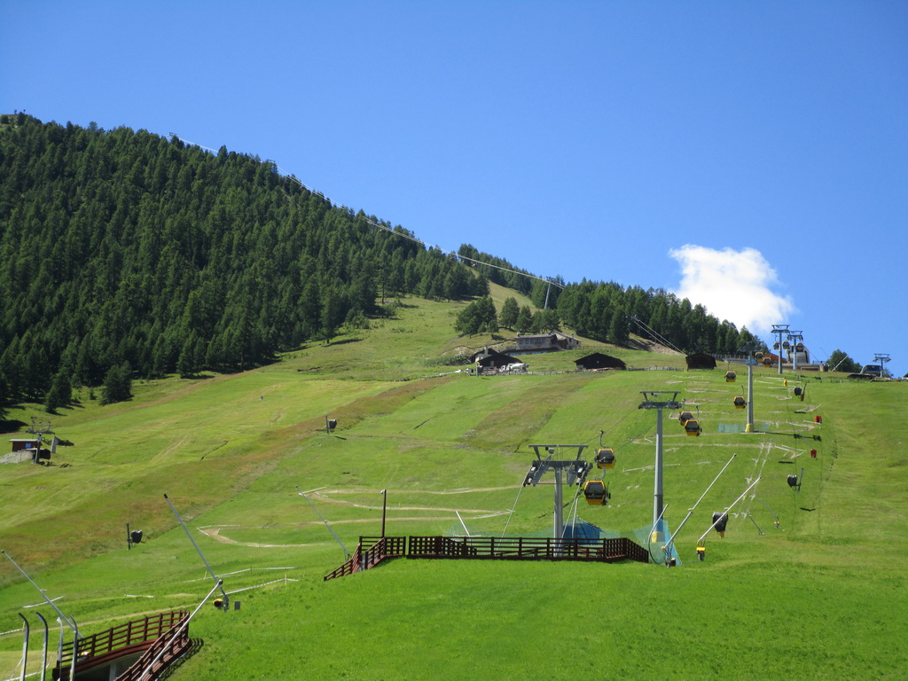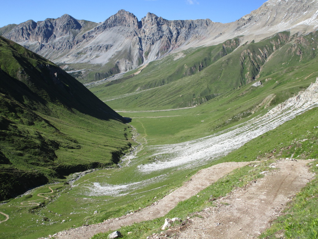 V závere prechádzam okolo kravína. Bajkerov je tu nejak viac ako zvyčajne... odtiaľ už trailom do sedla Stretta. Výhľady parádne, počasie dnes vyšlo. Dole schádzam pešo po drevených schodíkoch, na bajk sadám až asi v polovici zjazdu, erózia tu spravila svoje. Pred vstupom do Livigna sa nestačím diviť aké sú tie prvé parkoviská preplnené.