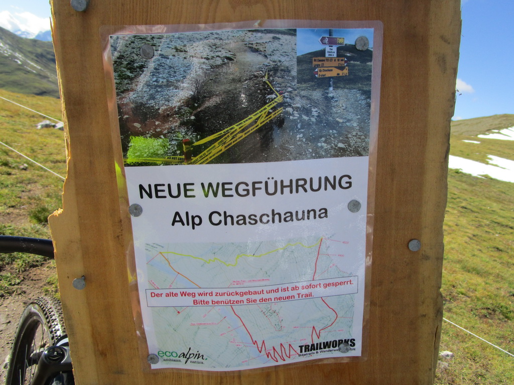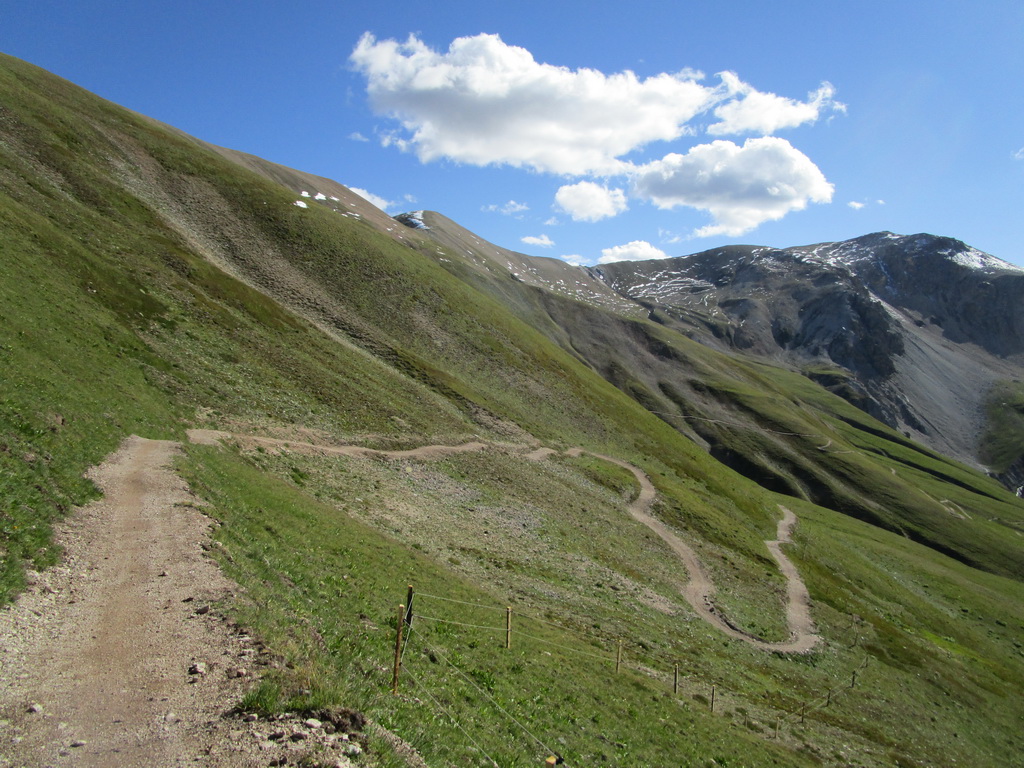 V doline asfaltka prechádza do šotoliny a neskôr odbočujem už na známe stúpanie do sedla Cassana, šv. názov Chaschauna. Také dlhé a vyrovnane náročné stúpanie si nepamätám či som ešte niekde inde išiel. Pochvaľujem si vytuningované prevody: teda ten najľahší - 32x50. Nebyť pošmyknutia v poslednej strmej pasáži nad zavretou chatou Cassana bol by sa mi môj cieľ výjsť to na jeden šup podaril. S batohom kontrabandu na chrbte :)