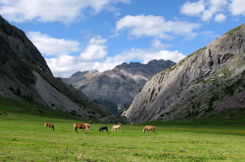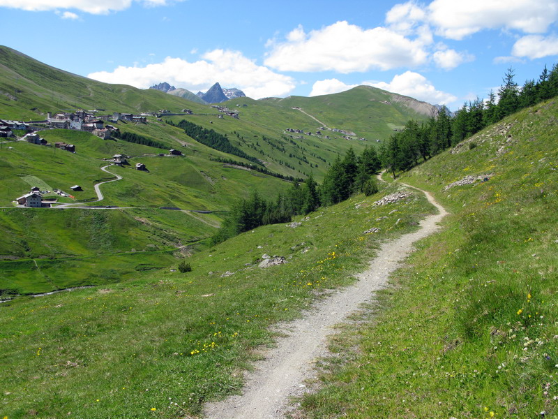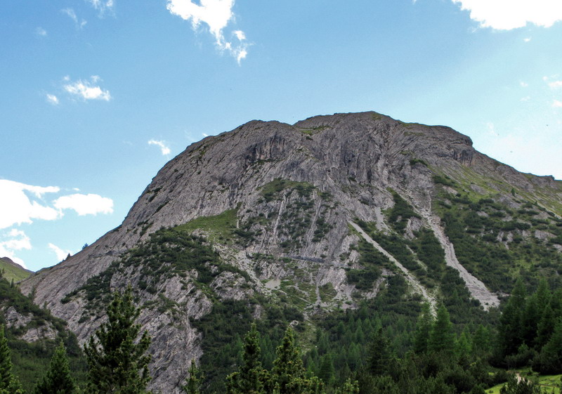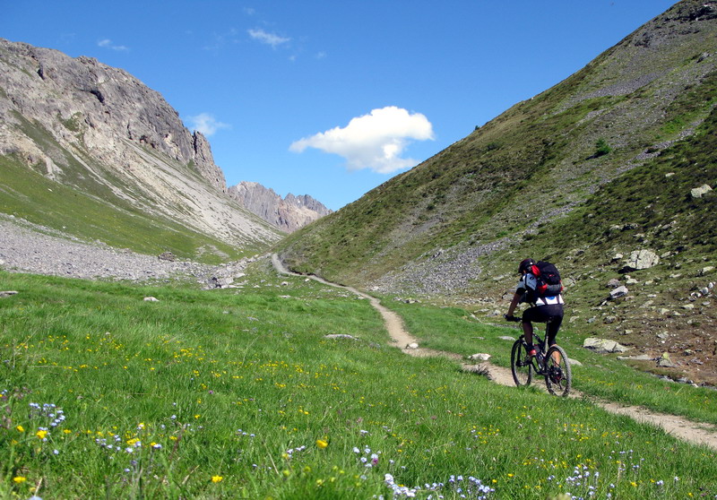 Na sedle dEira (2210) som odbočil doprava na štrkovú cestu klesajúcu súbežne s asfaltkou do doliny. Čoskoro som bol zase naspäť na ceste, tunel som obišiel zľava, ešte kúsok do kopca a už odbočujem vľavo a okolo benzínovej pumpy sa napájam na chodníček traverzujúci do Val Trela. Nádherným traverzom sa dostávam do doliny a napájam sa na chodník vedúci dolinou. Až na jeden krátky úsek sa mi darí všetko vyšlapať v sedle. Turisti sa mi bez problémov vyhýbajú, niektorí ma povzbudzujú. Oproti zjazduje skupinka jazdcov, tým sa zase vyhýbam ja.