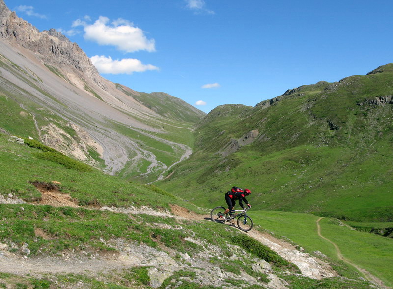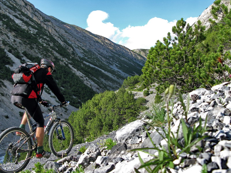 Val Trela. Podľa toho, čo som čítal mal tu byť chodníček upravený špeciálne pre cyklistov. Najprv som sa však musel dostať z Livigna cez passo dEira(2210). Tu som sa rozhodol využiť hlavnú asfaltovú cestu, aby som nemusel tlačiť bike po zjazdovke. Počas výšlapu som pozoroval freeridistov, ako sa púšťajú po upravenej trati z Motolina do Livigna.