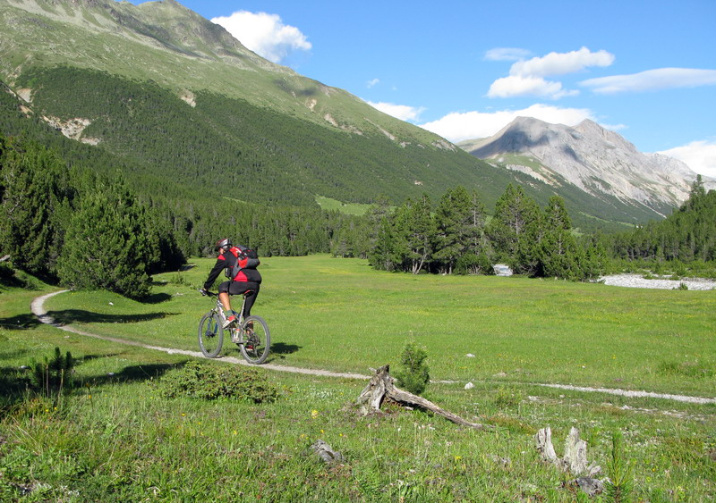 Teraz ma čaká stúpanie na Jufplaun, tam uzatvorím "osmičku". Pred stúpaním si chvíľu posedím na slnku a trochu sa posilním, čoskoro sa totiž znovu vnorím do tieňa. Dobieha ma biker. Zastane a pozerá do mapy. Pýtam sa ho kam ide. Odpovedá, že na Ofenpass (2149). Má tam rezervovaný nocľah, robí trojdenný prechod.