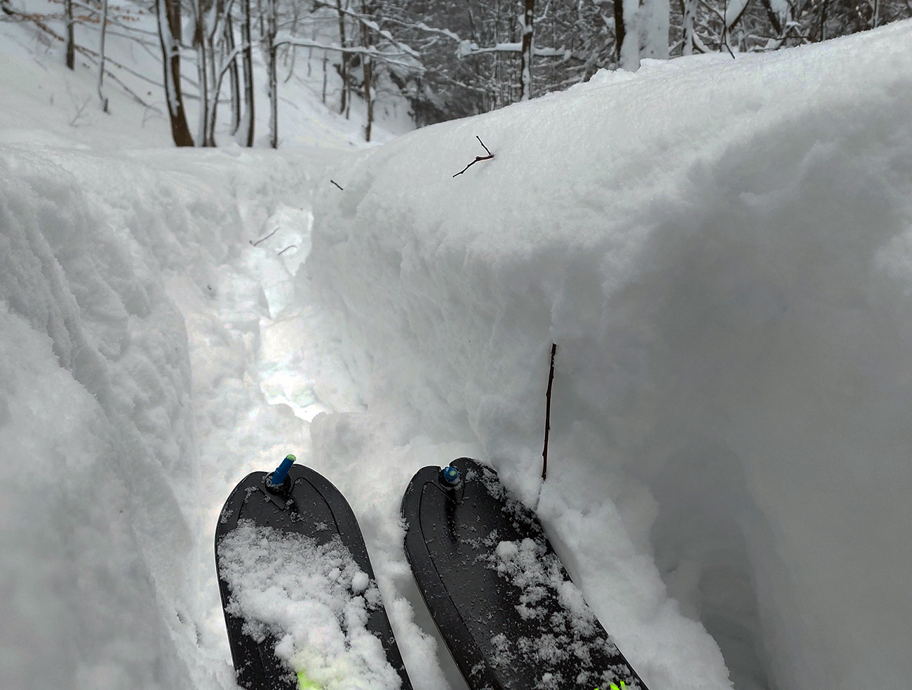 Len pár výnimočných miest tu bolo, kde som si na špičky lyží po došľape dovidel – to tam, kde z lesných priesekov popadali lavíny. Pekný, tvrdý povrch, len jemne prikrytý páperím. Tie náznaky stopy sa pod nimi strácali a na druhej strane zas objavovali. Neboli tam tie lavínky dlho, asi ani deň - pozor! A tá najväčšia, pár desiatok metrov široká, skoro na konci.
