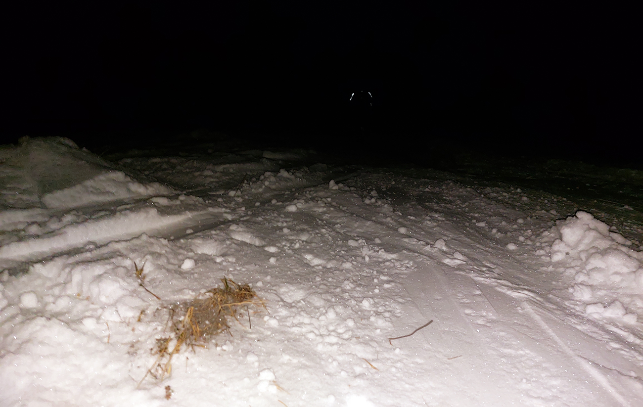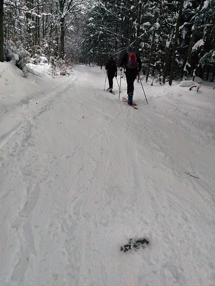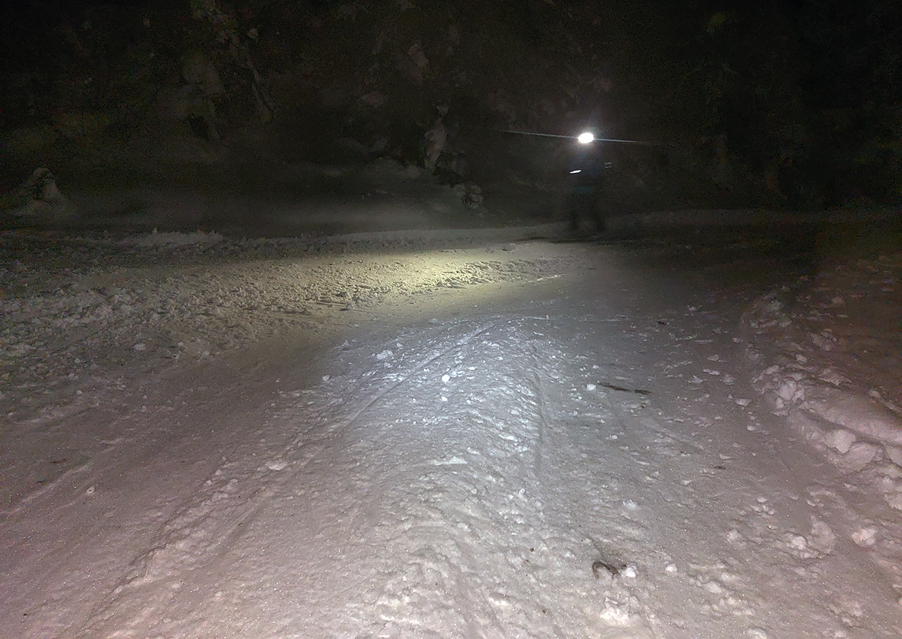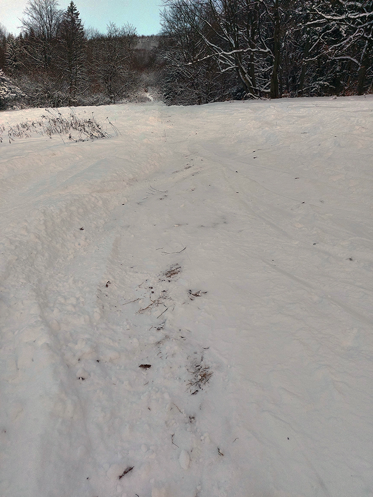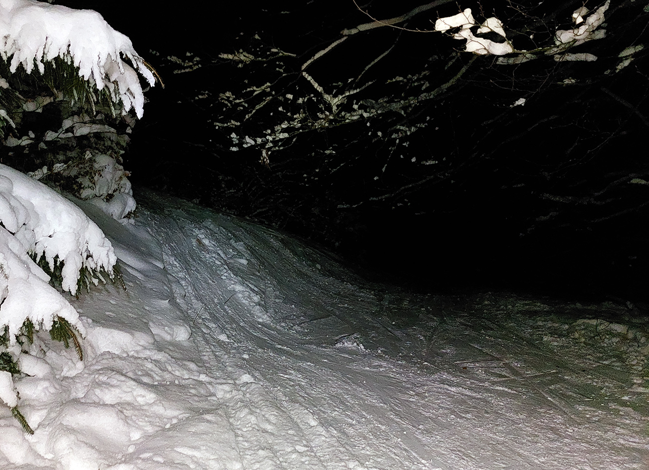 Chleb (v stredu z Trusalovej): Generál klasicky bubnovatý, horná, rovnejšia časť bez prekážok, v strmine kríčky a jafury ako slalomové bránky trčia na vrcholoch, je to vyšmýkané, všetky zrady viditeľné. Potom už dole cestou, kde len občas kamienok spod snehu ratračím pásom vyhodený striehne a na vari dvoch strmších miestach sú nejaké väčšie vyorance rozhádzané. Keď sme my za tmy nič nepochytali, za svetla no problem. Z drevoskladu aj les polyžovaný, ale išli sme slušne po turistickej zelenej až na Zajacovú, a zas – v strede občas piranie mláďa hlavu vystrčí, ale žiadne súvislé húfy tam nie sú, všetko obíditeľné. Turistický chodník zo Zajacovej do Trusalovej taký užší – pekne vyleštené výstupové stopy a popri nich sa v hlbšom snehu dá, ale bacha na skryté konáre. Po ceste je to rýchle, rovné, ujazdené autami, takže predvídateľné. Zlyžovali sme až k Markovi po okraji odpluhovanej cesty, úplne v pohode.