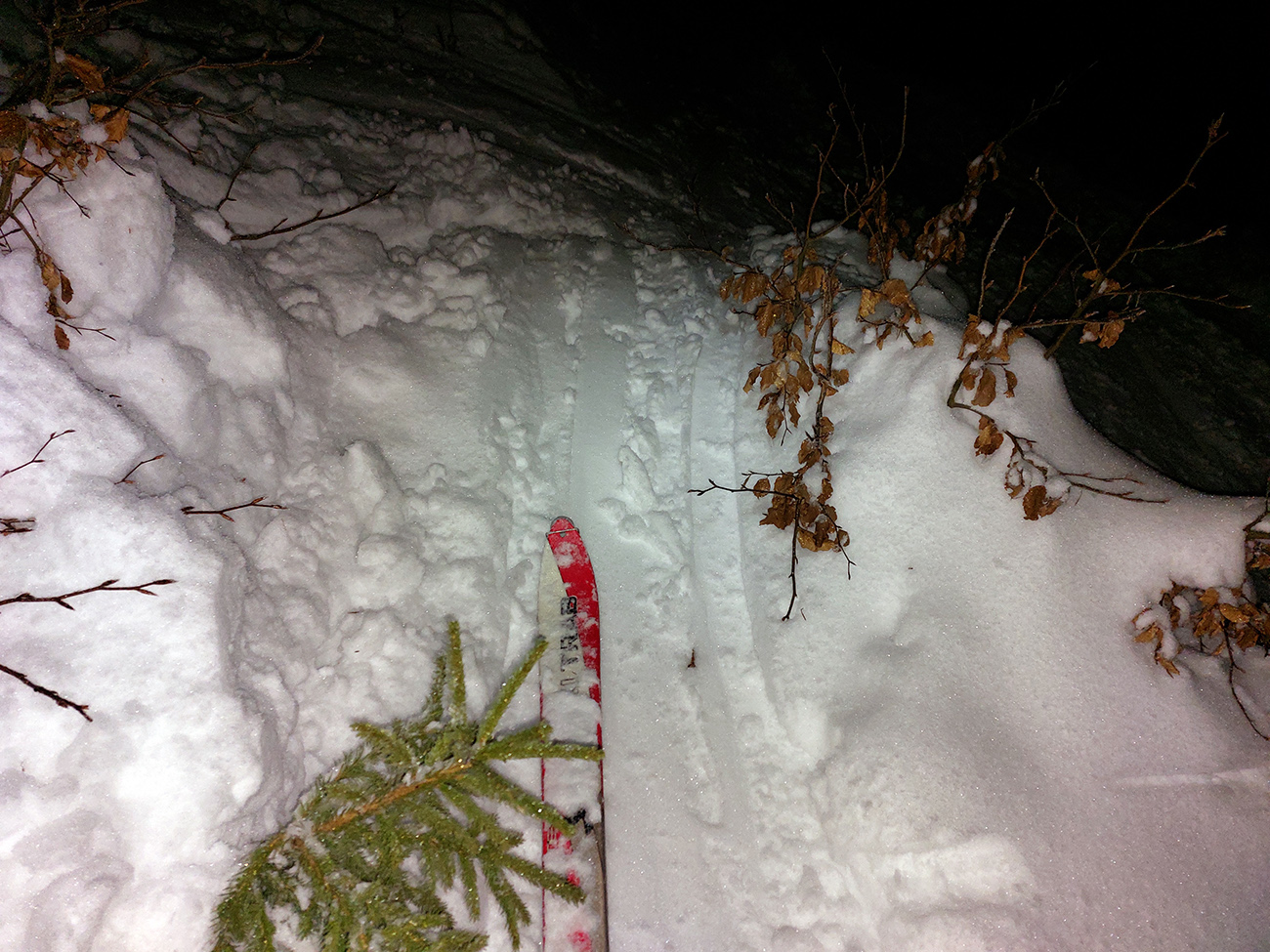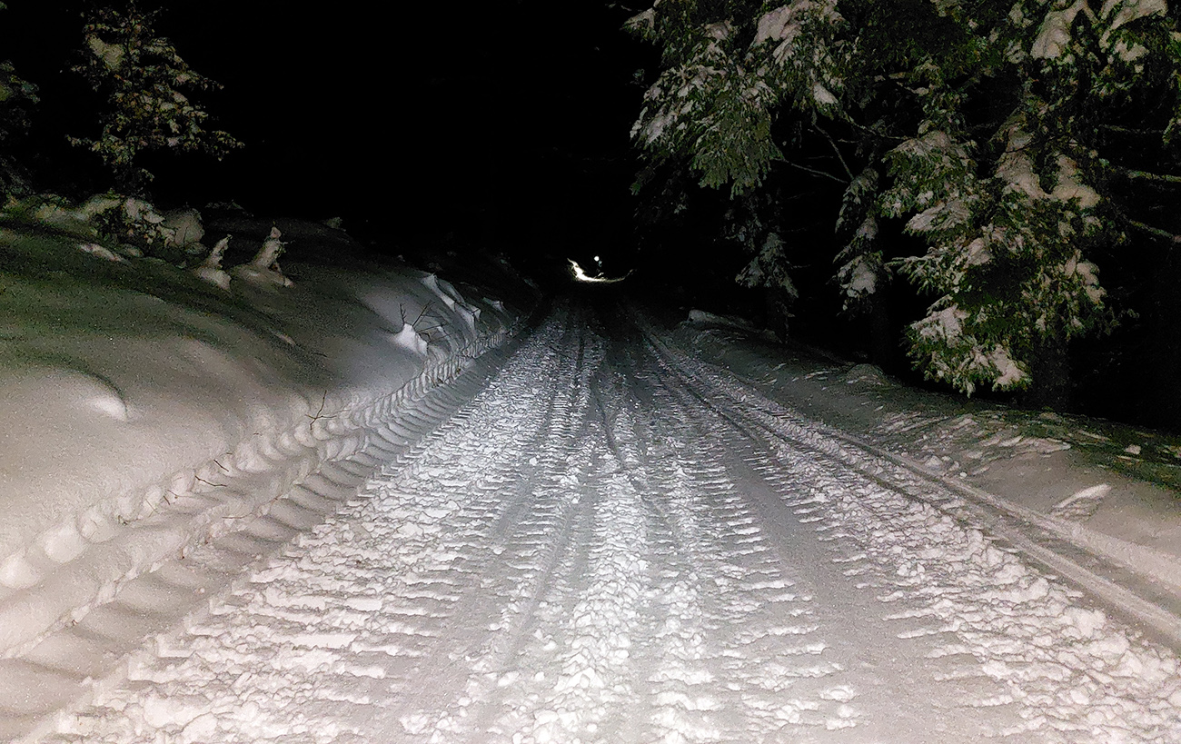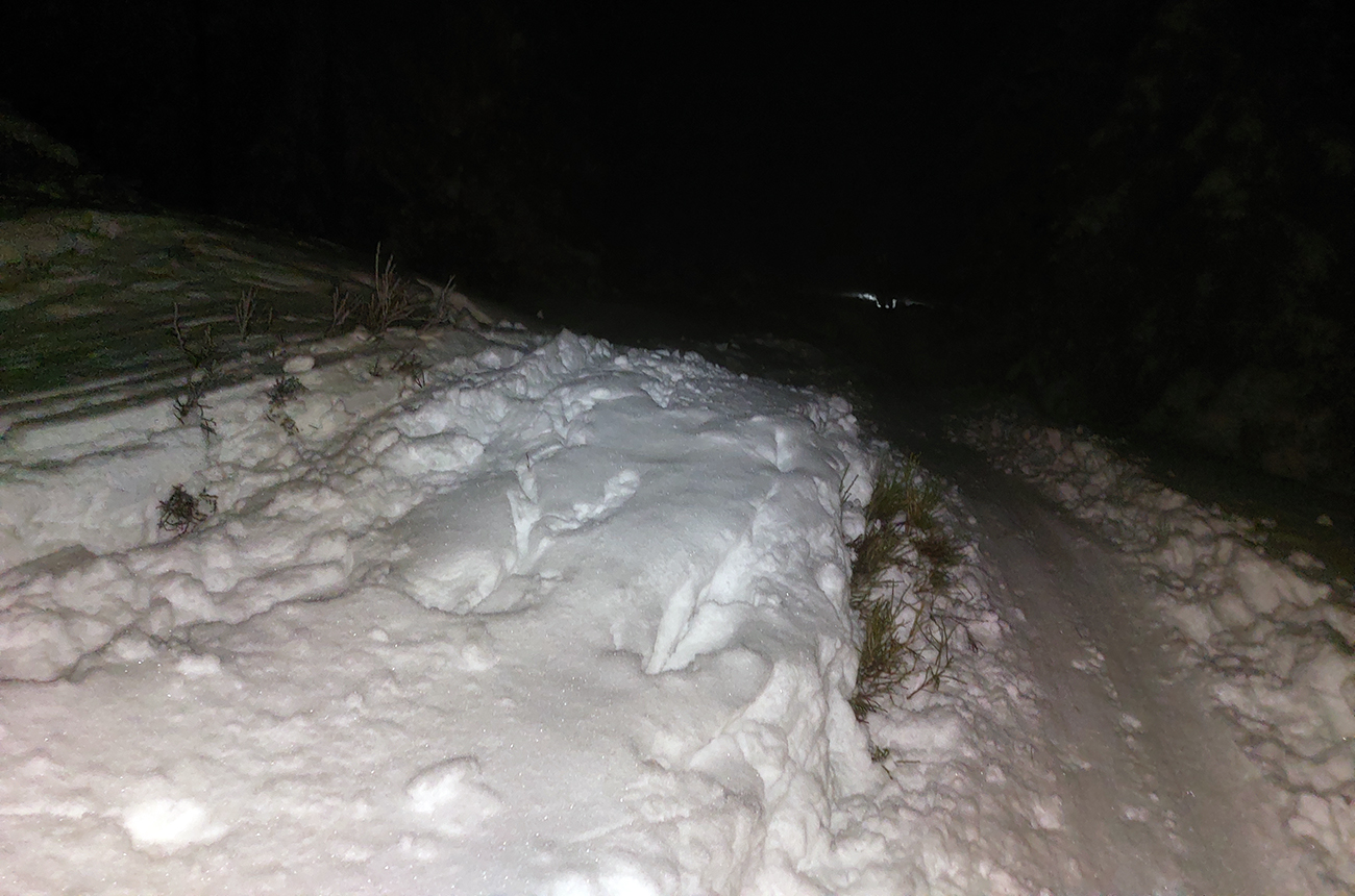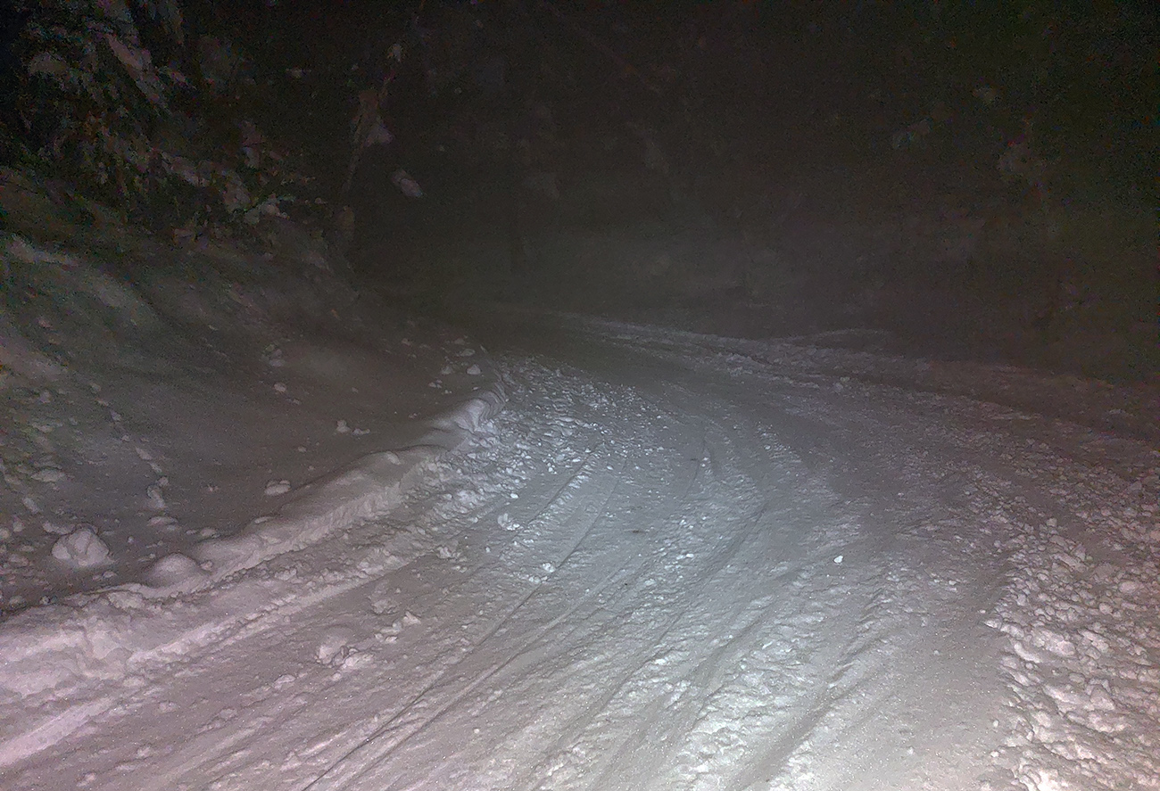 Chleb (v stredu z Trusalovej): Generál klasicky bubnovatý, horná, rovnejšia časť bez prekážok, v strmine kríčky a jafury ako slalomové bránky trčia na vrcholoch, je to vyšmýkané, všetky zrady viditeľné. Potom už dole cestou, kde len občas kamienok spod snehu ratračím pásom vyhodený striehne a na vari dvoch strmších miestach sú nejaké väčšie vyorance rozhádzané. Keď sme my za tmy nič nepochytali, za svetla no problem. Z drevoskladu aj les polyžovaný, ale išli sme slušne po turistickej zelenej až na Zajacovú, a zas – v strede občas piranie mláďa hlavu vystrčí, ale žiadne súvislé húfy tam nie sú, všetko obíditeľné. Turistický chodník zo Zajacovej do Trusalovej taký užší – pekne vyleštené výstupové stopy a popri nich sa v hlbšom snehu dá, ale bacha na skryté konáre. Po ceste je to rýchle, rovné, ujazdené autami, takže predvídateľné. Zlyžovali sme až k Markovi po okraji odpluhovanej cesty, úplne v pohode.