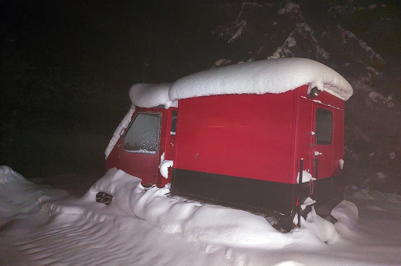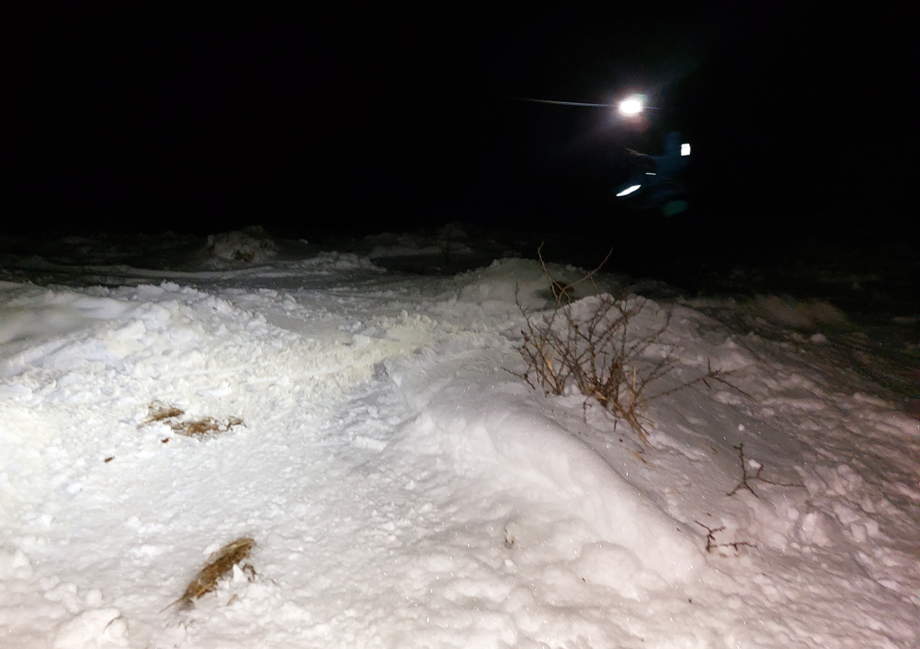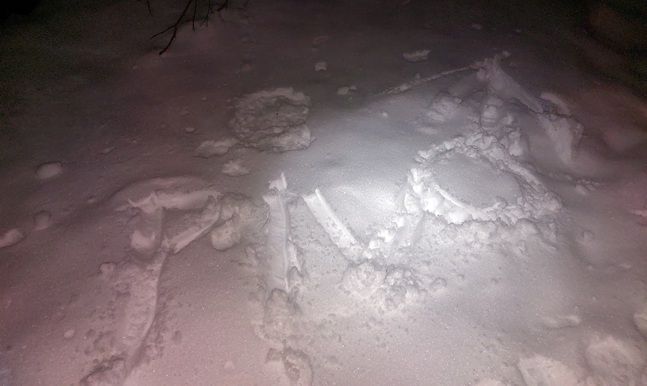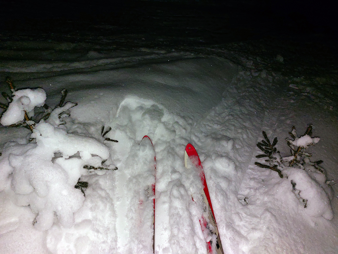 Chleb (v stredu z Trusalovej): Generál klasicky bubnovatý, horná, rovnejšia časť bez prekážok, v strmine kríčky a jafury ako slalomové bránky trčia na vrcholoch, je to vyšmýkané, všetky zrady viditeľné. Potom už dole cestou, kde len občas kamienok spod snehu ratračím pásom vyhodený striehne a na vari dvoch strmších miestach sú nejaké väčšie vyorance rozhádzané. Keď sme my za tmy nič nepochytali, za svetla no problem. Z drevoskladu aj les polyžovaný, ale išli sme slušne po turistickej zelenej až na Zajacovú, a zas – v strede občas piranie mláďa hlavu vystrčí, ale žiadne súvislé húfy tam nie sú, všetko obíditeľné. Turistický chodník zo Zajacovej do Trusalovej taký užší – pekne vyleštené výstupové stopy a popri nich sa v hlbšom snehu dá, ale bacha na skryté konáre. Po ceste je to rýchle, rovné, ujazdené autami, takže predvídateľné. Zlyžovali sme až k Markovi po okraji odpluhovanej cesty, úplne v pohode.