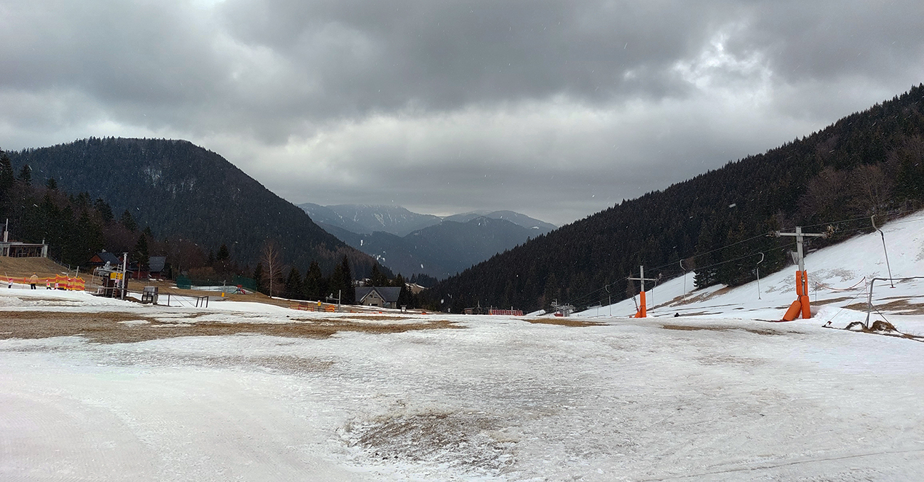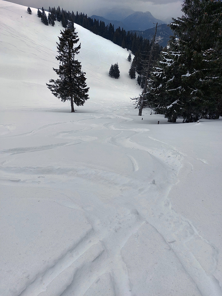 Skúsili sme ale oblúčiky spod Šiprúňa. Tak také premenlivé: hore ufúkaný prášok, nižšie hnusná kôrka a nad serpentínou cyklotrasy betónový firn. A ešte aj rozlyžovaný, hrčatý, z piatka a teplých dní, ktoré mu predchádzali.