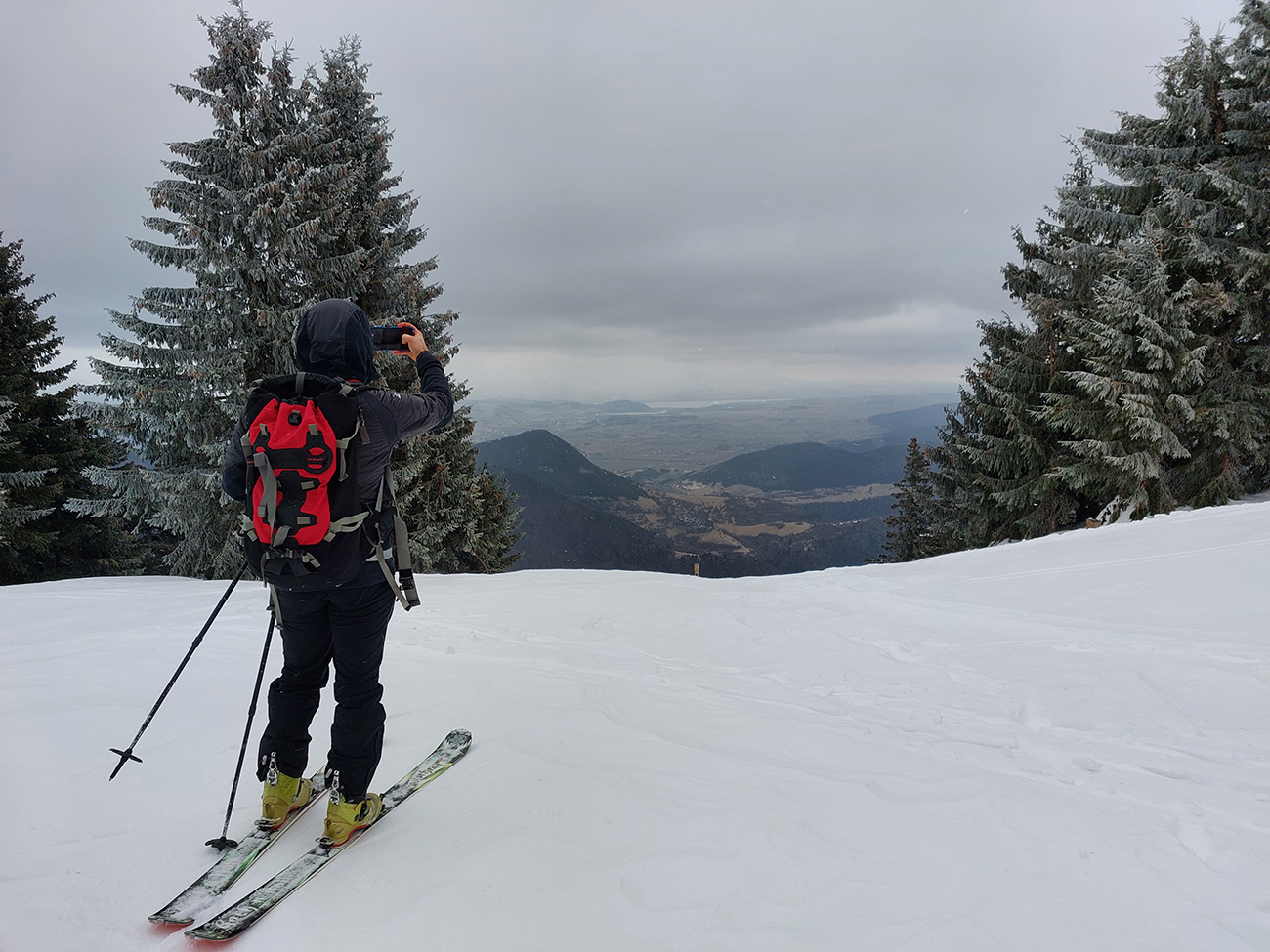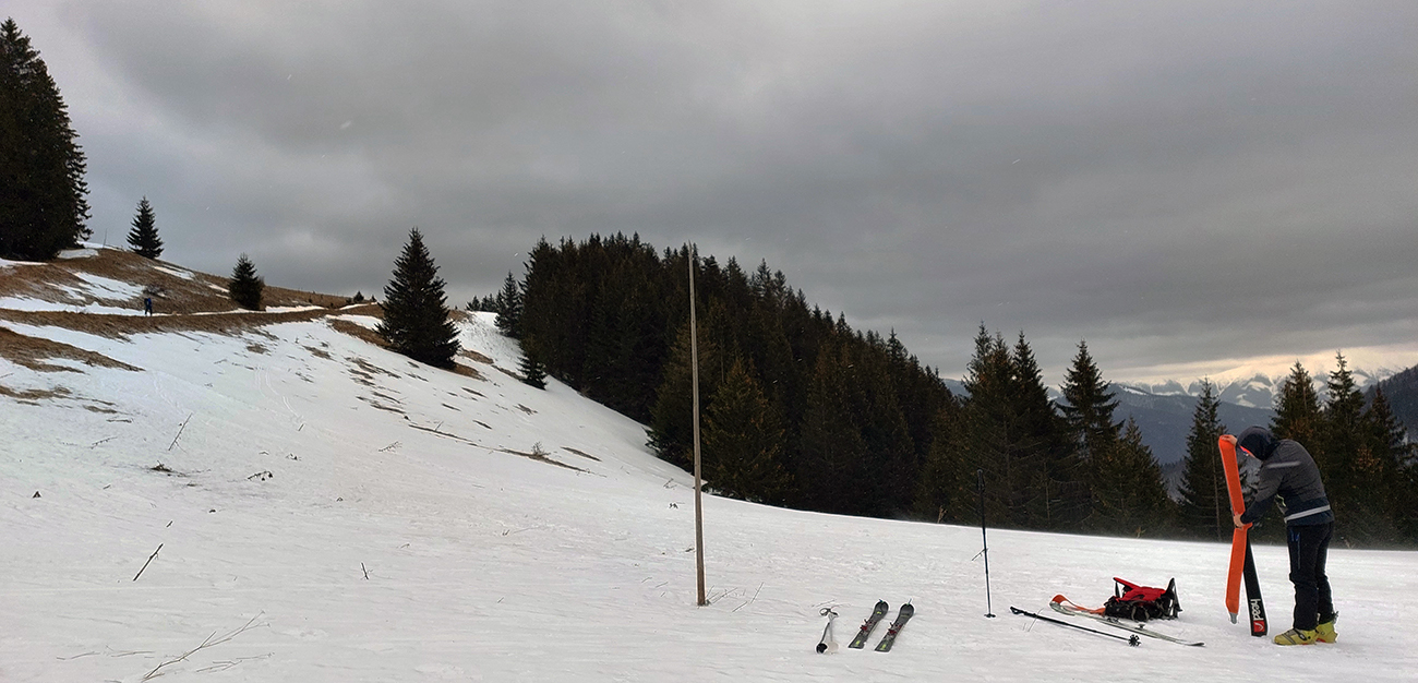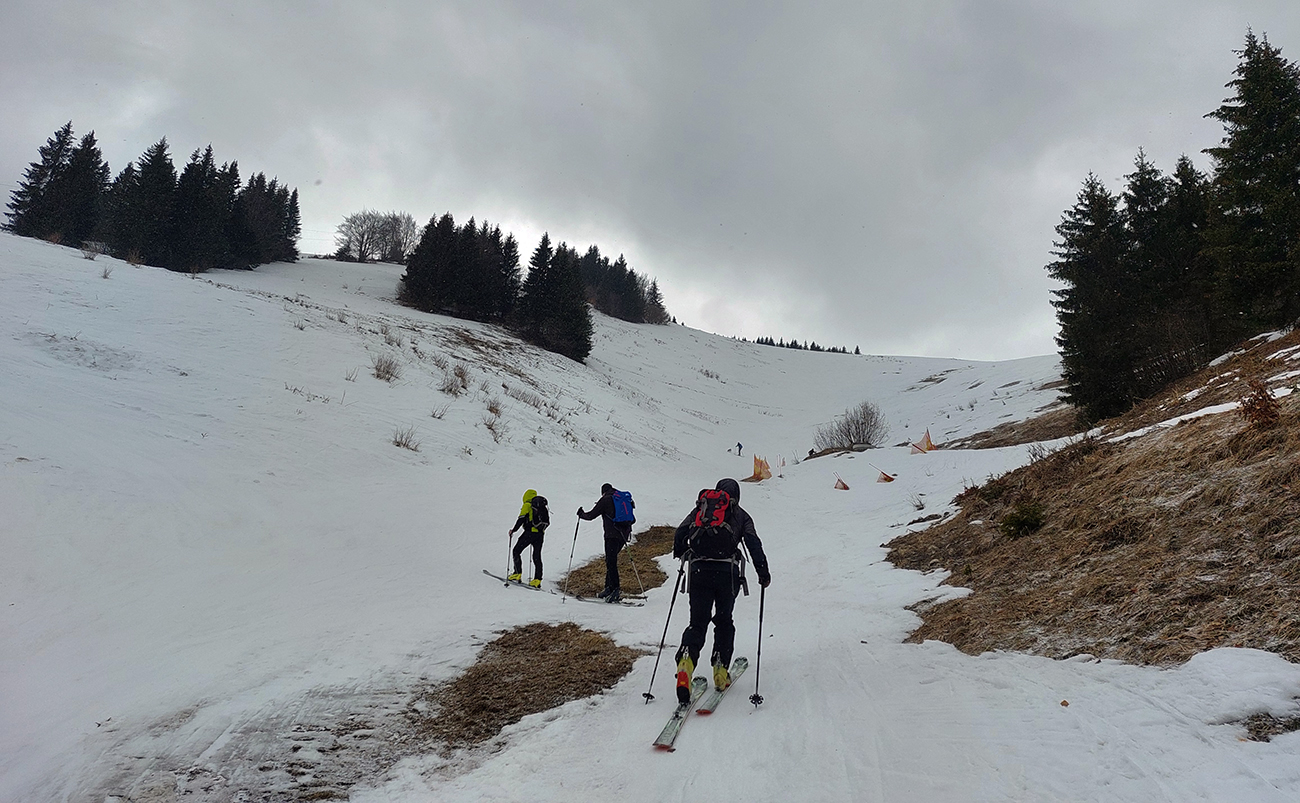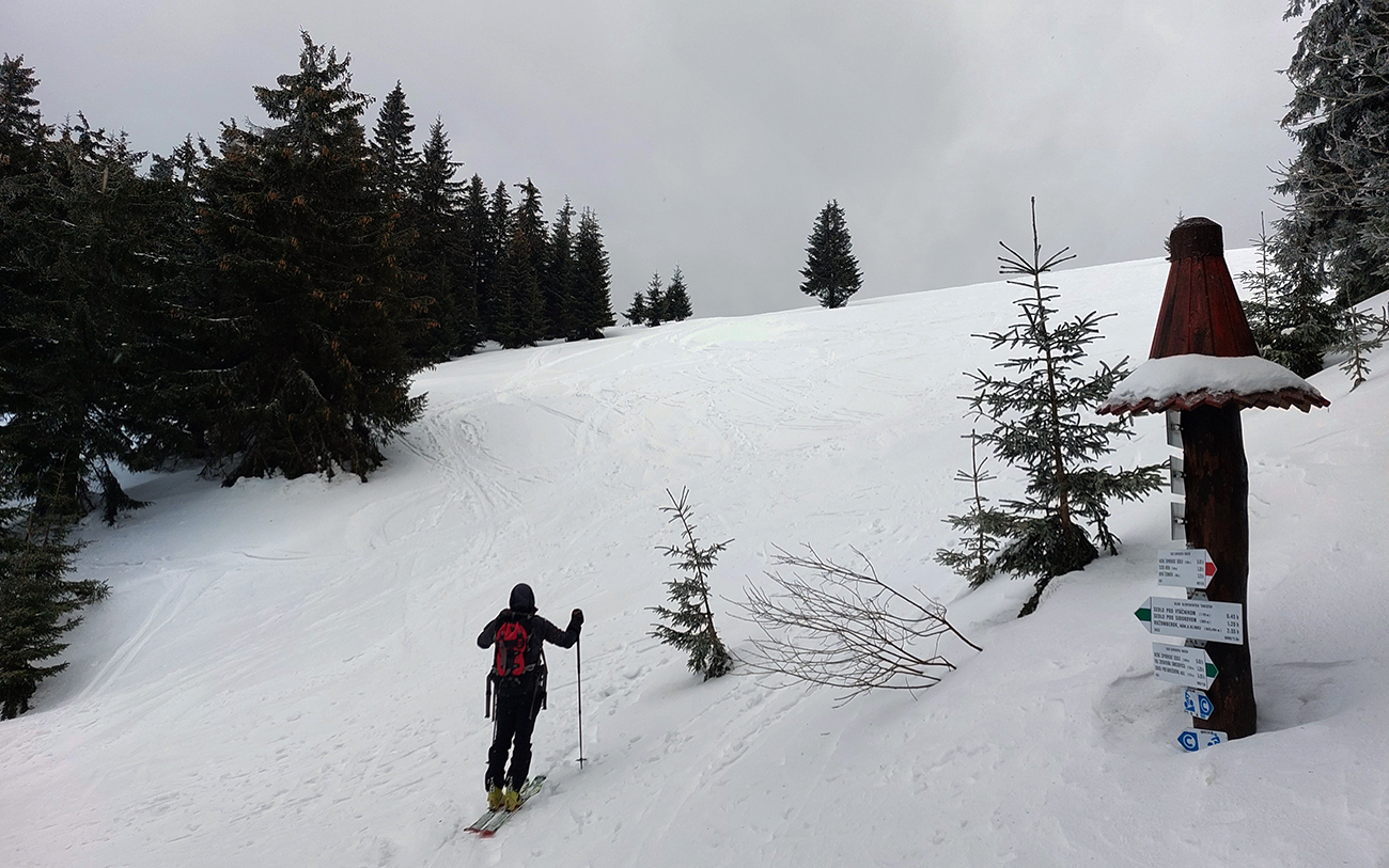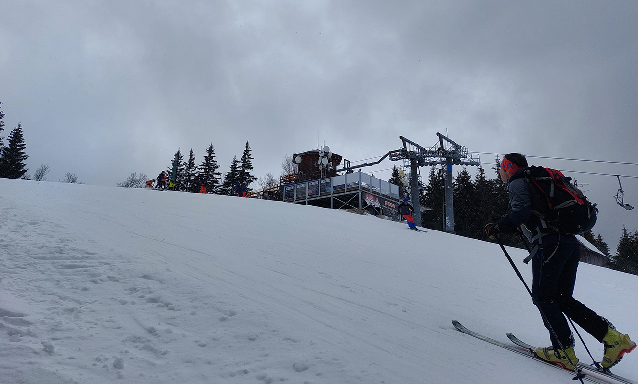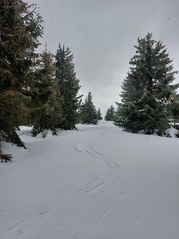 Napriek názvu boli podmienky aj hraničné, aj dobré. Ako je to možné? Tiež sme sa divili, aj keď tie hraničné podmienky dominovali. Ale že tam nájdeme aj prášok na pár oblúkov, to sme teda skoro neverili. Ale poporiadku. Prechádzajúci studený front v nedeľu 5.3. síce zabezpečil na víkend nevyhnutné zhoršenie počasia, jemné poletovanie snehových vločiek a trochu menej jemný severáčik, ale na druhej strane ešte nezabezpečil komfortné prekrytie na kameň zamrznutých, špinavých a hrboľatých firnov novým snehom. To hádam príde, predpoveď je sľubná. Brutálne teplá predošlých dní zase zabezpečili, že na južne exponovaných svahoch okolo Vtáčnika len tak – tak, že netreba lyže v rukách nosiť. Citlivejšie povahy asi aj nosia. Haršajzne sme nepoužili, no na niektorých miestach by trochu aj pomohli.