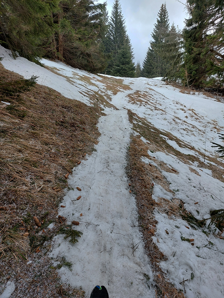 Traverzy lesom okolo Nemeckého vrchu už sú poriadne tragické - najmä na južnom svahu v závere, pred východom na lúku, lepšie ísť možno aj pešo ako na pásoch. Aj zopár poriadne „zúžených miest“ a špinavý ľad.