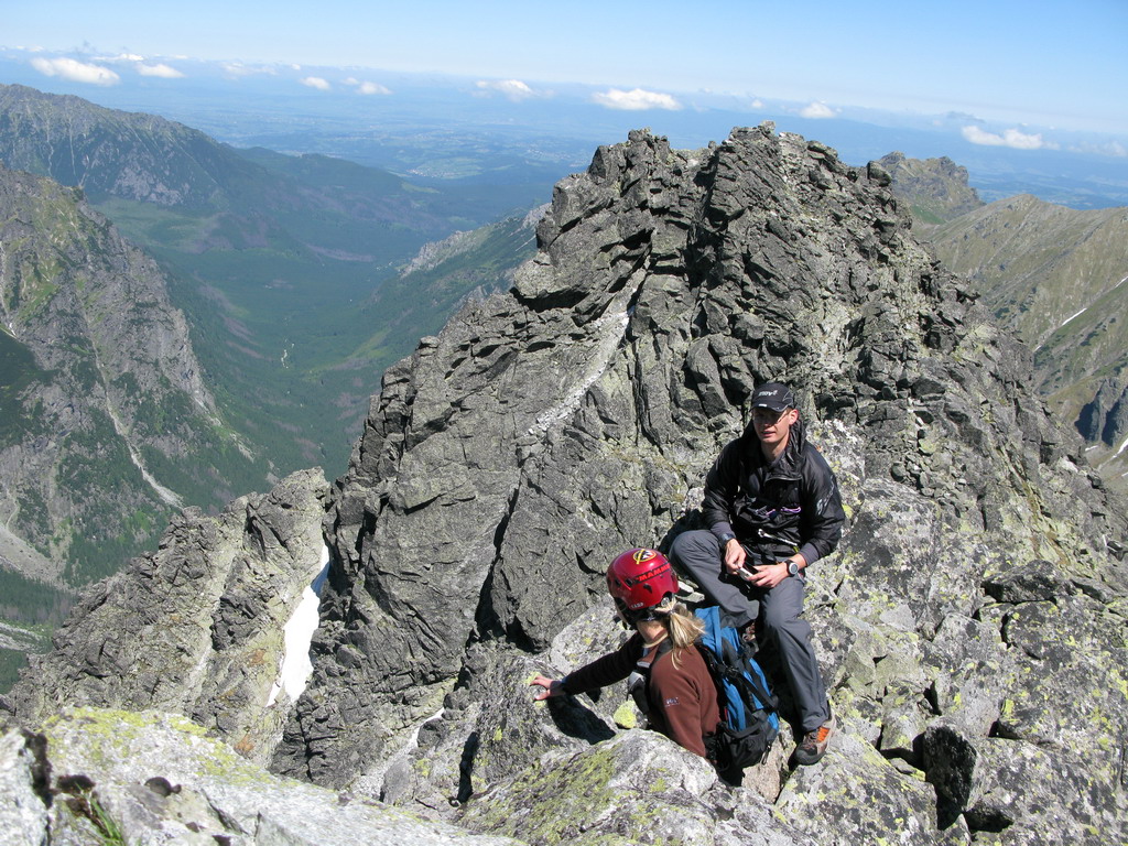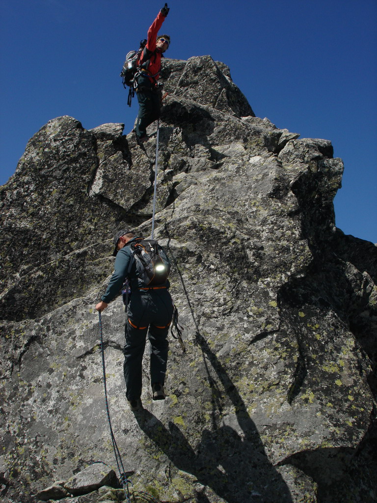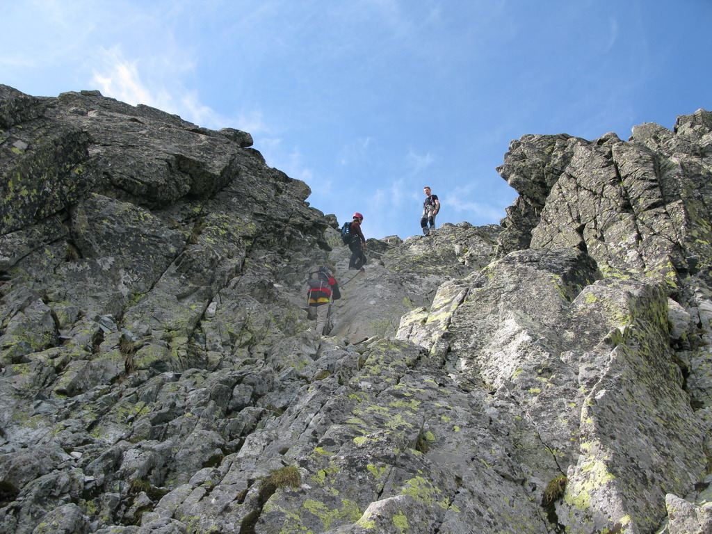 O „Martinovke“ som počula už pred dvomi rokmi. Zdalo sa mi to už vtedy ako riadny kus cesty. Keďže sme si dali skratku až z Litvorového sedla, bolo viac času na kochanie a kľudné preliezanie trojkovým terénom. Pomenej mužíkov síce predlžovalo cestu hľadaním tej naj, ale tatranská žula sa nedala zahanbiť a kade sme sa pustili, tade nám ponúkala parádne chyty a stupy. Ale aby som neprechválila, jasné že boli aj miesta, kde sme si dali lano a pekne sa istili. Lano sa zišlo aj pri zostupe, zlanenie šetrí kolená.