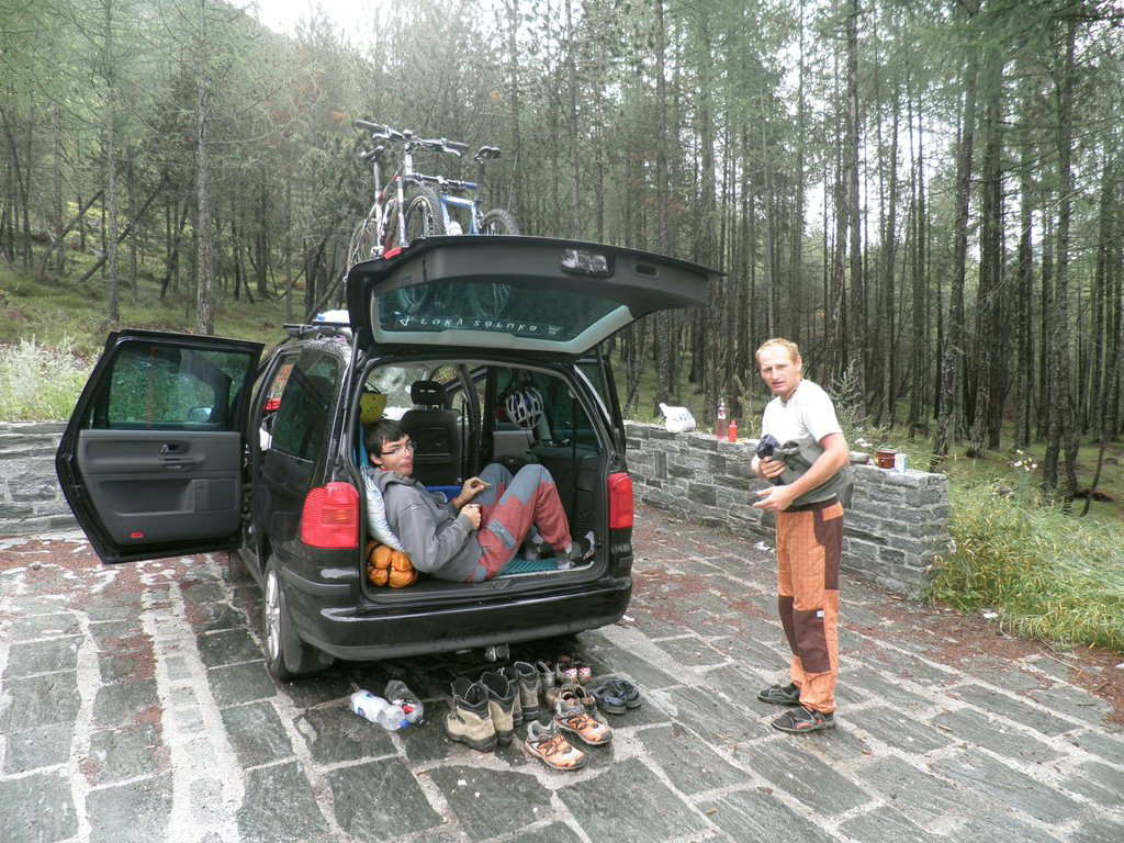 Na asfalt sme sa napojili už za poriadneho šera a do Bormia došli po tme. Dorazili sme sa naháňačkou v 80km/h, vo Valfurve sme si ešte vyhliadli odbočku do Val Zebru, euforicky sa rozplynuli nad krásnymi domami, rozdýchali trasúce sa kolená a vyšliapali už v totálnej tme na parkovisko-nocľažisko pri ceste na Stelvio. Zajtra ďalšia čerešnička - Goldseeweg...