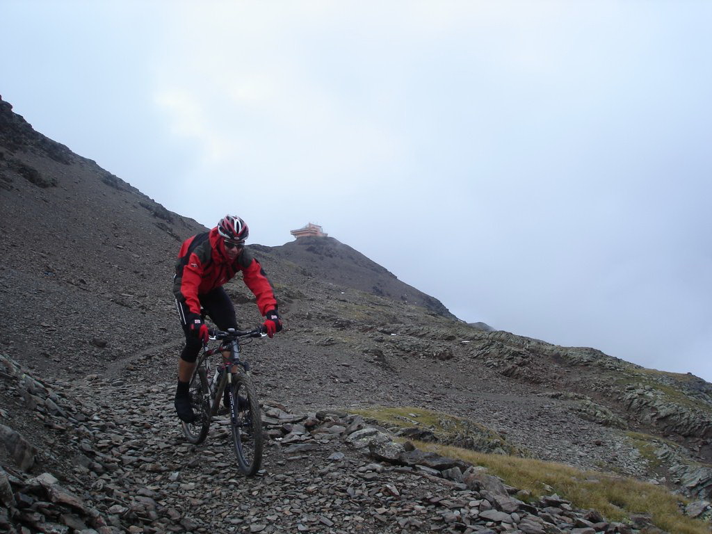Priamo v Bormiu je lyžiarske stredisko, ktorého najvyšším bodom je vrchol Cima Bianca. Nachádza sa južne od Bormia, takže stredisko je na severných svahoch. Z mapy som skúmaním vrstevníc vydumal, že by nebolo zlé vystúpiť hore po zjazdovkách a spustiť sa dolinou na juh. Je to 1800m prevýšenia. Stúpa sa priamo z Bormia. Treba sa najprv vybrať z centra smerom na Passo Gavia a odbočiť doprava smerom na Bormio 2000. Je to jednoduché, lebo kopčisko je to poriadny a treba ísť furt len hore. Výšľap sa vo výške 2000m.n.m. premení z asfaltového na šotolinový priamo po zjazdovkách a je väčšinou veľmi prudký. Na najľahší prevod, špičku sedla do zadku a pokorne sa trápiť. Na vrchole je horná stanica lanovky s reštauráciou a výbornou kávičkou. Mali sme tam 6st. C a mrholenie striedala oblačnosť.