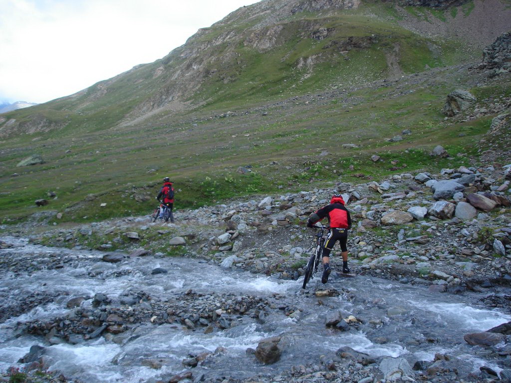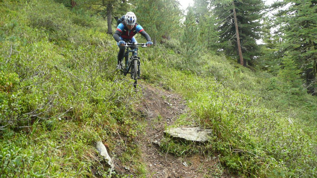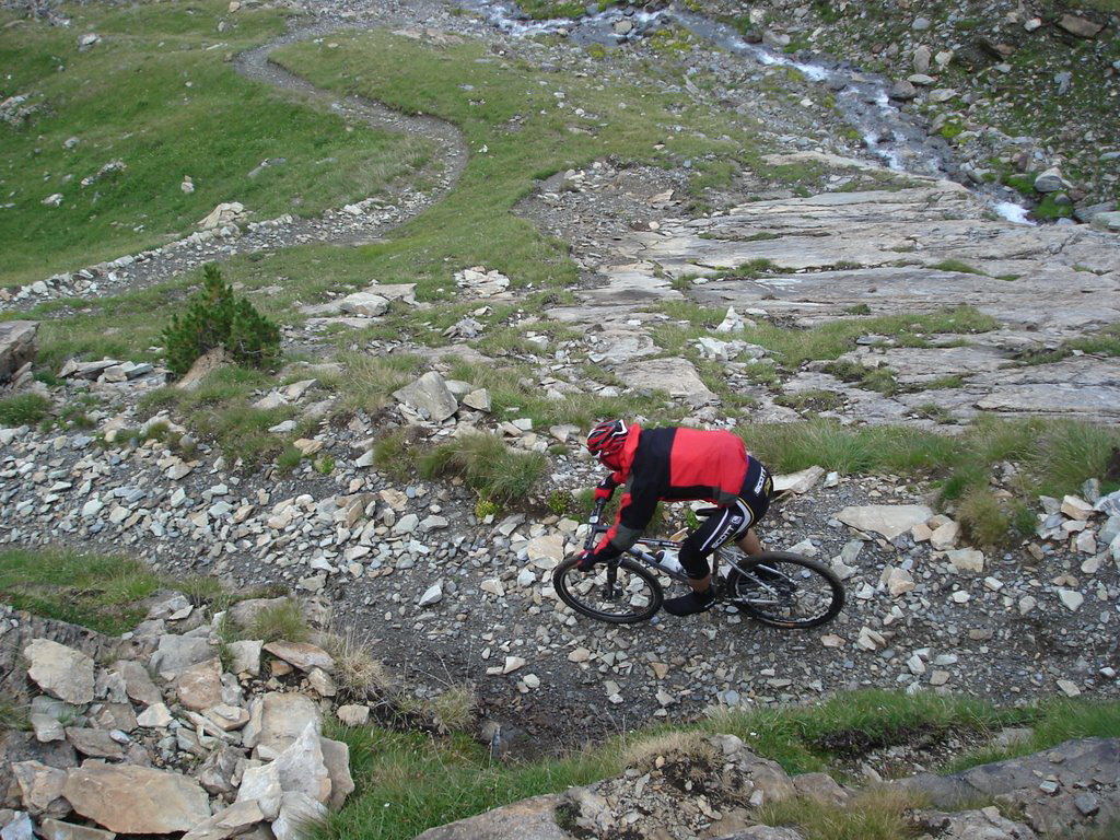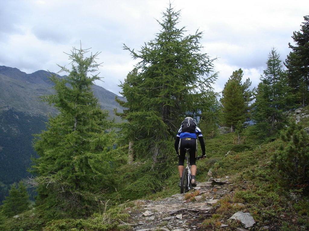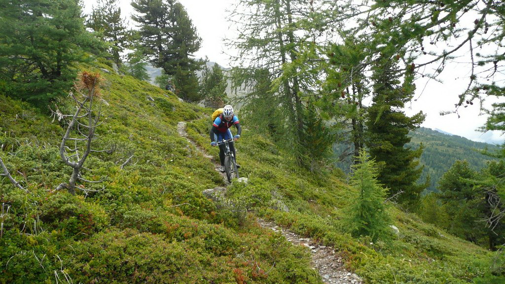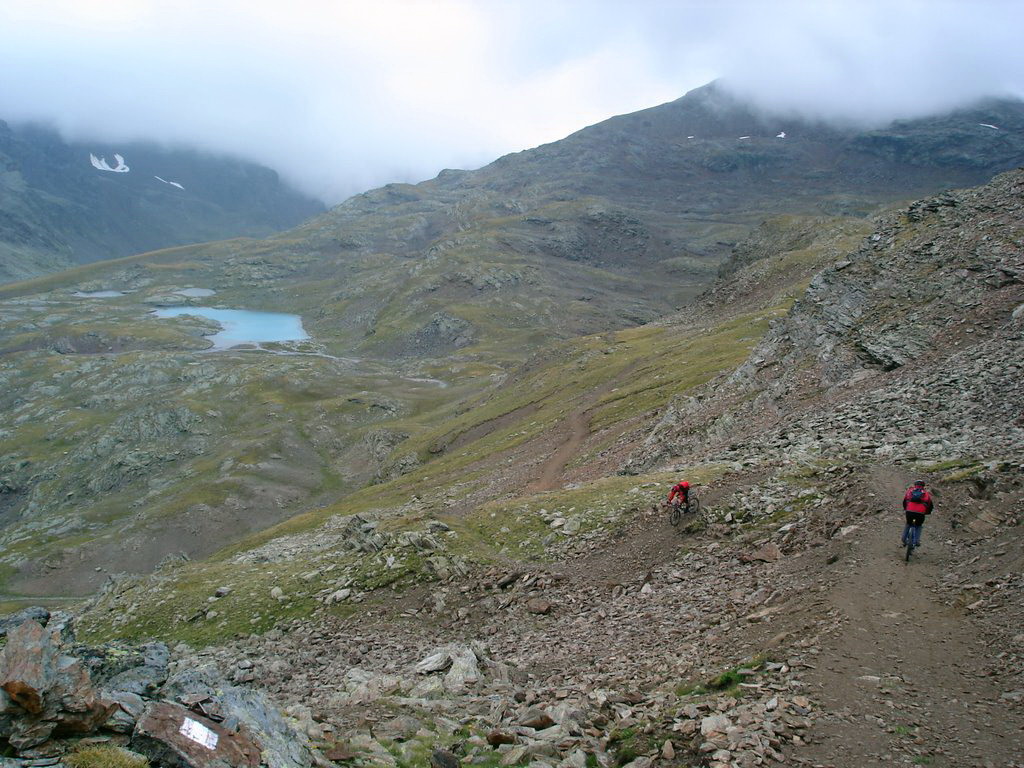 Zjazd vedie po kamenistom chodníku k plesám. Táto časť nie je s výnimkou zlomov serpentín extra technicky náročná. Pri plesách Bei Laghetti 2715m.n.m. sa odbočí doľava a začína pásmo alpských lúk. Technická náročnosť ostáva zachovaná a drží si slušný štandard. Stretávame voľne sa pasúce kone. Priamo dolu v doline nad lesom je vidieť nejakú maštaľku vidno, že odtiaľ začína už aj hladká šotolina. Nejdeme tam, lebo hladká šotolina je málo technicky náročná a pre zjazd vyhľadávam radšej náročnejšie povrchy. Púšťame sa teda do traverzu hrebeňa, ktorý uzatvára dolinu zprava (pri pohľade dolu dolinou). Túto variantu opäť čítame z mapy bez akéhokoľvek slovného popisu. Pretraverzujeme dve malé rebrá po technicky dosť náročnom, trávnato balvanovitom hore-dole povrchu a chodník začína klesať šikmo svahom ponad dedinku Santa Caterina Valfurva. Týmto svahom vedie viac turistických značiek, v ktorých nie je také ľahké sa zorientovať a zistiť, kde presne na mape práve sme. Naša trasa pretla zjazdovku vedúcu dole do dediny a vyústila na serpentínach nad Santa Caterina Valfurva vedúcich na Passo Gavia. Tento záverečný úsek lesom od spomínaných rebier až dokonca je z celého zjazdu najnáročnejší a je technicky naozaj veľmi náročný. Sú tam balvany, hlina, korene, potoky polmetrové schody a veľmi strmé padáky, ktoré sú navyše strmými traverzami. My sme to mali navyše mokré. Dá sa to však všetko v sedle.