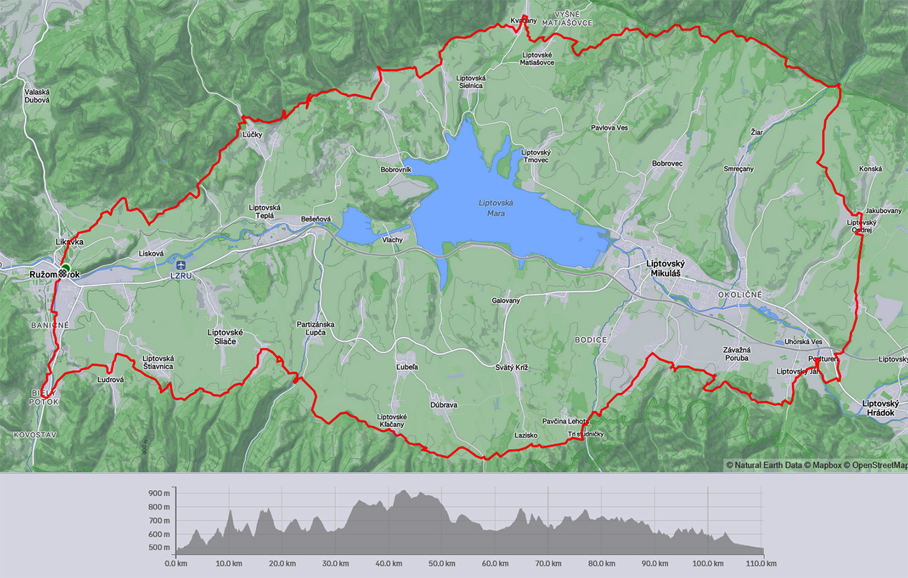 Už som si Maru obišiel na žiletke ( TU ), teraz mi napadlo skúsiť to na horskom. Pekne podhoriami Chočských vrchov, Západných a Nízkych Tatier, nie nutne po cyklotrasách, ale aby to malo logiku, estetiku, a aby z toho vznikol nejaký rozumný okruh. So začiatkom a koncom v RK, aj keď lepšie by bolo ráno začať niekde na opačnom konci, aby slnko na začiatku nesvietilo do očí. Cieľom však nebolo len hlušiť kilometre „do mŕtva“, ale potiahnuť trasu aj po zaujímavých miestach, ktorých je tam samozrejme veľa. Pri klikaní do mapy ma síce trochu prekvapila tá dĺžka, ale zas na dlhé letné dni prečo nie? Po necelých 10 hodinách ukázali teda hodinky 110 km a 2900 výškových nastúpaných metrov (gpx je hore). Super to bolo, na začiatku výživnejšie, ku koncu pohodovejšie a rýchlejšie, len si treba v lete vybrať chladnejší deň, keď majú ovady dovolenku: