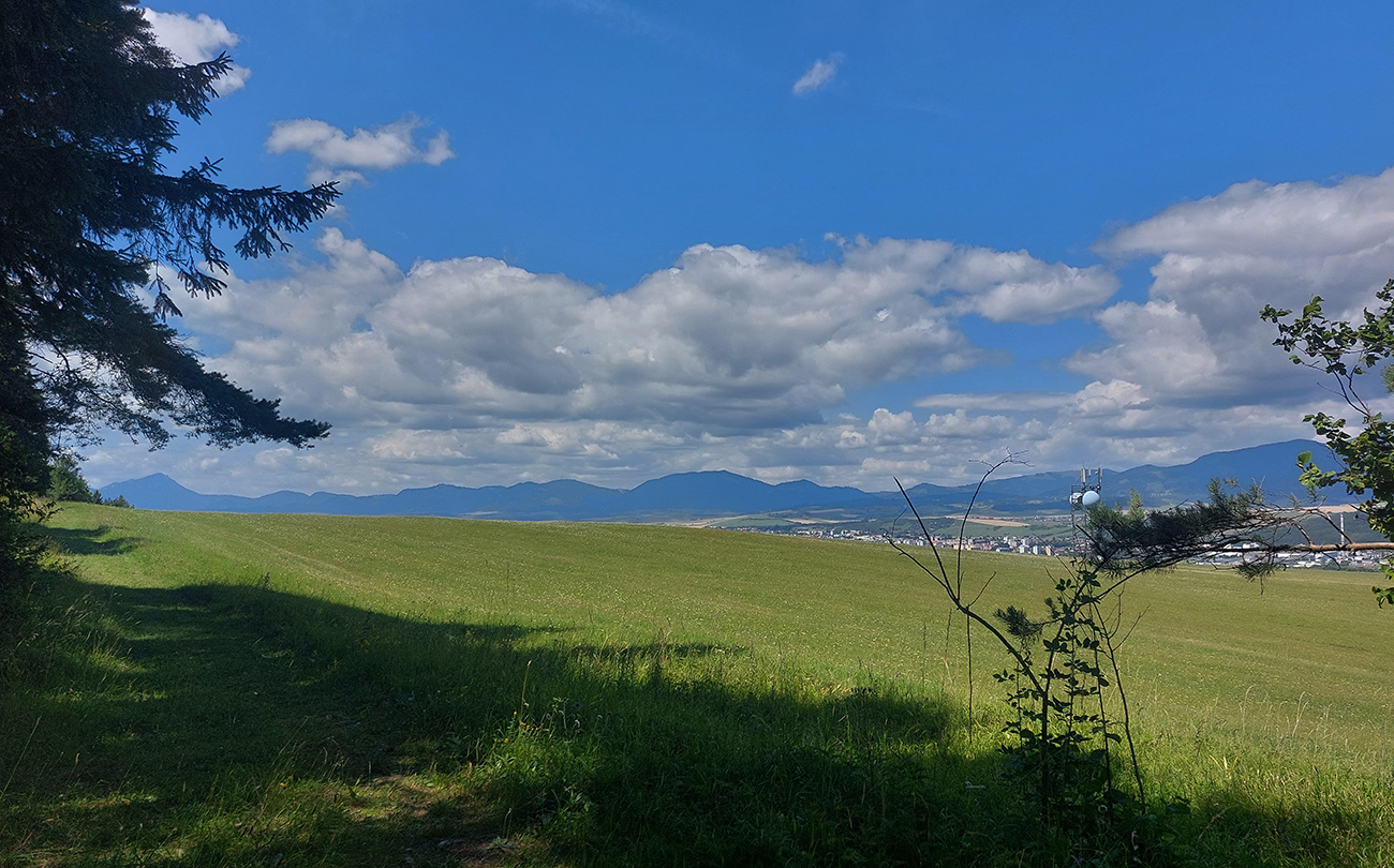 Podobne krajinársky príjemné a nie veľmi strmé je to do Kvačian, po obľúbenej pešej trase, hojne využívanej na uzavretie okruhu cez Prosiecku a Kvačiansku dolinu. Takže aj ľudí už bolo. A výhľadov do kotliny – konečne som aj tú Maru už občas zazrel a vpredu Západné Tatry: