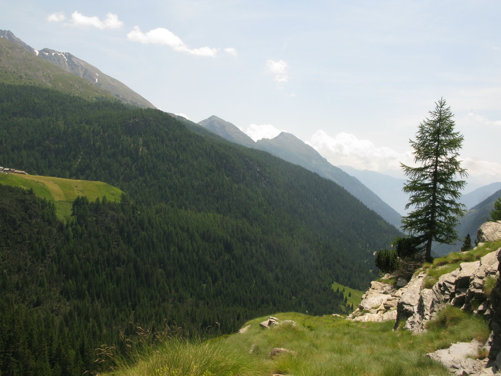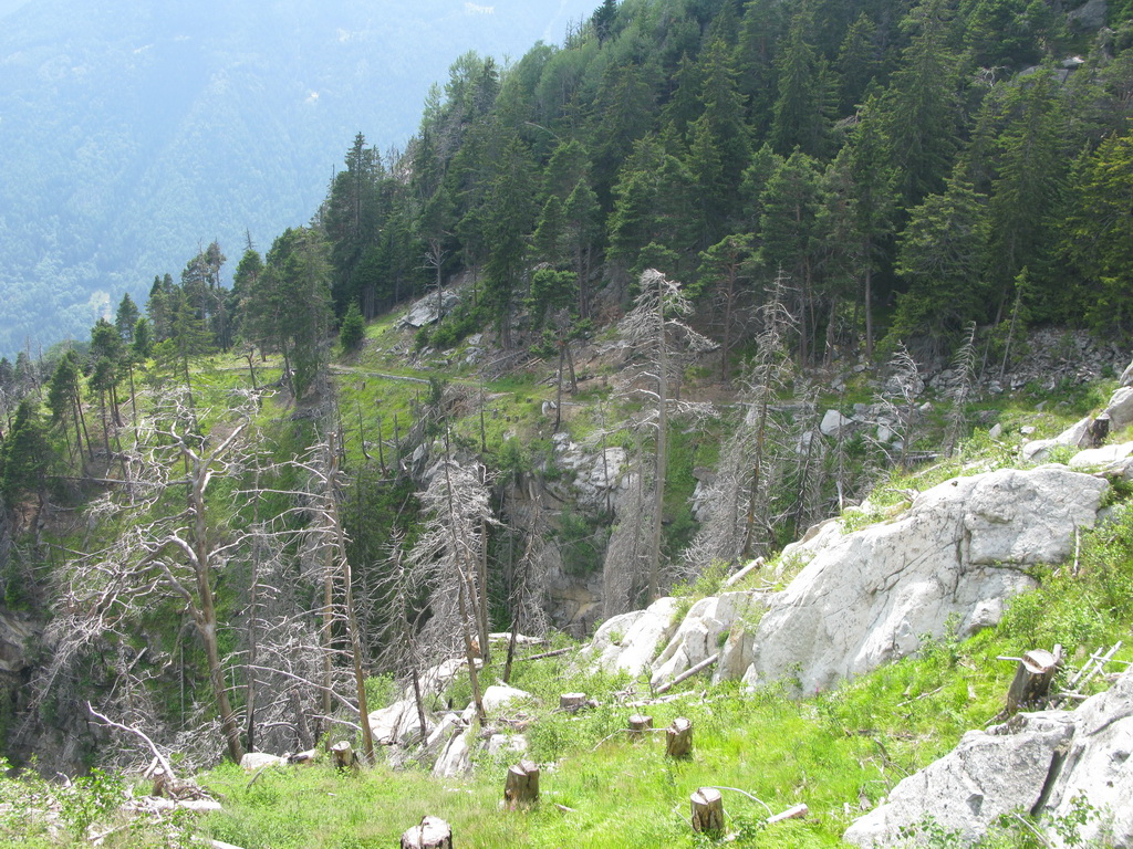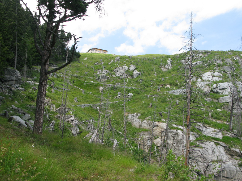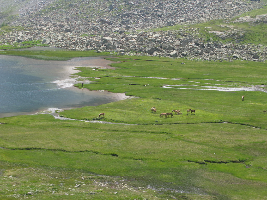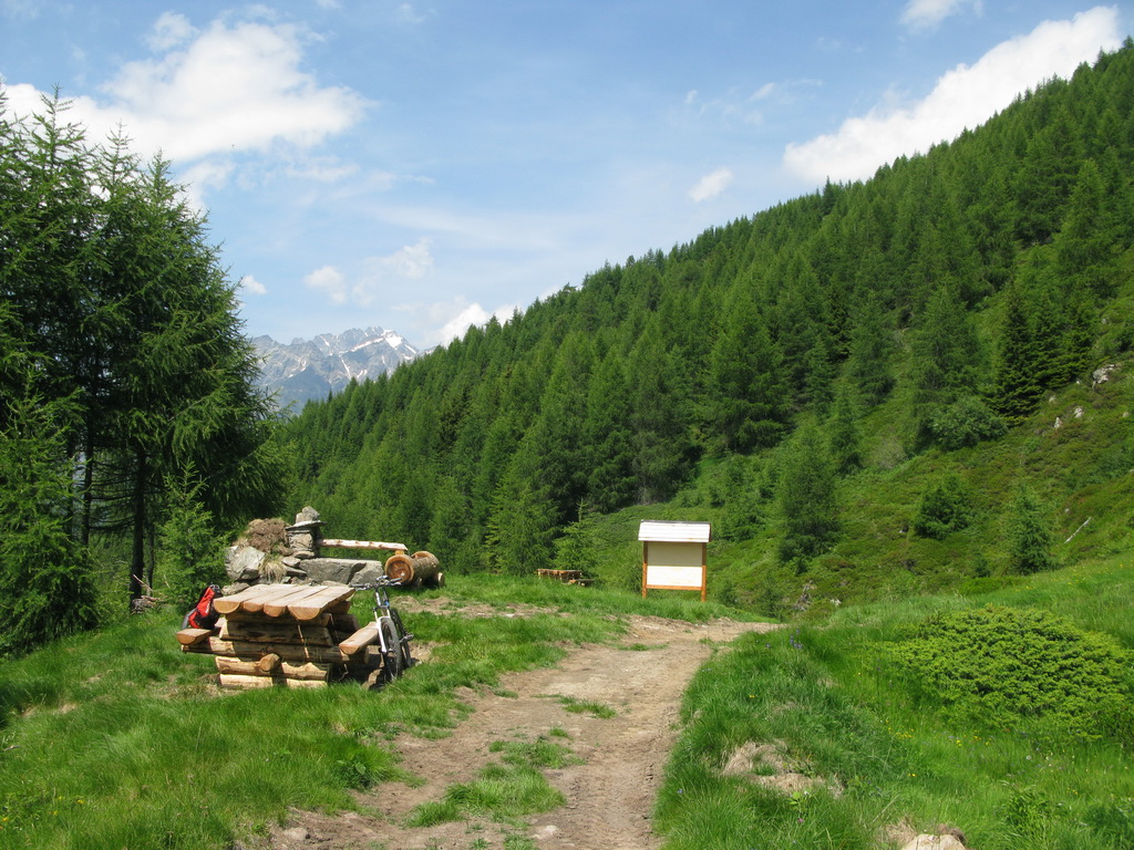 Značka nakreslená na mape kúsok za chatou zmizne, sú tu len chodníčky prešlapané kravami. Všade je blato a bažina. Podarí sa mi dostať sa cez to pomerne suchými nohami. Cesta ktorú vidím v ďiaľke mi hovorí, že nemôžem zablúdiť. Takto sa po chvíli predierania cez kosovku, prenášanie bajku a obchádzania jazierok na lúke dostávam opäť na cestu. Pri usadlosti sa pýtam taliana na cestu, zisťujem že aj tak musím zjazdovať dole.