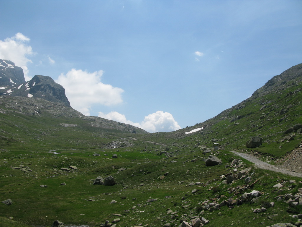 Passo Verva (2301m). Stúpanie bolo pohodlné, fotím výhľady, napravo sa vypína masív Cima Piazzi. Mohutný kopec, zaujímavý aj v zime. Nestretávam nikoho okrem pastiera z neďalekého salaša, je to tu predsa len od ruky. Zjazdujem dole smer Val Grosia, otvárajú sa mi nové výhľady. Fotím pekné jazero a kúsok pod ním zastavujem pri odbočke smer Rifugio Falck 1950m. Potrebujem traverzovať a preto odbočujem ku chate. Na mape je zaznačený chodník. Pred chatou je skupinka domácich, pozerajú na mňa ako na zjavenie. Vysvetľujem chlapíkovi kam sa potrebujem dostať. Hovorí niečo o vode ale vraví aby som išiel ďalej, že to zvládnem :)
