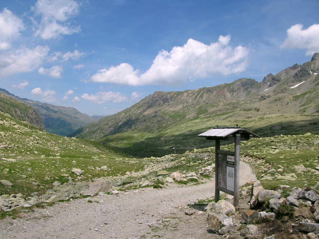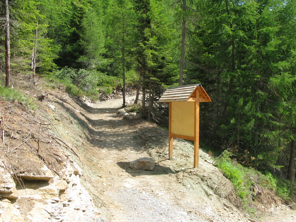 Vychádzam na lúky s usadlosťami, miesto zvané Baite Redasco 1896m. Mám pochybnosti o tom, či tu vôbec bude niečo ďalej zjazdné, keď zazriem v dialke už známu tabuľu, rovnaký typ ako na Mortirole a na Col dAnzane. Za ňou vidieť chodníček zarezaný do svahu. Vyzerá byť pomerne čerstvo spravený...