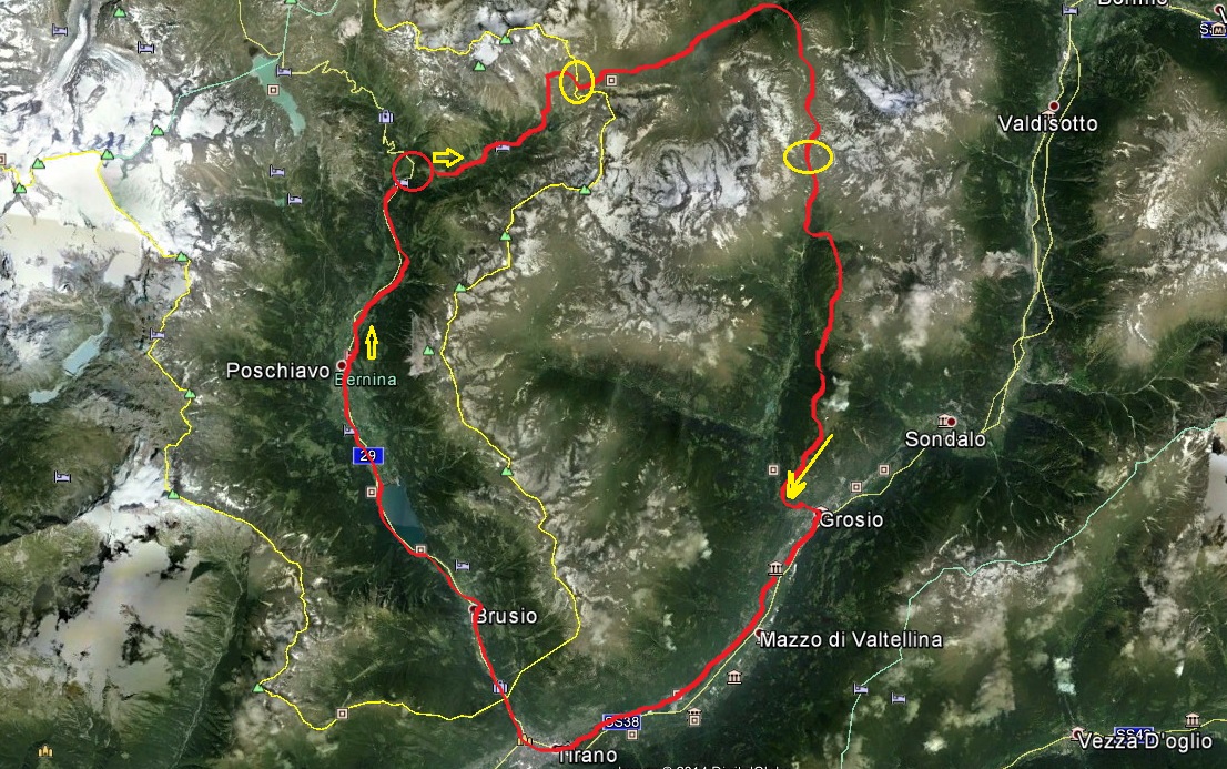 Po cca 200 výškových metroch zjazdu sa dostávam na križovatku, odbočujem vľavo a po kvalitnej štrkovej ceste traverzujem masív , ktorý uzatvára Monte Storile. Kopec nad mestečkom Grosio vo Valtelline. Úbočím tohto kopca by mal viesť ďalší z Valtellinských superzjazdov, takzvaná LaGrosina. Traverzujem vysoko nad údolím Val Grosia a vychutnávam výhľady pre mňa úplne nové.