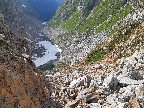 Výšľap trailom do Passo Val Viola už poznám naspamäť a v závere už presne viem, ktoré úseky potlačím a ktoré absolvujem v sedle. V zjazde do Val Violy použijem hore pár skratiek, a potom už šotolinou dole oproti davu turistov, mieriacich na chaty. V doline spamäti triafam odbočku na šotolinu a po krásnych serpentínach sa v sedle dostanem až po Baitu del Pastore. Tu odbočujem vpravo na chodníček. Zakrátko zosadám a začínam tlačiť smer sedlo Valleccia.
