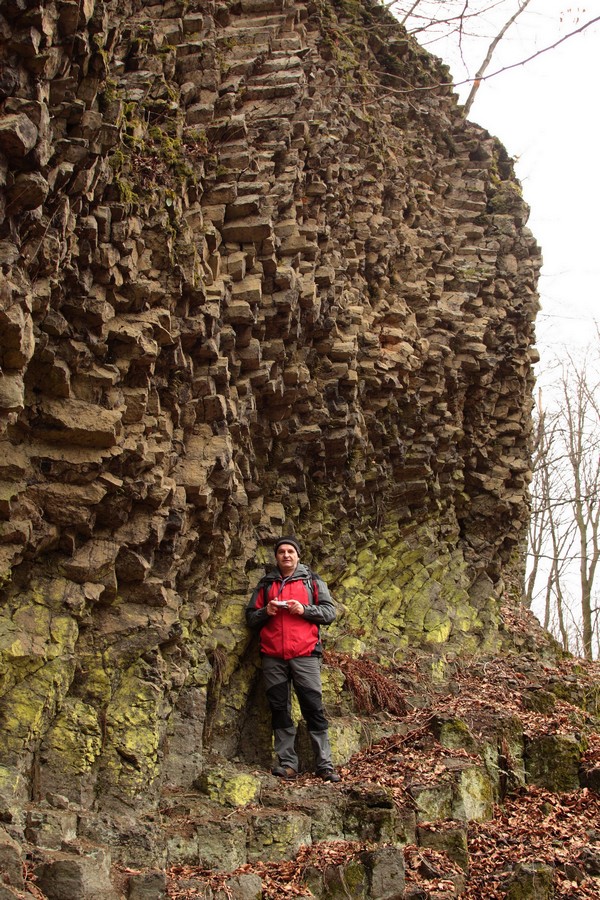 Široká a mierne rozbahnená lesná cesta nás už po pár desiatkach krokov doviedla k prvej z informačných tabúľ. Na naše príjemné prekvapenie boli písané aj po slovensky. Hovorili o histórii ťažby uhlia a bazaltu (čadiča) v tejto oblasti, čím objasnili pôvod miestnej atrakcie. Po niekdajšej ťažbe tu ostali odkryté 20 metrov vysoké skalné steny s typickou čadičovou odlučnosťou. Čo už je tak trochu raritou, je odlučnosť vo dvoch rôznych na seba navzájom kolmých smeroch. V areáli pod Nagy Szilvás-kő sú dva takého odkryvy, jeden manší a jeden väčší. V rámci bezpečnosti sú obohnané novučičkým dreveným zábradlím a doplnené infotabuľami. Teda zatiaľ len stojanmi, časom zrejme pribudne aj text :o)