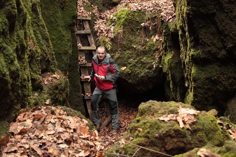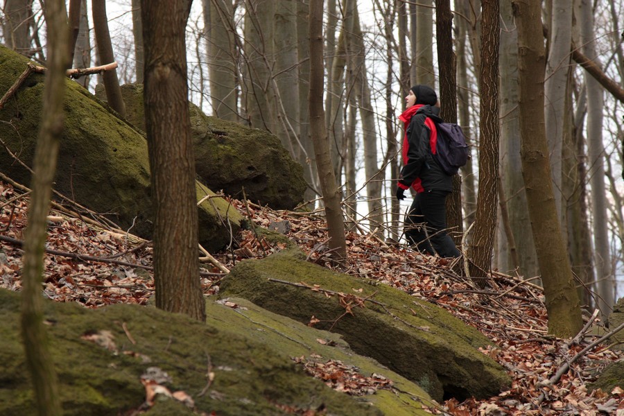 Odtiaľ sme už miernym stúpaním dosiahli vrchol Nagy Szilvás-kő (625 mnm). Výhľady so skaly sú aj v zime len obmedzené, skromná diera pomedzi stromy sa otvára len smerom na Tachty a Cerovú vrchovinu a čiastočne cez Szilváspuszta na východ. Nás však viac zaujali rôzne diery a prepadliny v skale, ktoré vraj vznikli zbortením banských chodieb. Čím viac sme sa vzďaľovali od vrcholu, tým sa praskliny viac otvárali a prehlbovali, až vytvorili steny akéhosi kaňonu. Pri informačnej tabuli, ktorá odhaľuje príčiny zlyhávania kompasu, sme už značku opustili a hnaní zvedavosťou zliezli medzi skalné steny. Kaňon má odhadom (v tomto som slabá, ale skúsim to) dĺžku 100 m a hĺbku do 15 m, dno je vystlané hrubou vrstvou lístia a steny obrastené machom. Je celý priechodný, na dvoch miestach to uľahčujú polorozpadnuté rebríky a staré horolezecké laná, ale my sme ho celý neprešli. Posledný úsek a výlez z kaňona je dosť strmý, úzky a zrejme aj po štyroch. Ale dá sa.