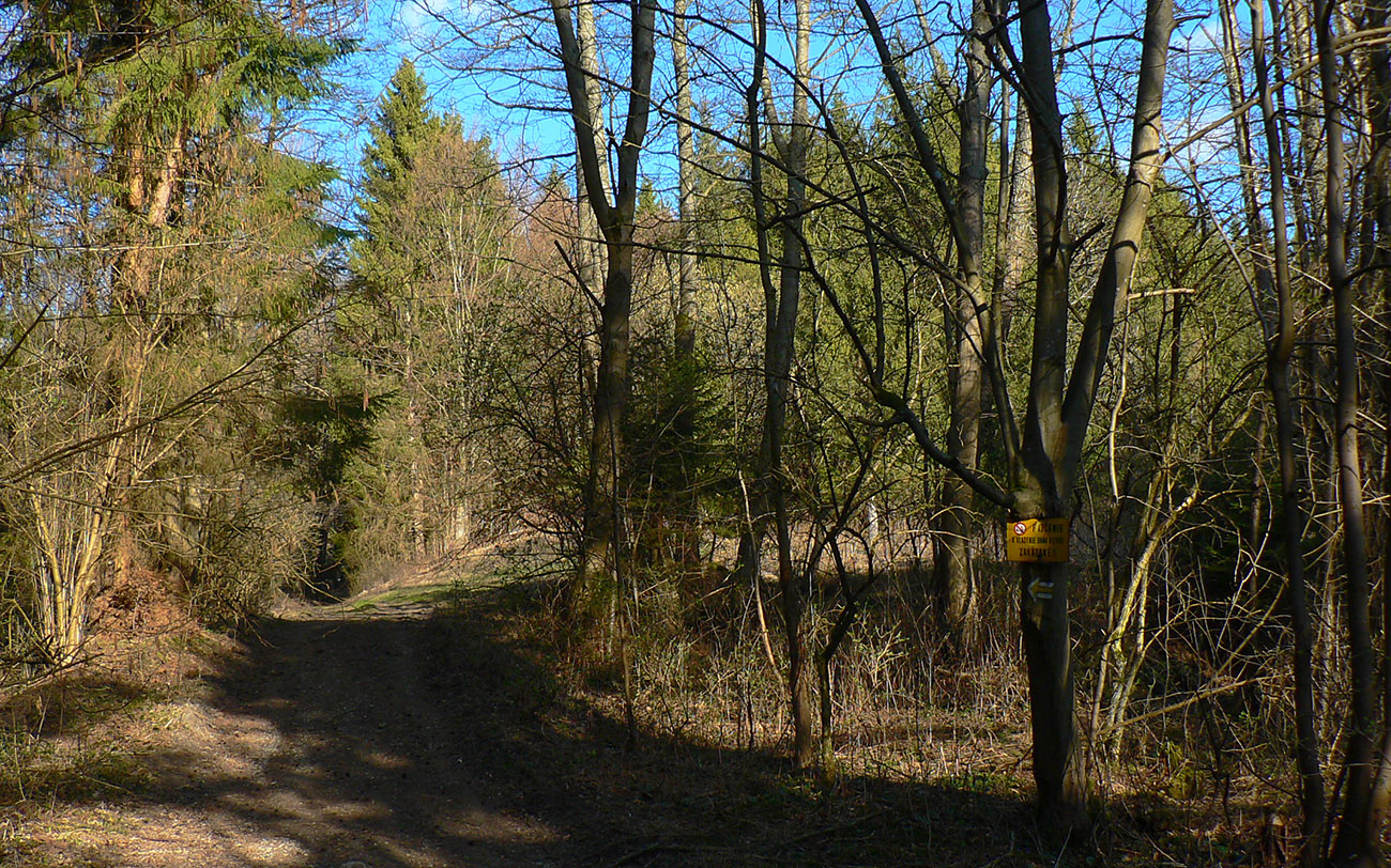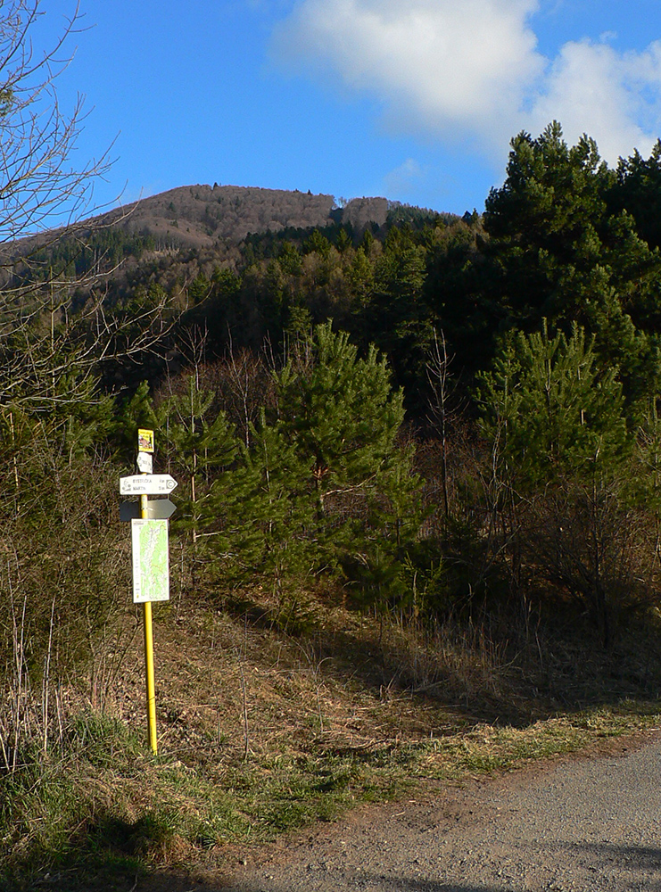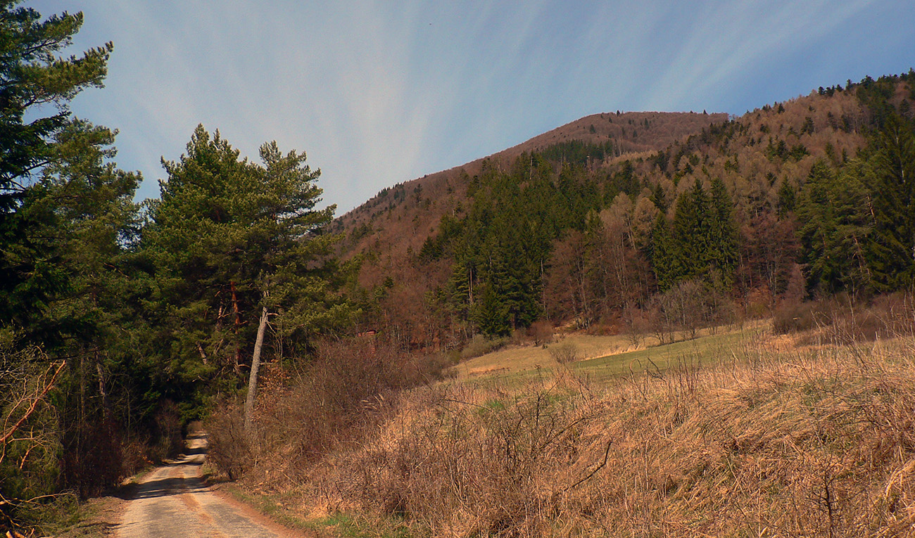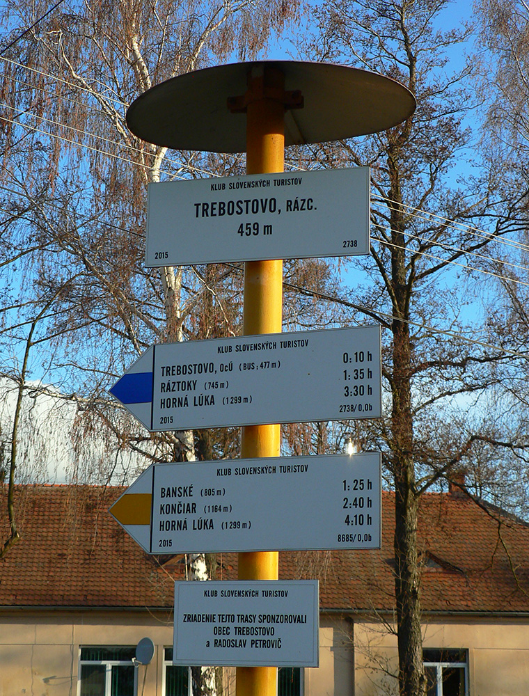 Značky začínajú na dolnom konci Trebostova, naproti obrovskému révayovskému kaštieľu, ale radšej sme potiahli nad dedinu a nechali služobné auto v ústí doliny, na križovatke s bývalou „tankovou“ cestou. Po nej sme prešli asi kiláčik na sever (pekné výhľady do kotliny) a tam sme sa napojili na tú žltú z Trebostova. Vľavo vbok a hneď sme začali zostra stúpať.