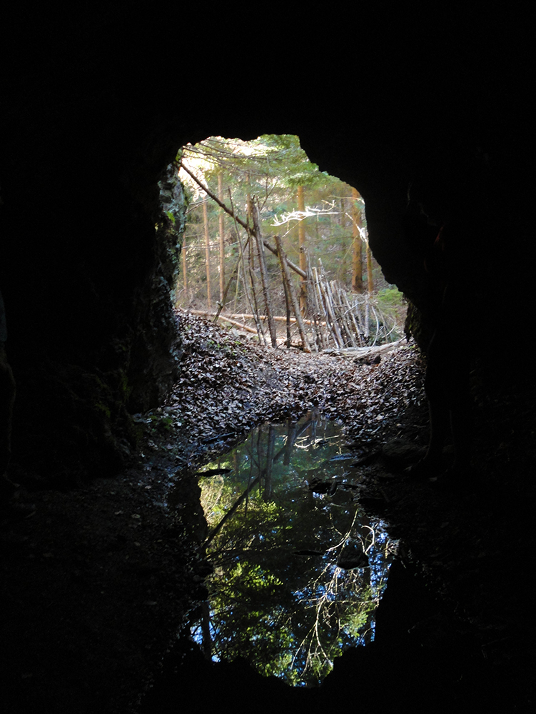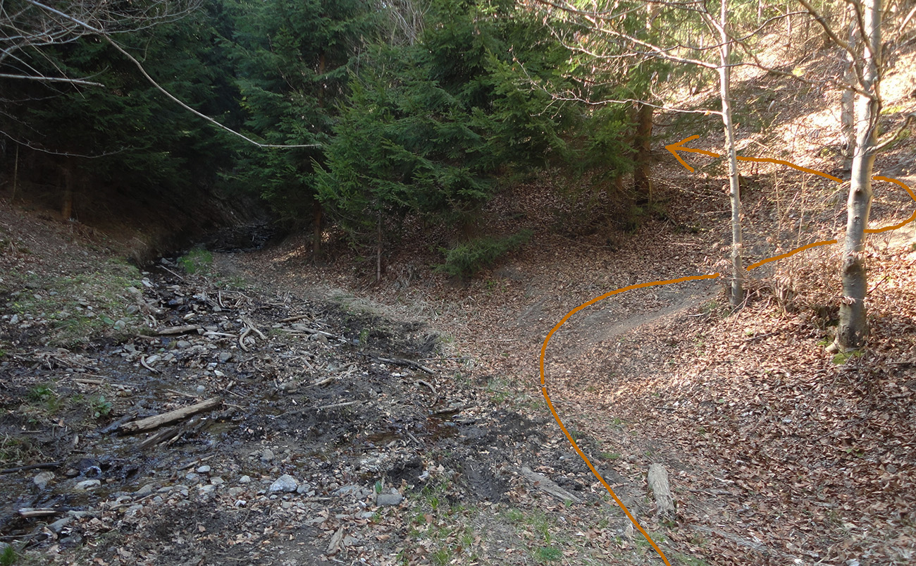 Začiatok je taký klasicky lesohospodársky – krížom cez zvážnice a rúbane, lesy rôzneho veku. Ešte dole sa oplatí spraviť malú zachádzku k opustenej banskej štôlni - nie je to značené, treba si nájsť podľa mapy chodník k nej. Alebo podľa fotiek tu v galérii. Je priamo nad potokom. Potom nazad na žltú a začne ten prudký výstup. Nad smerovníkom Banské sa chodník na chvíľu položí do miernejšieho traverzu. Ale na vyváženie to zaklincuje poriadne strmý výplaz po spádnici na hrebienok pod vrcholom. Len po hline, za mokra isto poriadna sranda, aj za sucha miestami na 4x4.