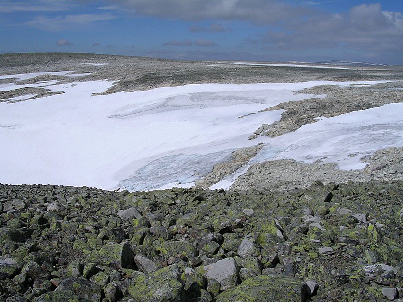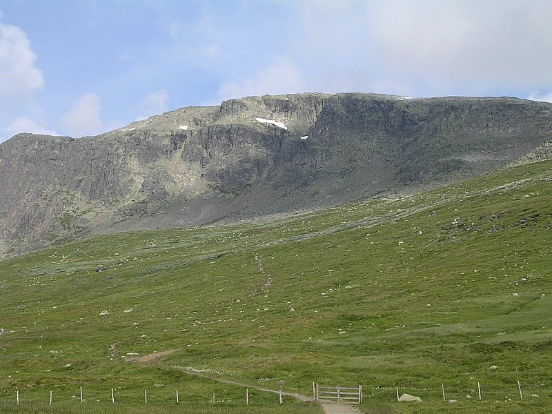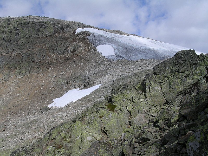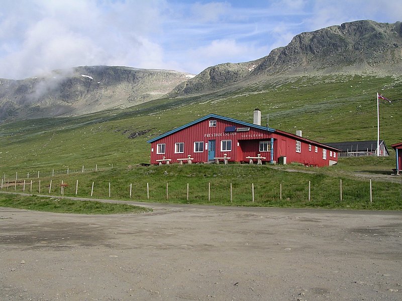 Za chatou sa chodník kľukatí trávnatou stráňou do štrbiny v útese. Po jej zdolaní treba prejsť (r.2006) zbytkom ľadovca a otvorí sa pohľad na zvlnenú plochu posiatu balvanmi. Hore život akoby ani neexistoval. Iba skaly, občas snehové či ľadovcové pole, žiadna vegetácia, okrem zelených lišajníkov, a len občas preletí zatúlaná mucha alebo nejaký vrabec. Po asi 2 hodinách chôdze cez hromady kameňov sa uprostred skalného poľa objaví kamenná pyramída označujúca Prestholtskarvet.