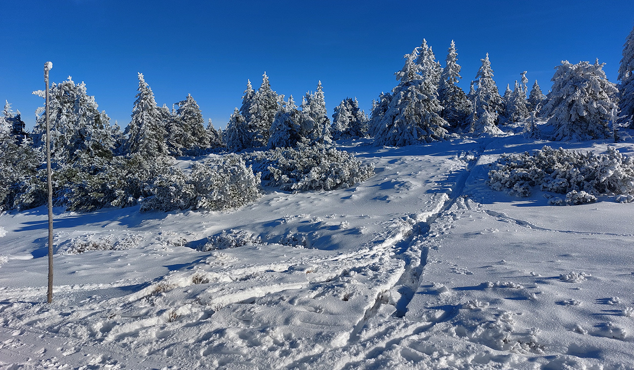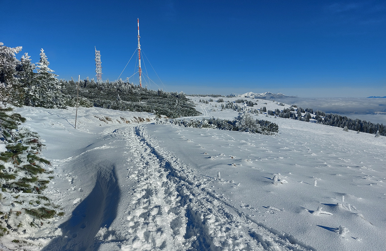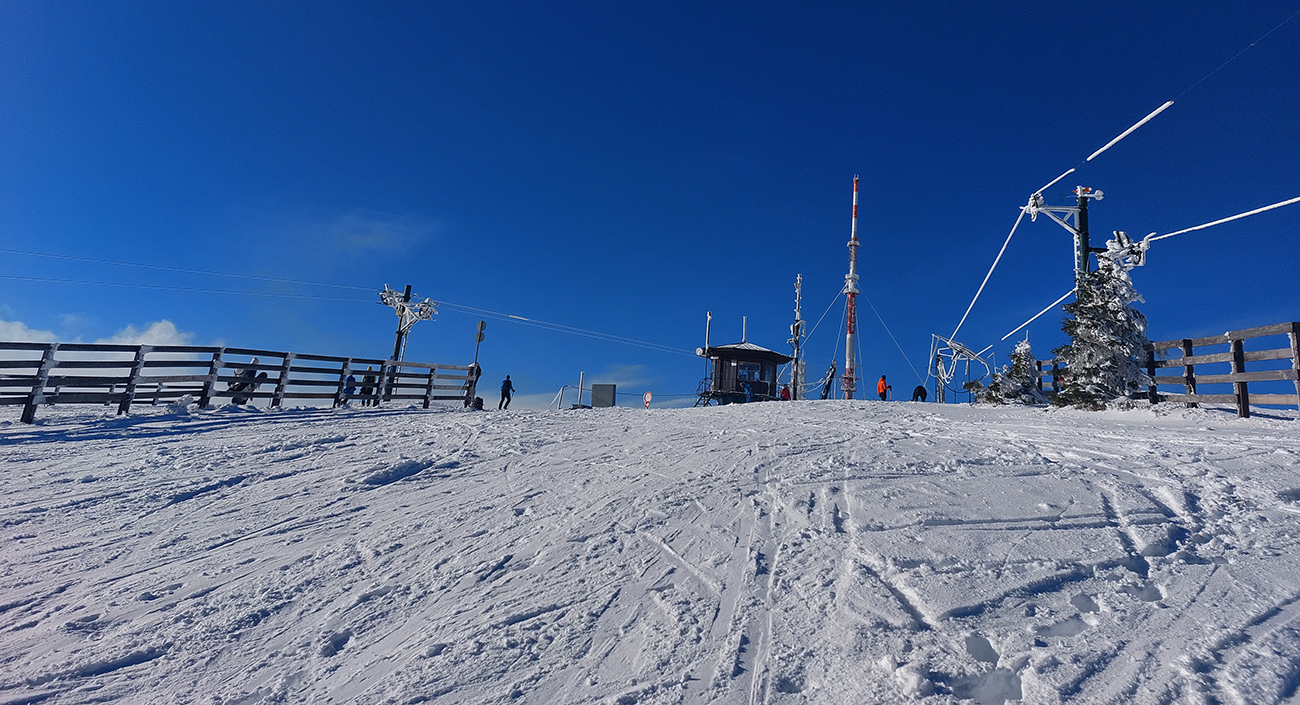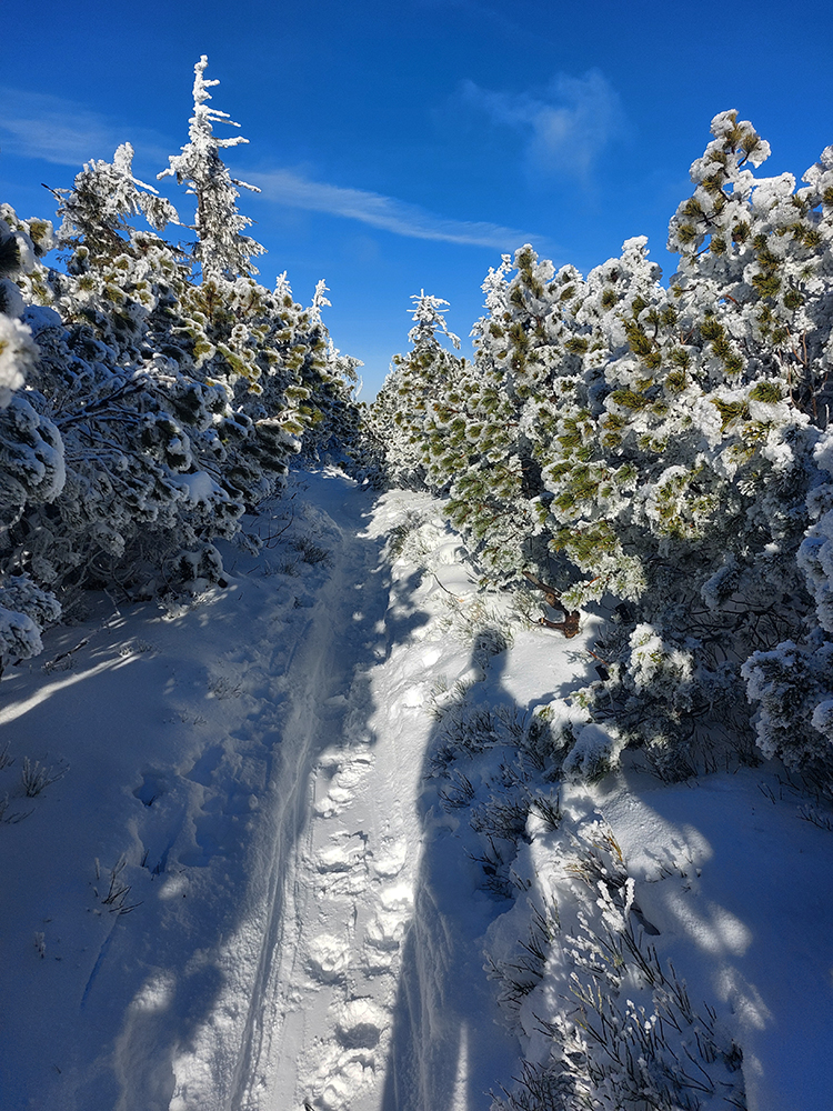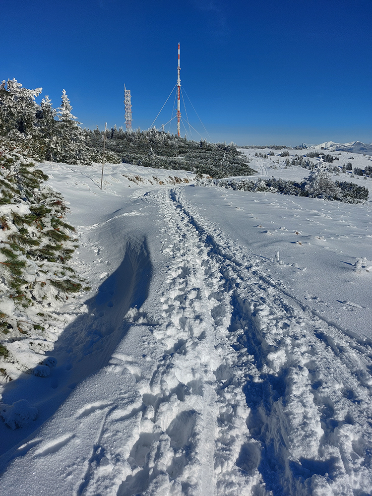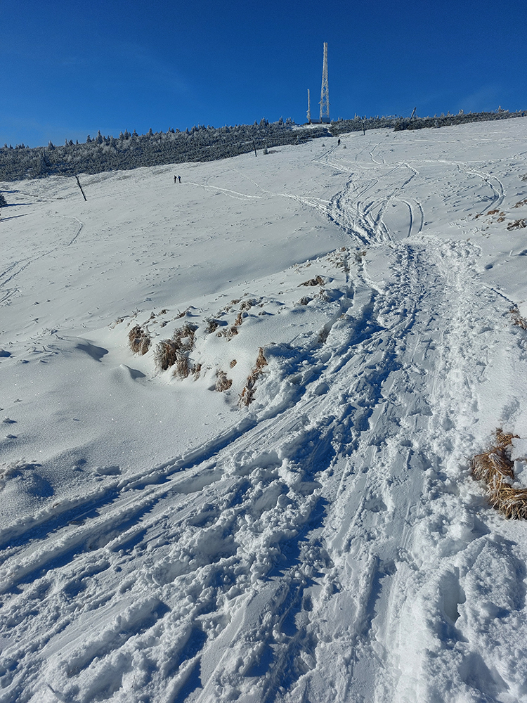 Hrebeňofka síce bez základu, ale jamy zafúkané a stopa uťapkaná na lúkach za vysielačom. Aj smerom k „Céčku“, ale tam kľučkujúc pomedzi jafury. V kosodrevinových tuneloch na Krížave sa ešte treba dobre uhýbať, ale zatiaľ málo zohýbať, popri plote vysielača je to komfortnejšie smerom k rotunde – na druhú stranu je to užšie.