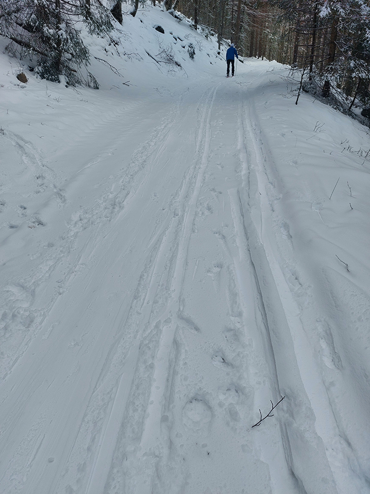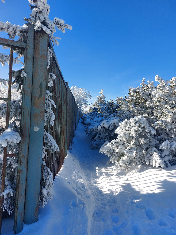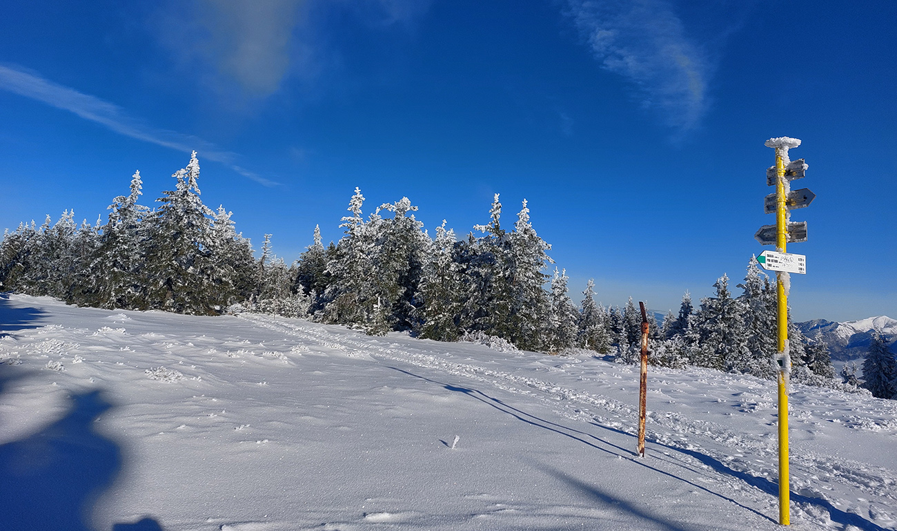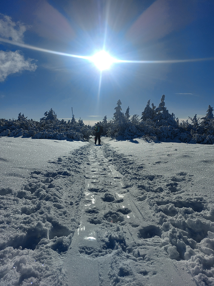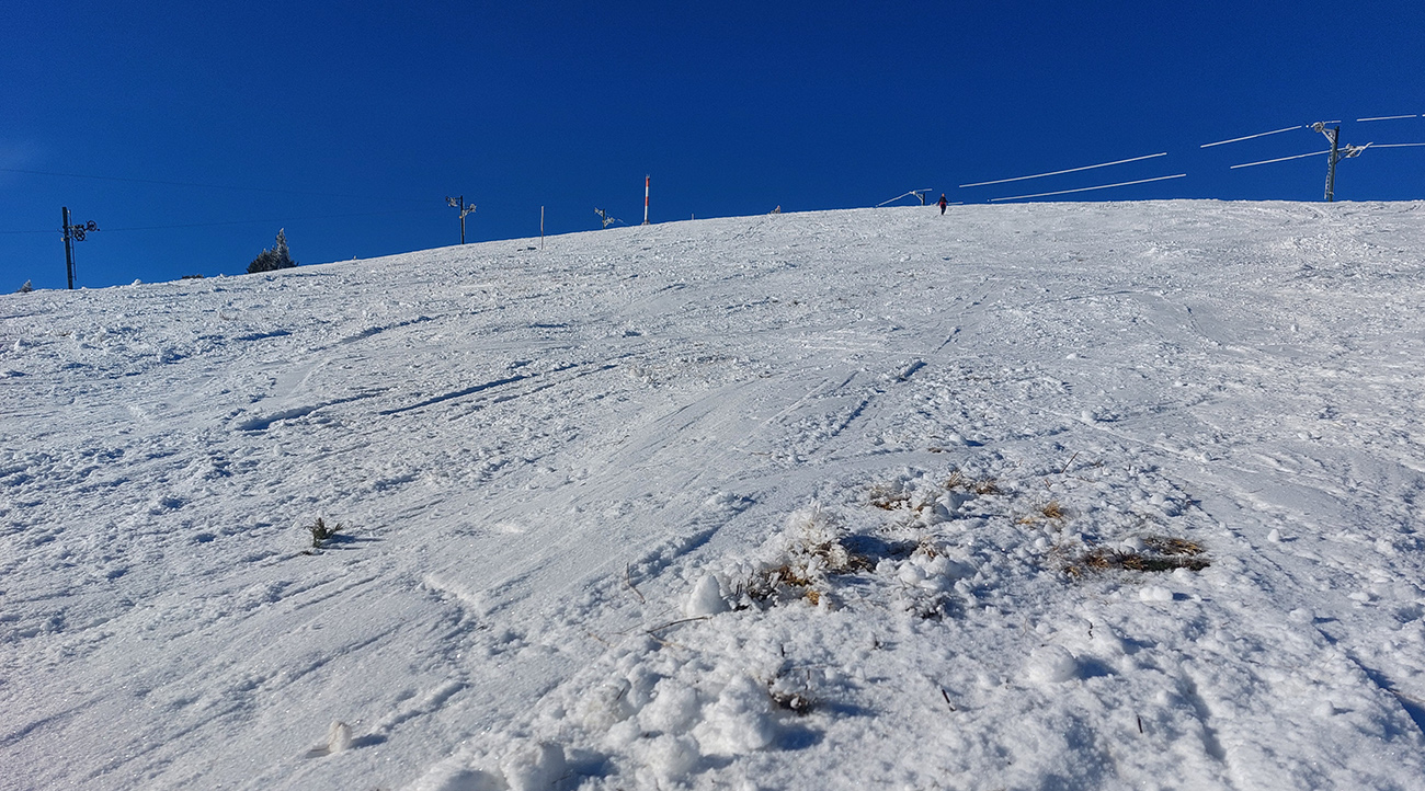 Hrebeňofka síce bez základu, ale jamy zafúkané a stopa uťapkaná na lúkach za vysielačom. Aj smerom k „Céčku“, ale tam kľučkujúc pomedzi jafury. V kosodrevinových tuneloch na Krížave sa ešte treba dobre uhýbať, ale zatiaľ málo zohýbať, popri plote vysielača je to komfortnejšie smerom k rotunde – na druhú stranu je to užšie.