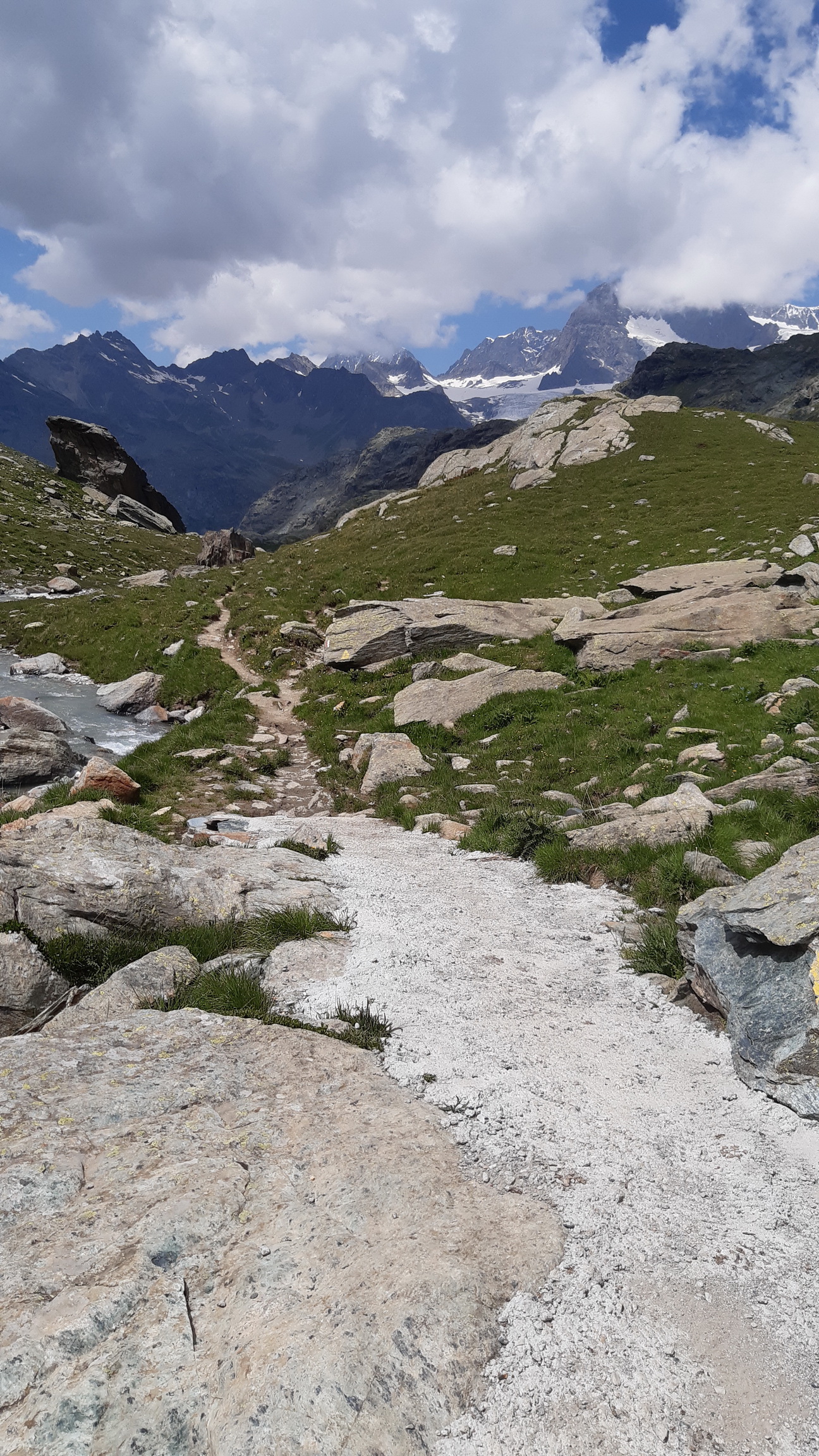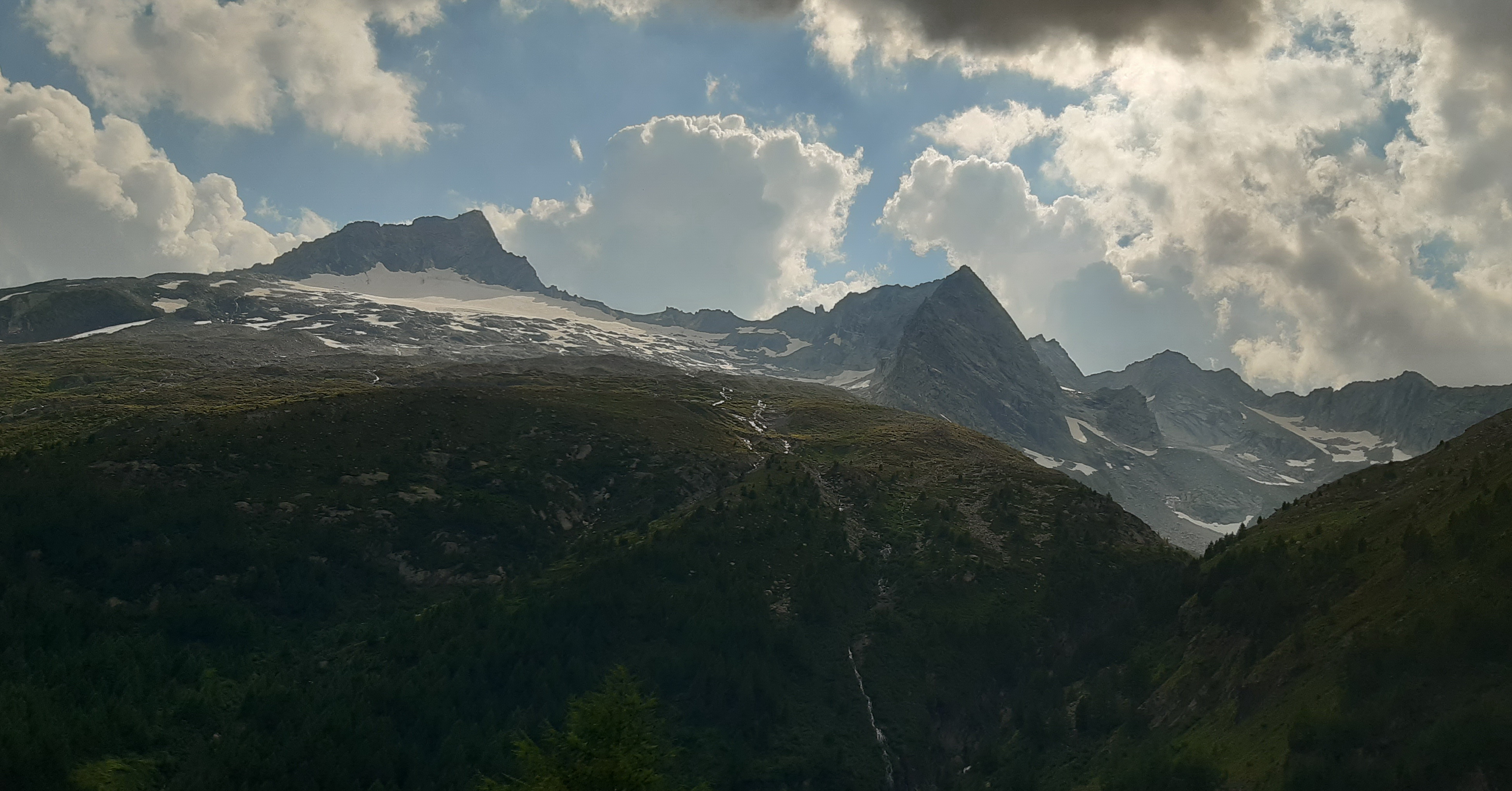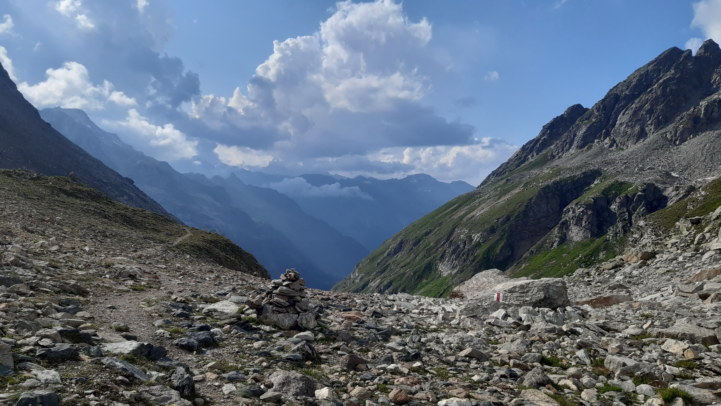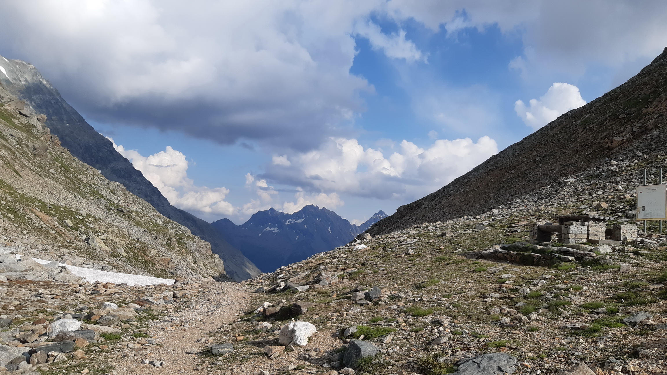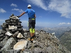 Passo Muretto 2559m. Hranica Talianska so Švajčiarskom. Tadiaľto počas druhej sv. vojny utekali ľudia za slobodou do švajcu... V závere tlačím a začínajú sa ozývať moje staré chronické priedušky. Nemám sprej proti astme ako Frume. Kapacita pľúc prudko klesá ale to som už hore. 18:20 ukazujú hodinky a ja robím jedinú samojebku dňa. Rozmýšlam kde som spravil chybu. Chcelo to isto jeden sáčok ionťáku naviac do tej horúčavy, z Val Rosegu z výšky 2000m. som ju nečakal až takú intenzívnu...