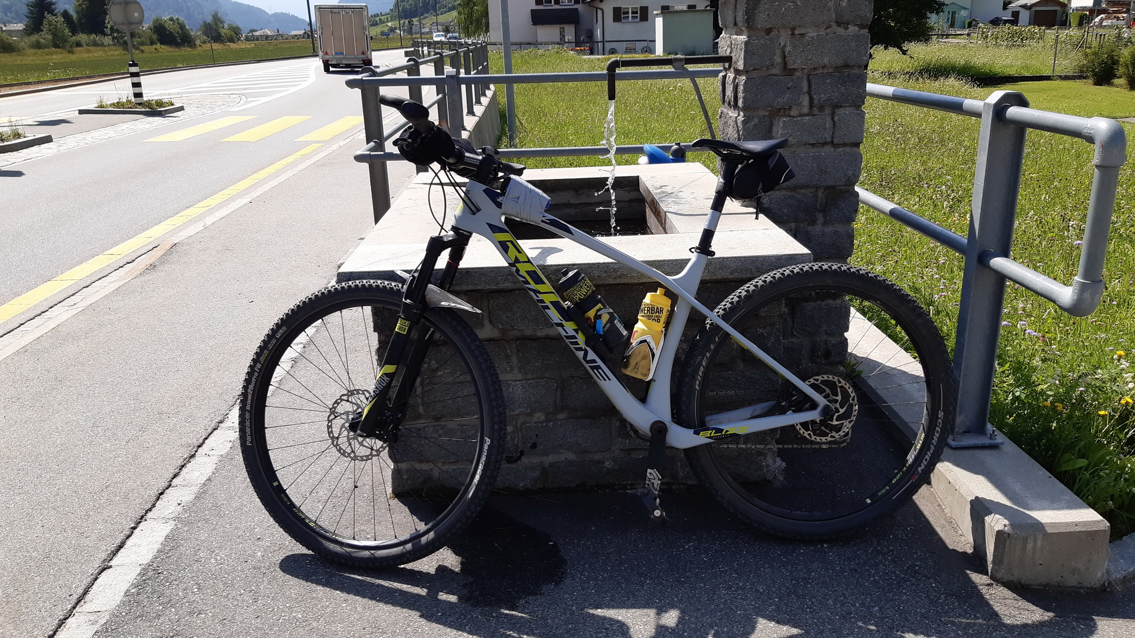 Odtiaľto už sa dá ku jazeru Cavloc aj trošku zviezť ale zďaleka nie všetko. Až pri jazere si vydýchnem a zvyšok zjazdu už prefrčím do Maloje za pár minút. Tam zastanem pri vode. Ach tie napájadlá na každom rohu, o koľko je v tomto Slovensko pozadu oproti Alpám...