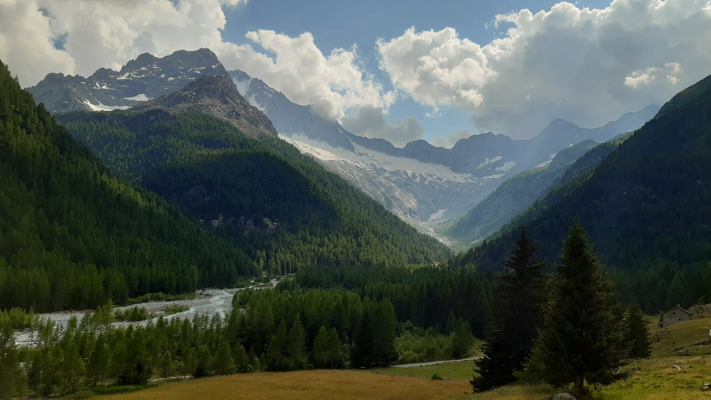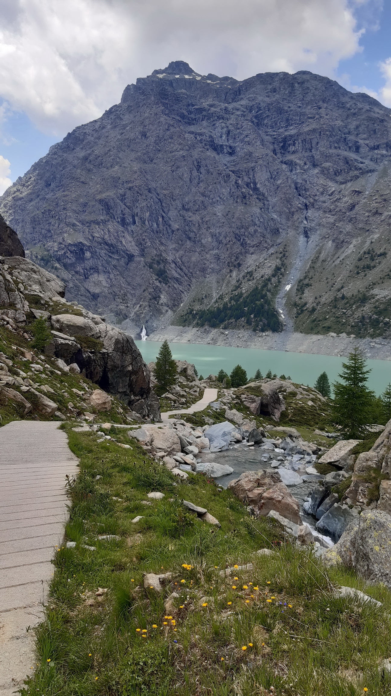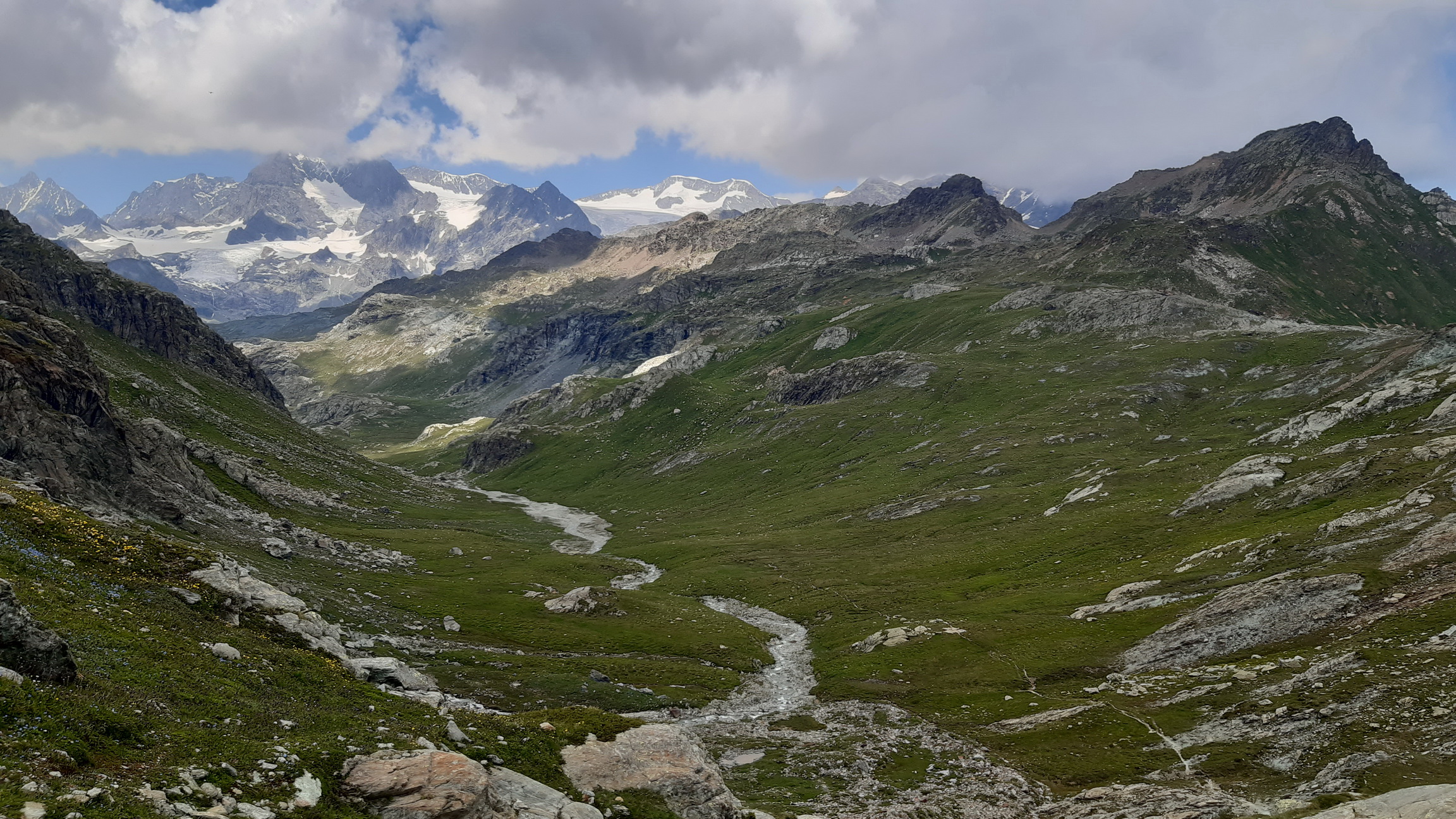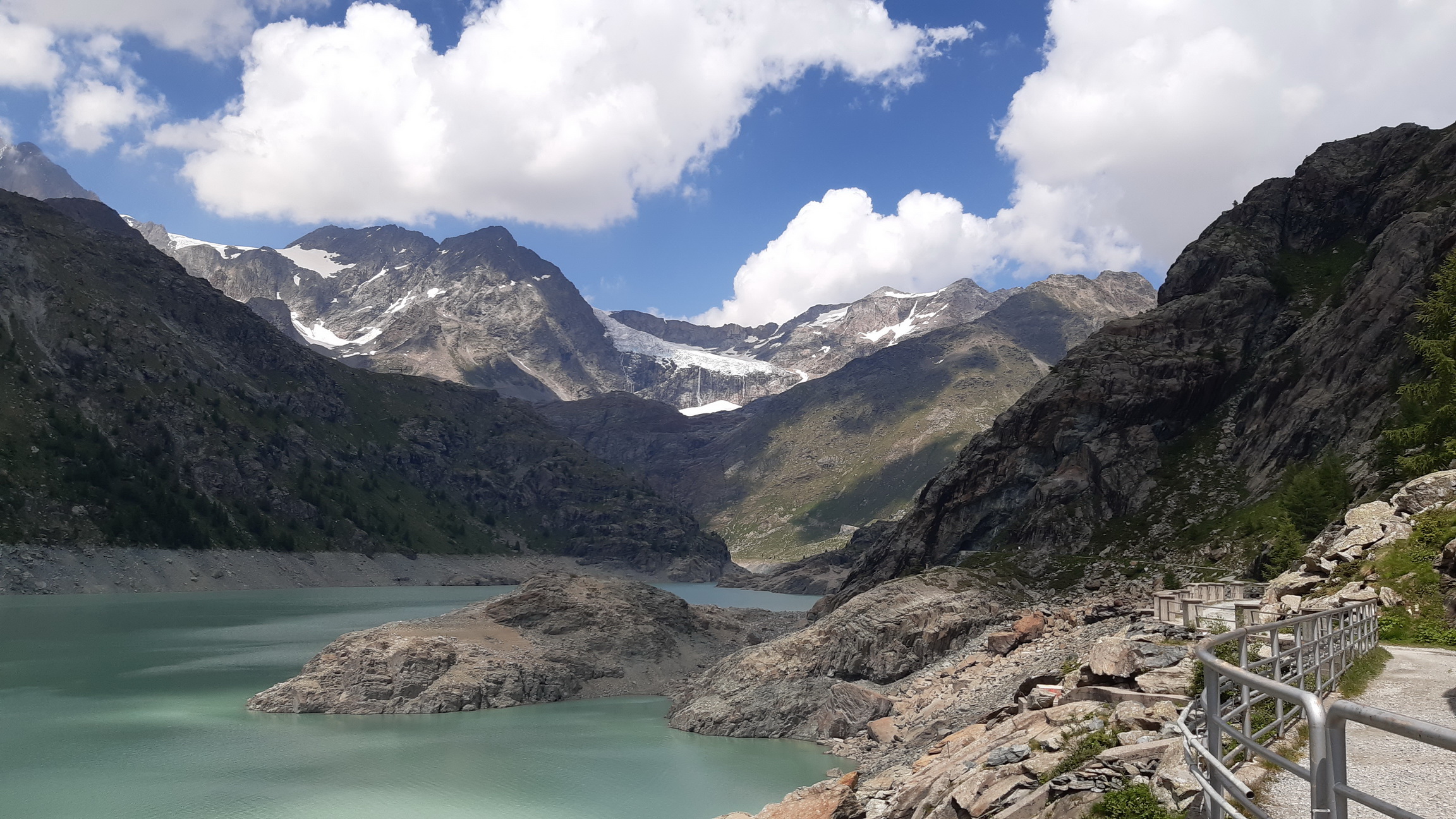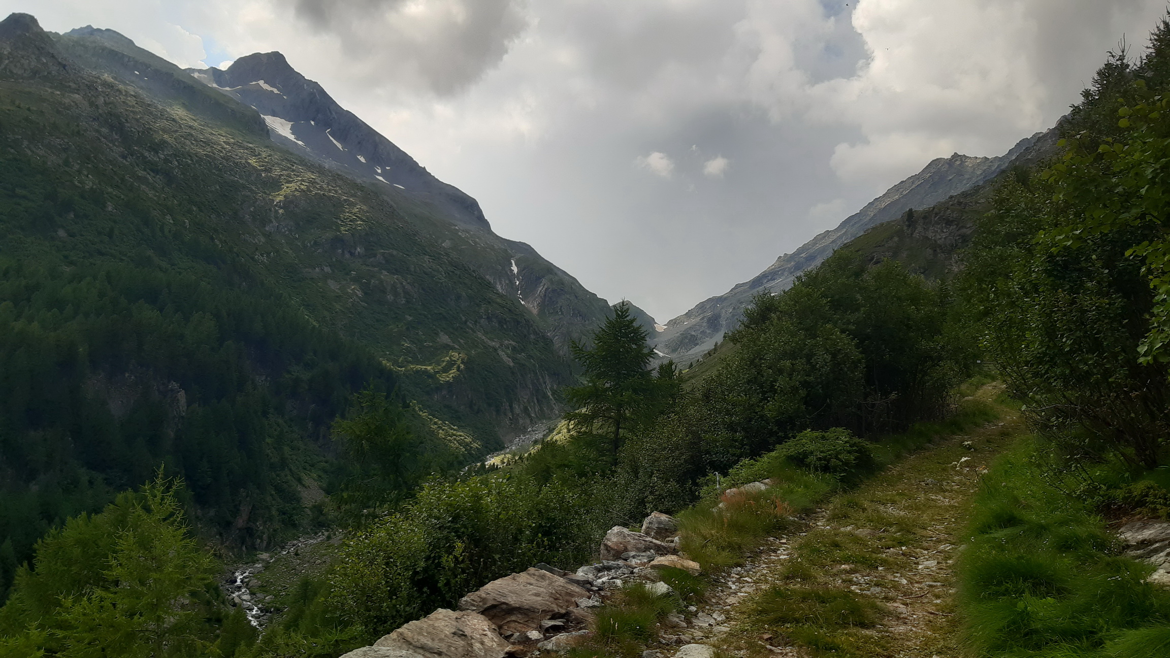 Zo sedla idem podľa plánu dole Val Poschiavinou. Pri prieskume som ňou vytlačil bajk hore a mal som pocit, že dole by to šlo. Nuž trochu som sa sekol. Nato, že idem dole kopcom tak oveľa viac idem popri bajku ako na ňom. Časté sú úseky kde nasadnem na 20 metrov a kôli veľkým kameňom musím hneď zosadnúť. Je to veľmi náročné na techniku a na rozhodovanie kde to skúsiť prejsť a kde už nie.